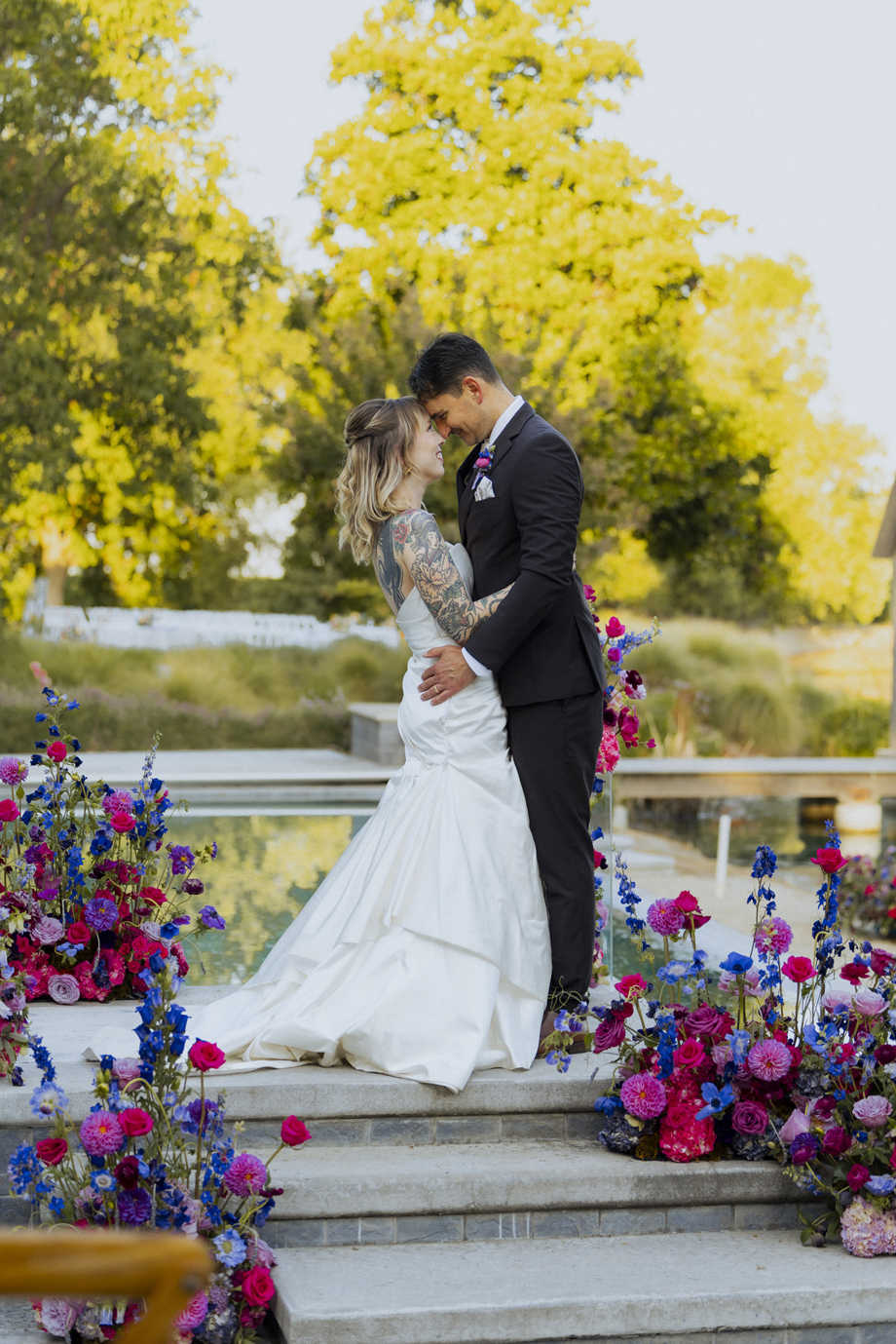 Sun-drenched gardens, old-world castle architecture, and the feeling of a private fairytale retreat set the tone for this romantic editorial at Castello di Macero in Davis. This bright and colorful styled shoot was brought to life by a team of talented local wedding professionals who have truly mastered their craft. Set on beautifully landscaped grounds, the castle-inspired estate offers a storybook backdrop where timeless architecture meets serene outdoor scenery—creating an atmosphere that feels both enchanting and welcoming.