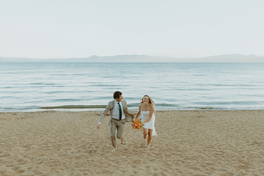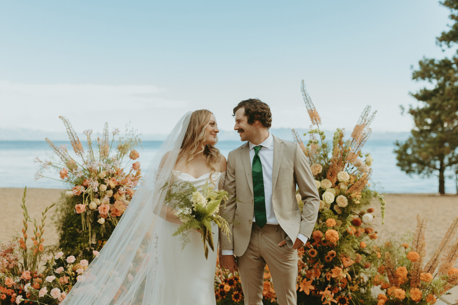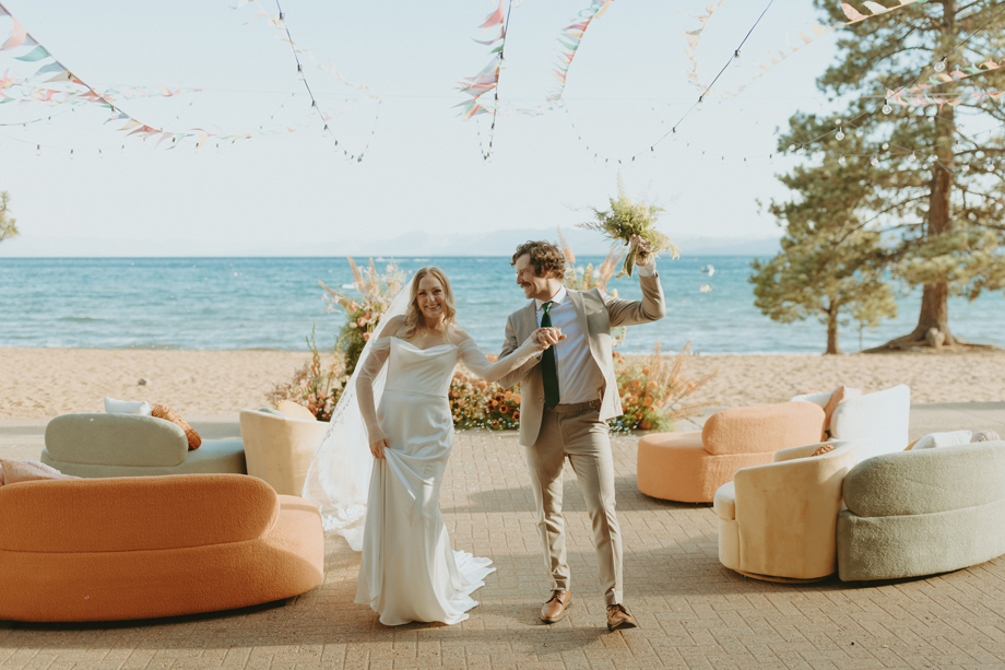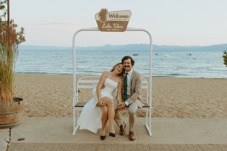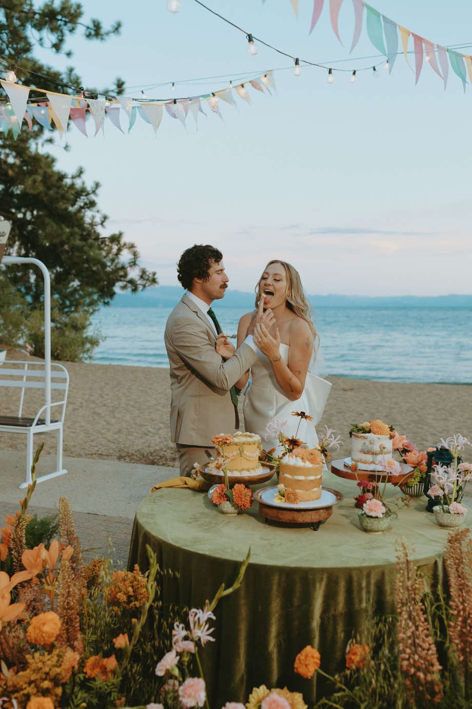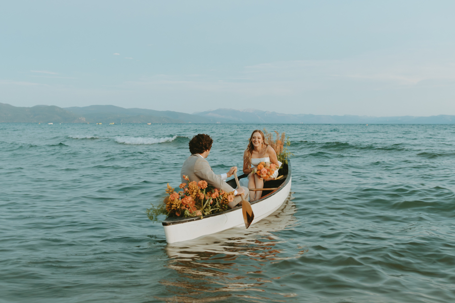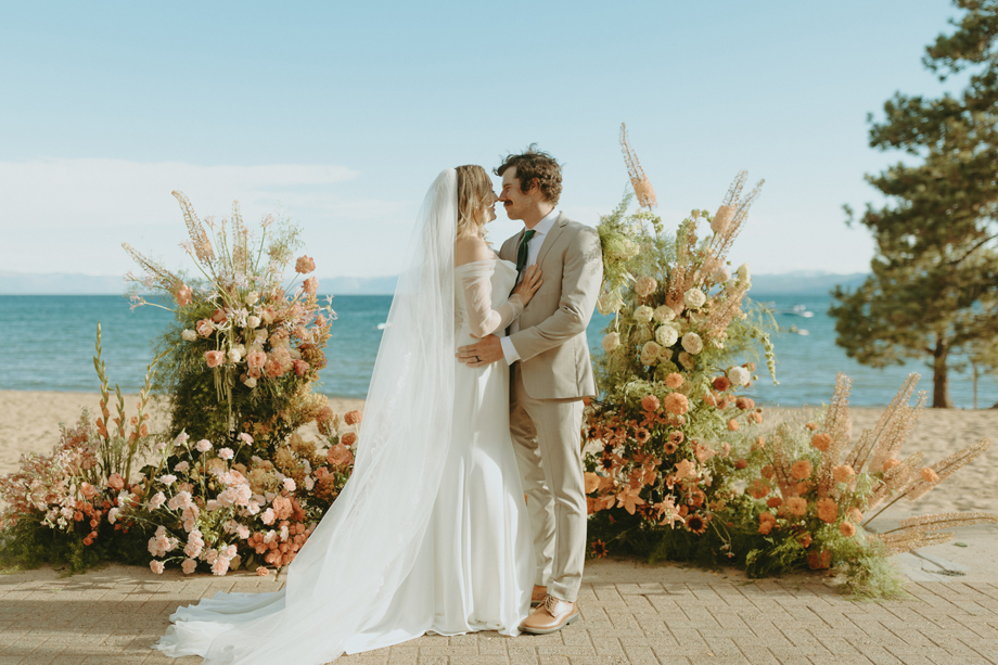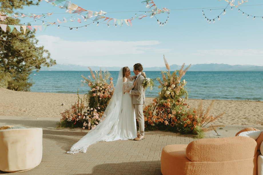 The ceremony let Lake Tahoe’s natural beauty lead while still feeling personal and intimate. Paper goods, rich fabrics, sculptural florals, and fashion-forward styling carried the story into cocktail hour and the reception, where candlelight and curated tablescapes warmed the cool alpine air—editorial yet inviting, elevated but never too serious.