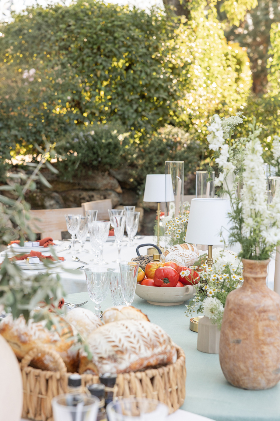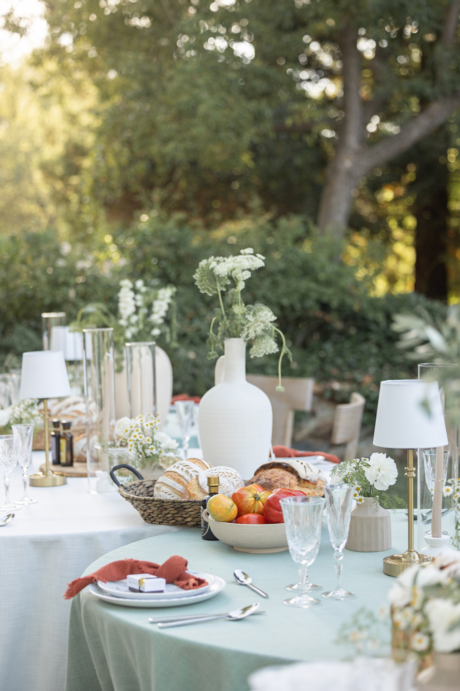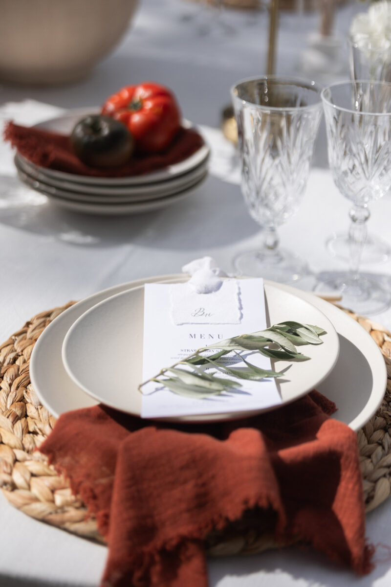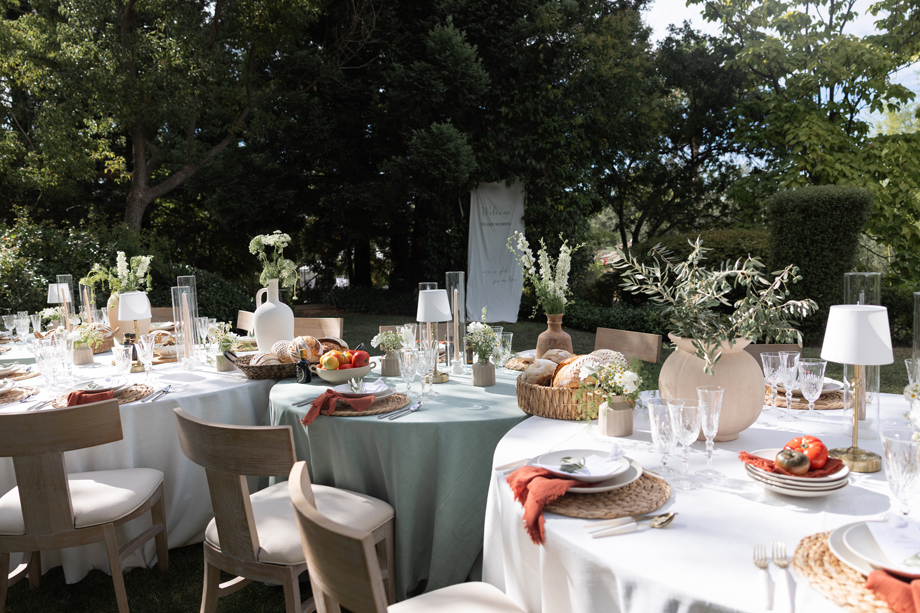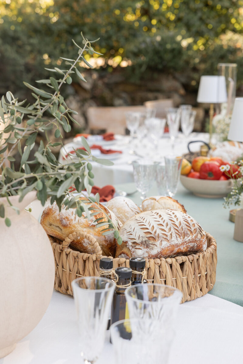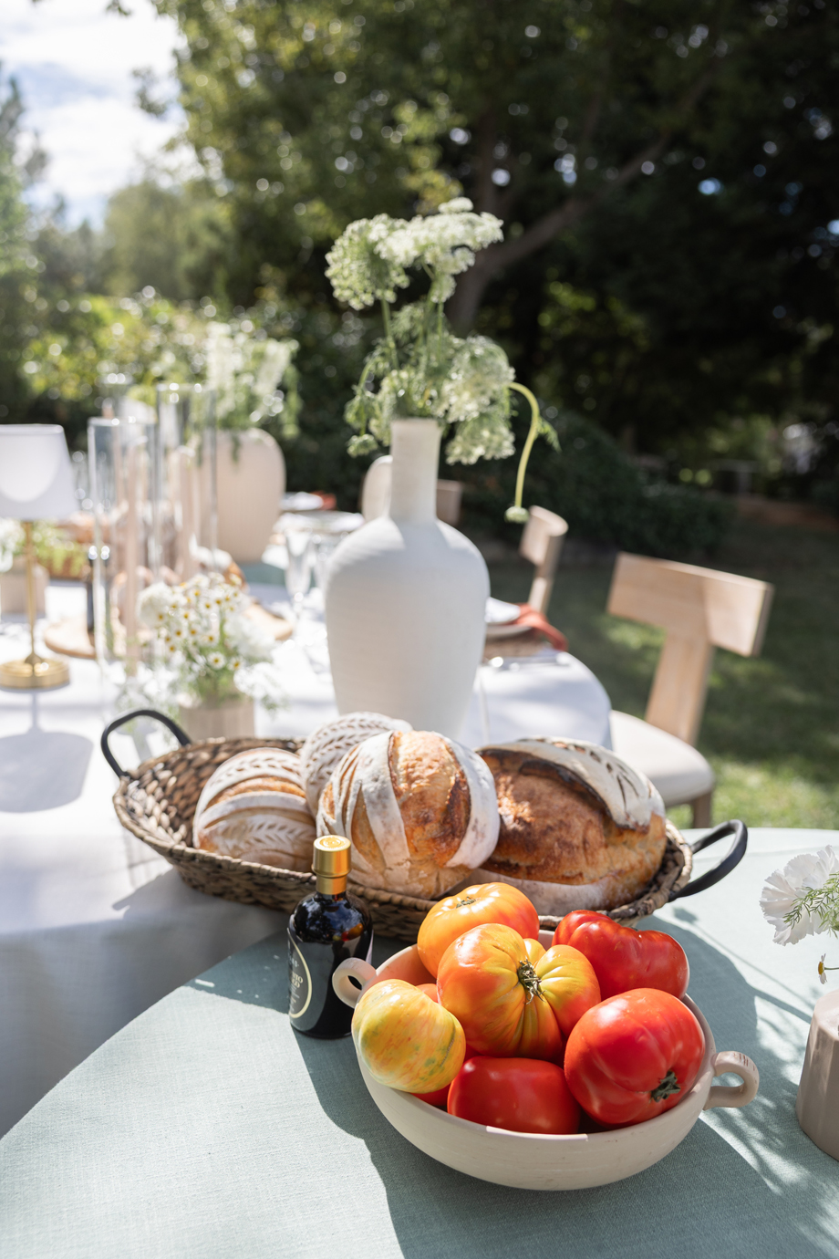 Golden hour light filters through the trees, a long table is set beneath the garden canopy, and the air carries the scent of fresh herbs, warm bread, sun-ripened tomatoes and locally-sourced and produced olive oil. This “Organic European Summer–inspired” styled shoot captures the magic of an alfresco celebration where the simple pleasures—good food, good wine, and great company—take center stage. 🍅🥖✨