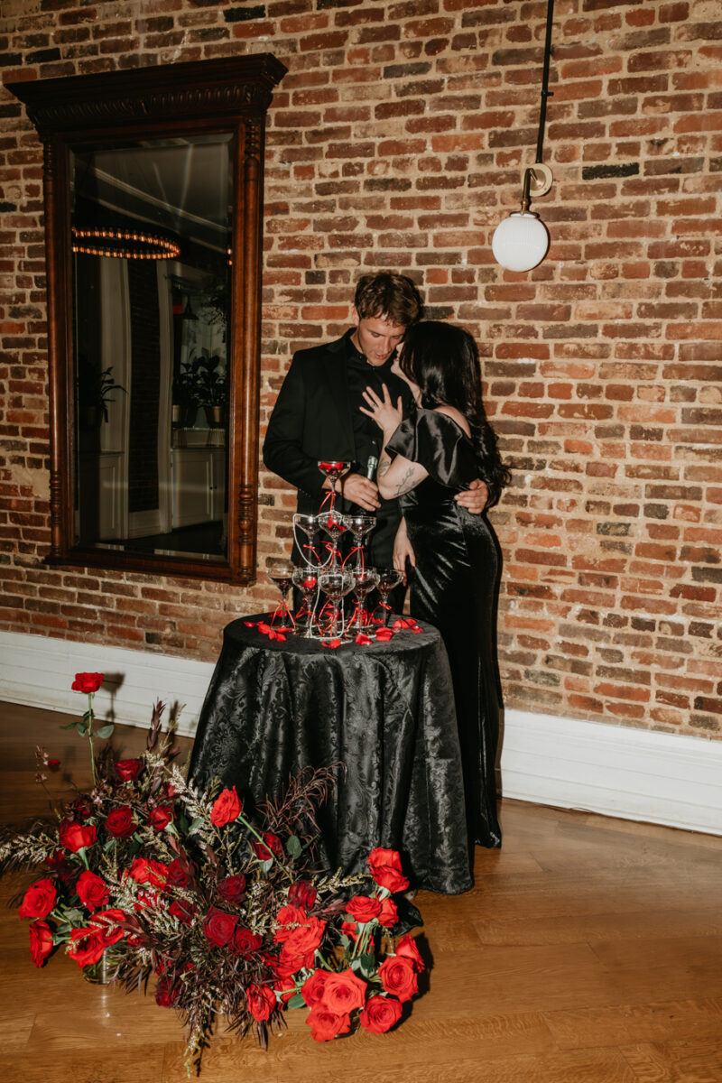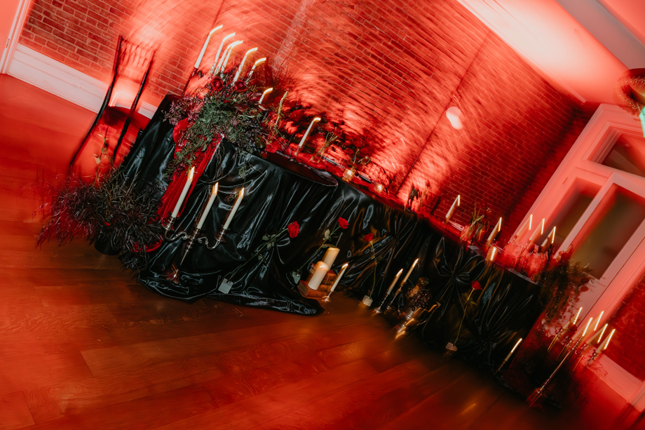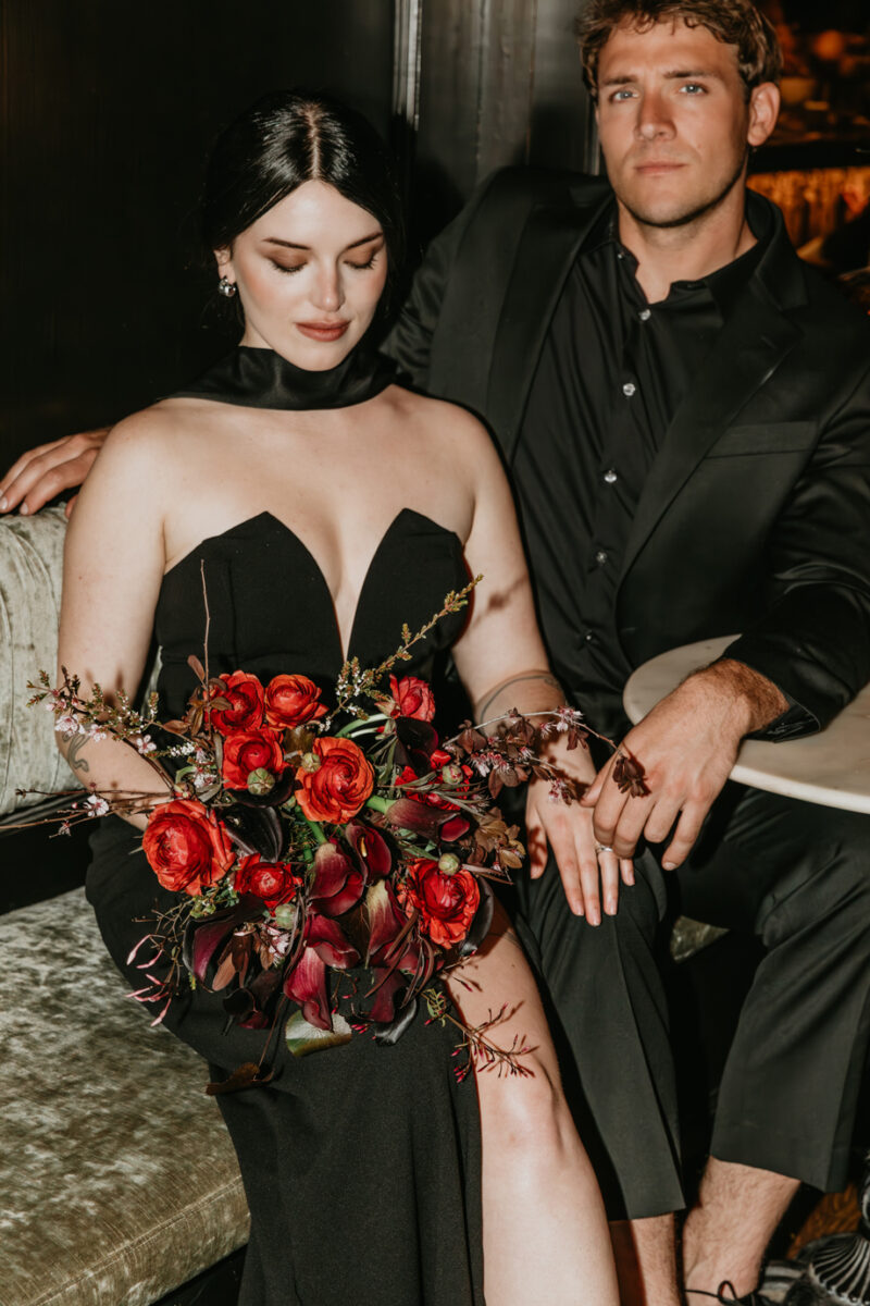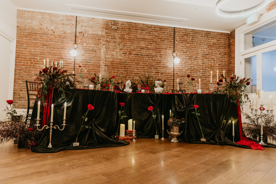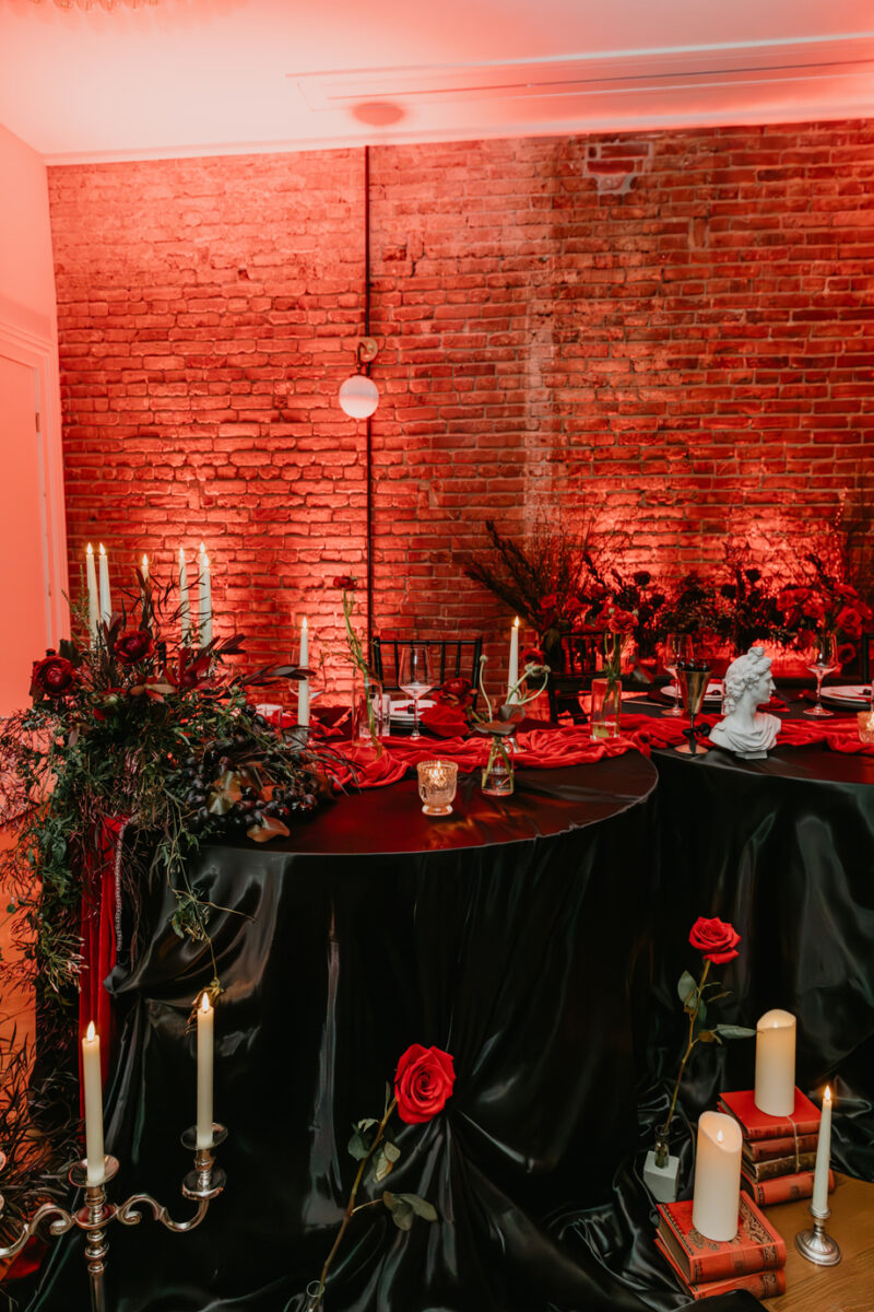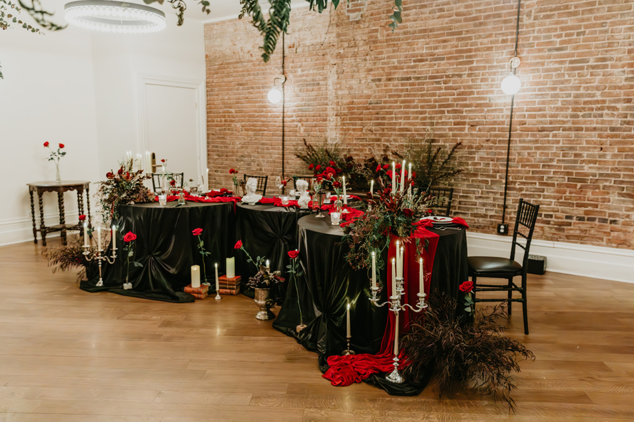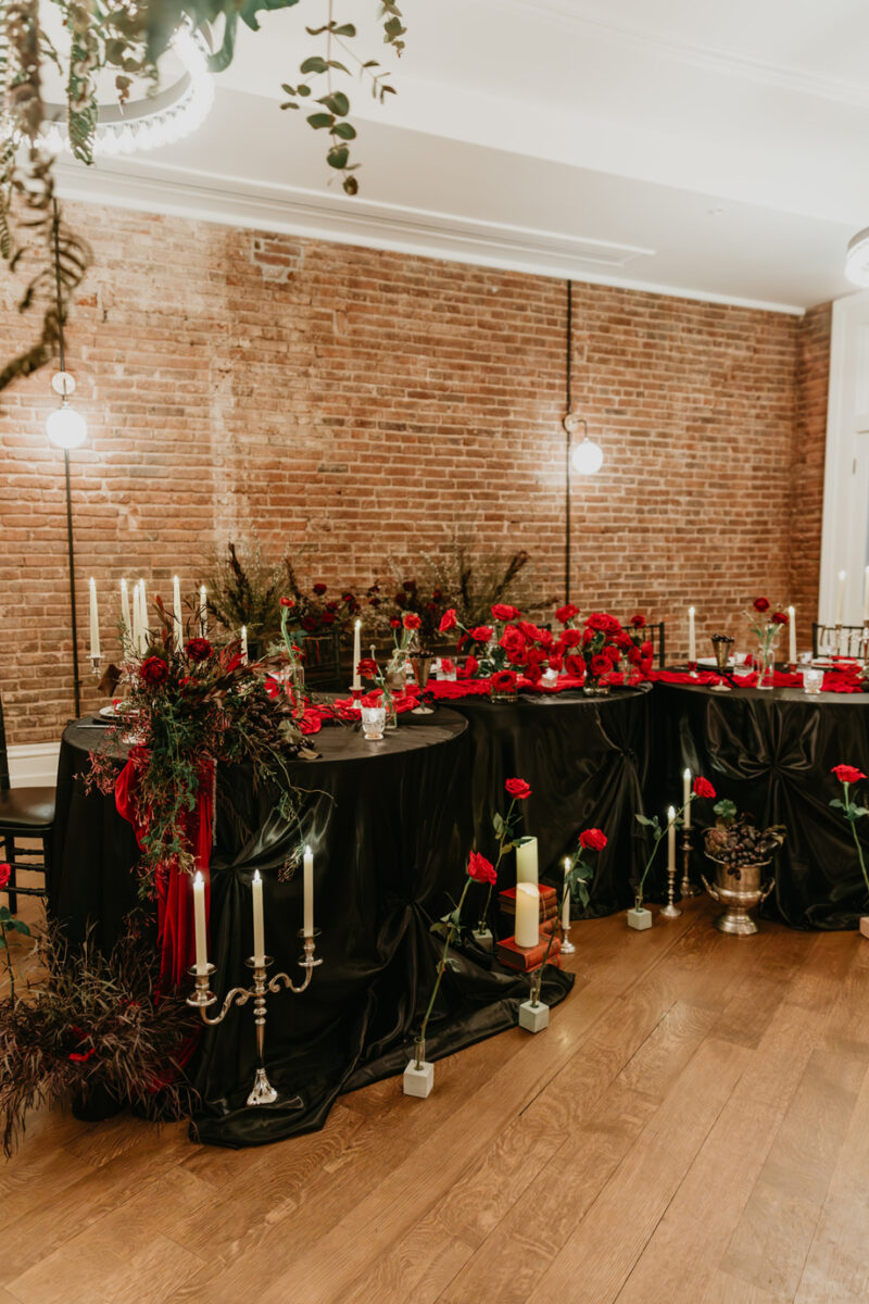 Inspired by the idea that love stories don’t have to follow tradition, the talented creative team of local wedding professionals designed a scene that celebrates individuality and unapologetic romance. Rich red florals cascade across candlelit tables, black attire adds striking sophistication, and the warm glow of the hotel’s historic interiors creates an atmosphere that feels equal parts mysterious and refined. The result? A “Till Death Do Us Part” moment that is as edgy as it is elegant.