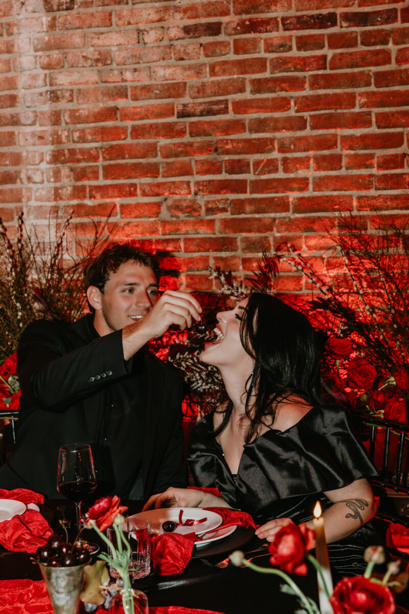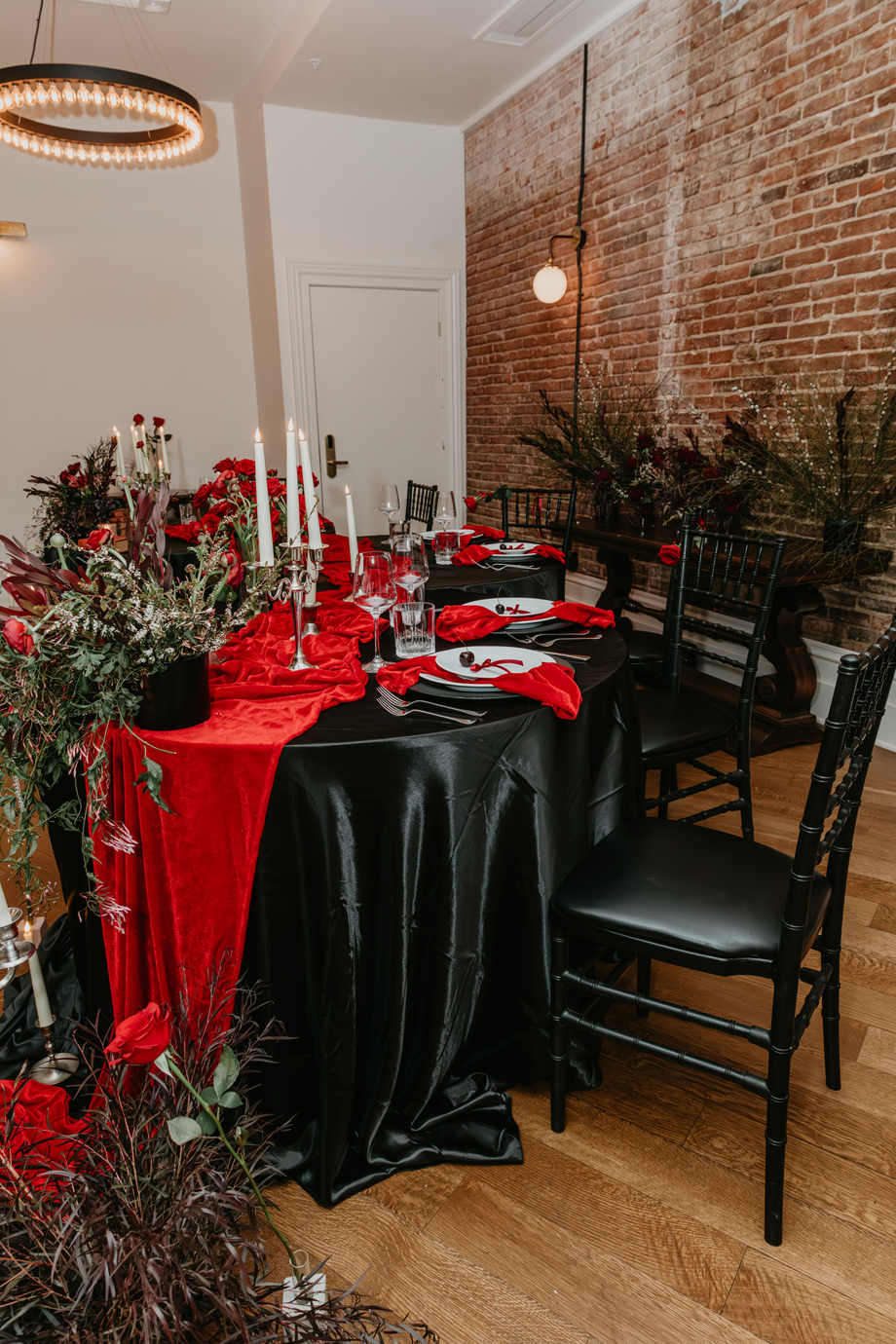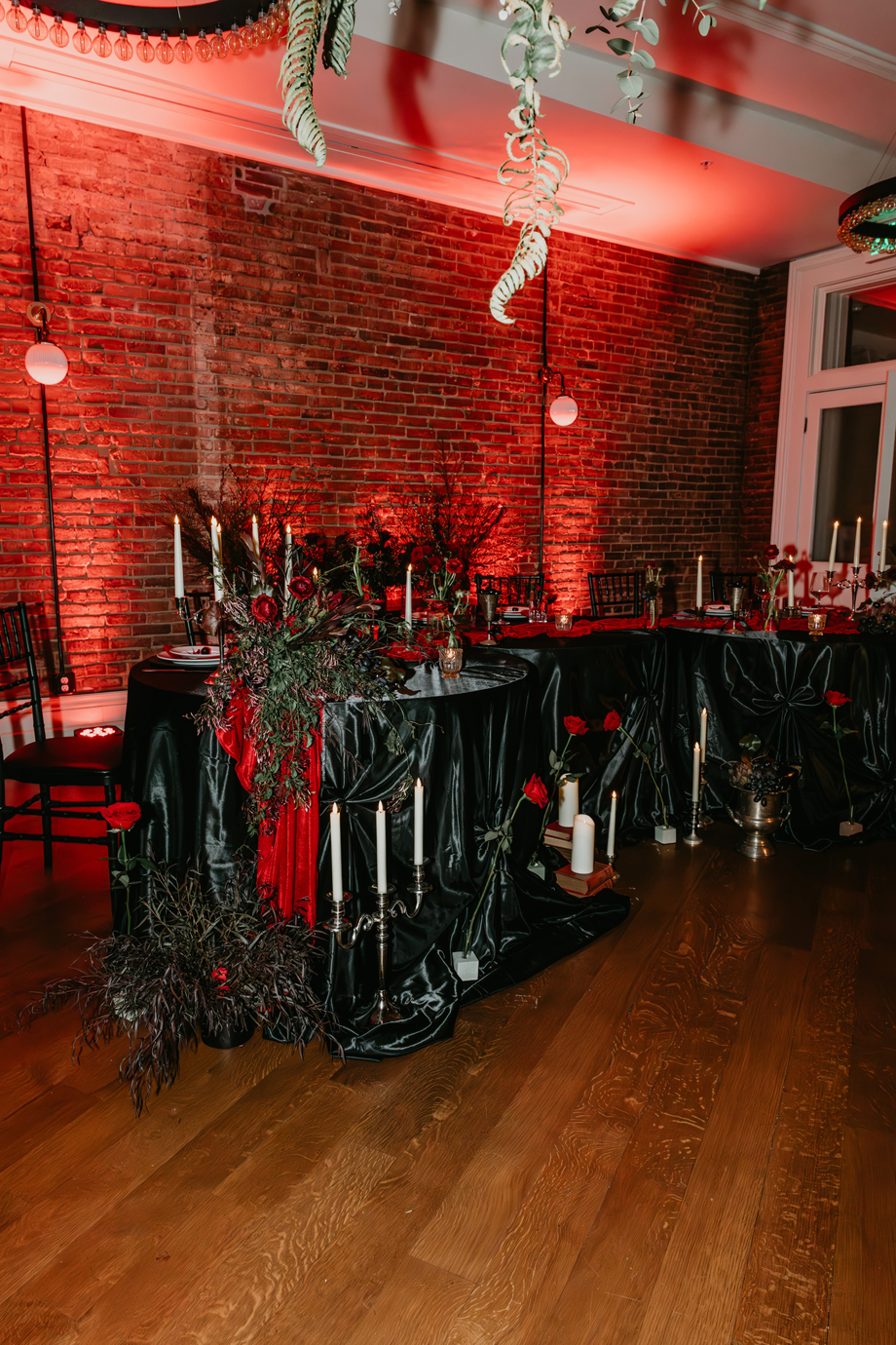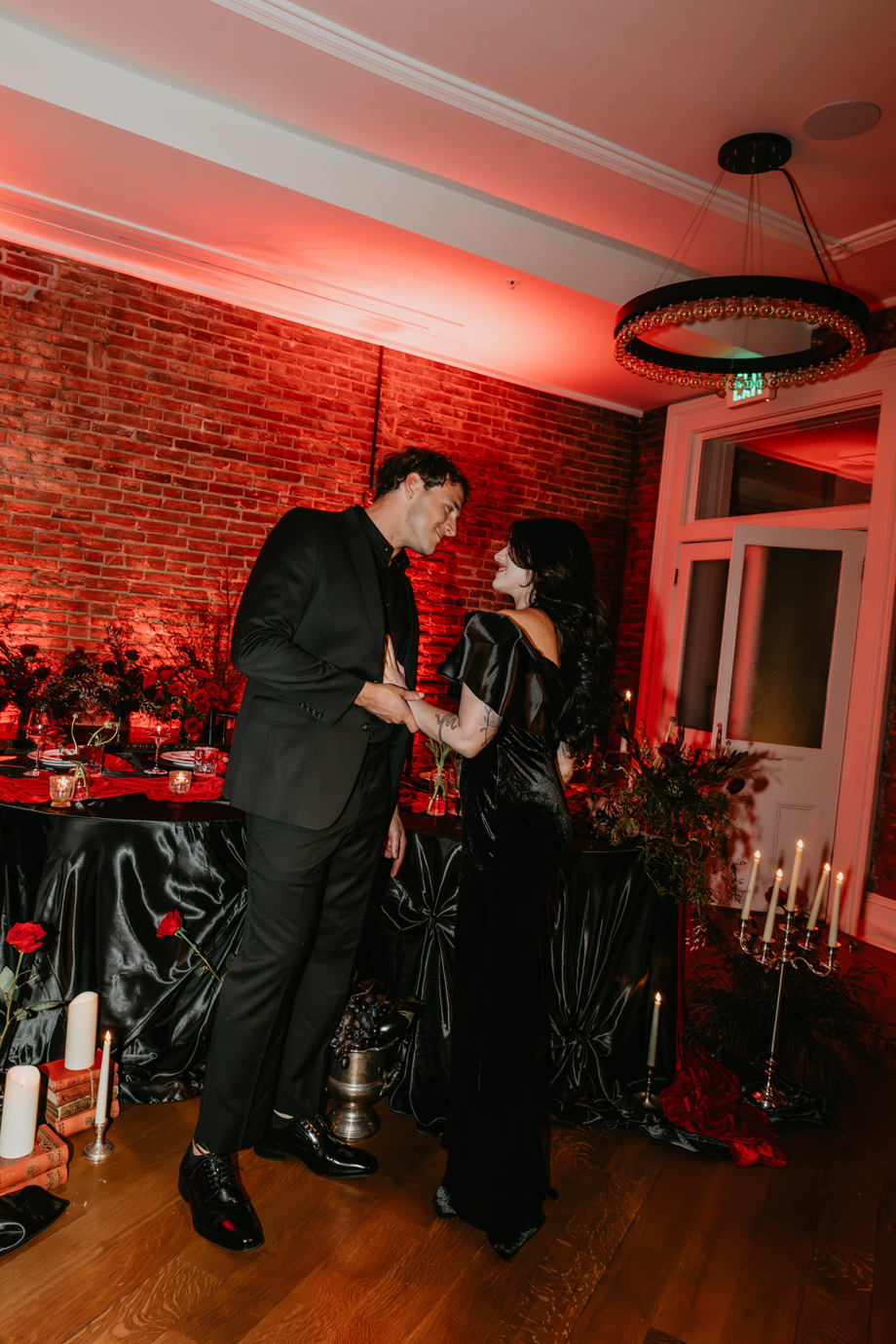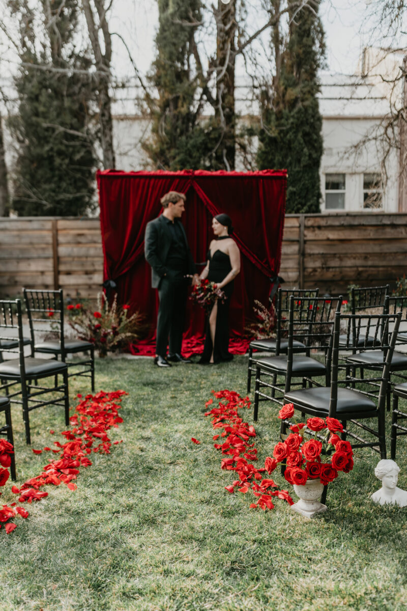 Inspired by the idea that love stories don’t have to follow tradition, the talented creative team of local wedding professionals designed a scene that celebrates individuality and unapologetic romance. Rich red florals cascade across candlelit tables, black attire adds striking sophistication, and the warm glow of the hotel’s historic interiors creates an atmosphere that feels equal parts mysterious and refined. The result? A “Till Death Do Us Part” moment that is as edgy as it is elegant.
