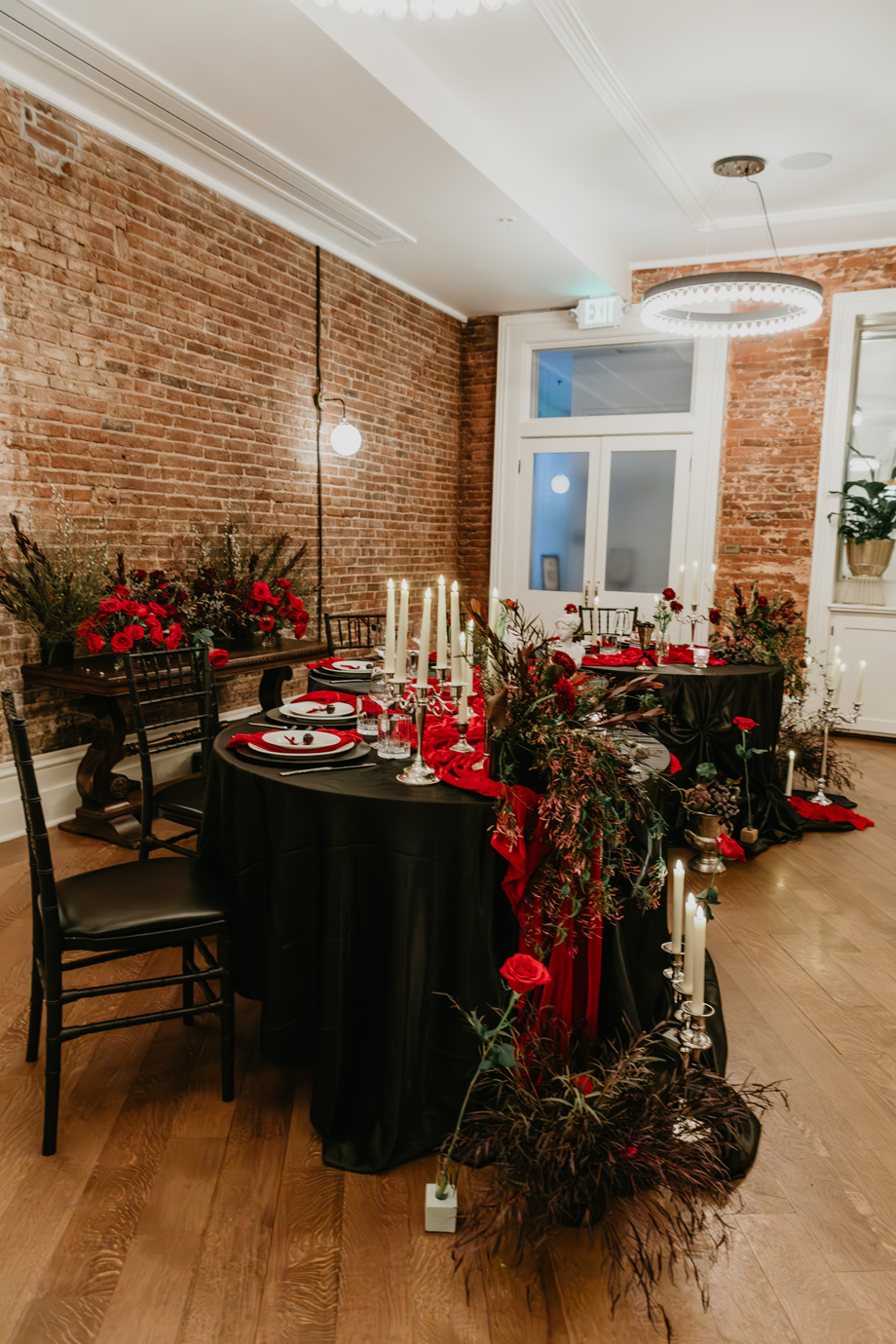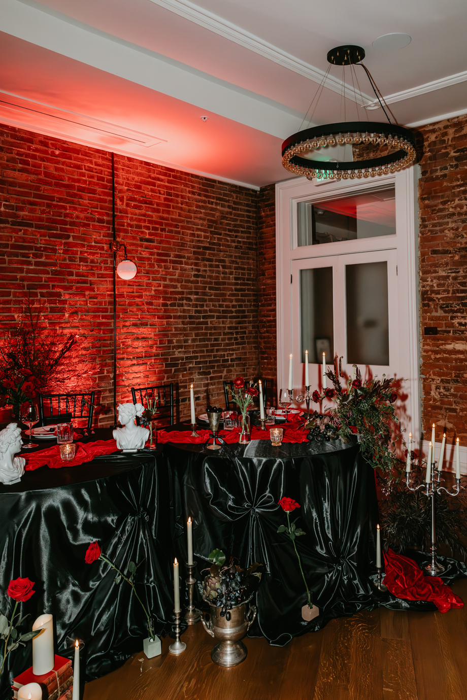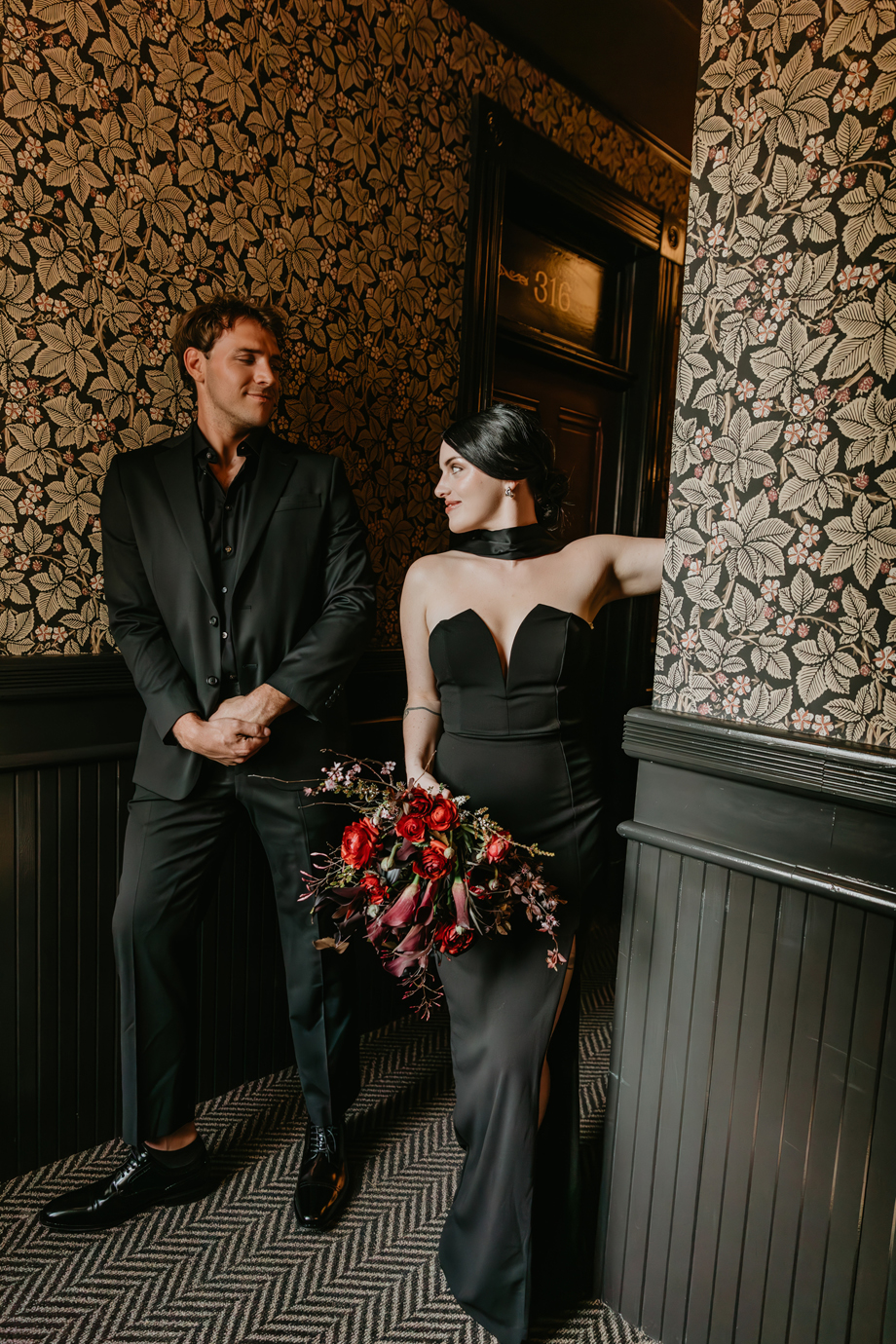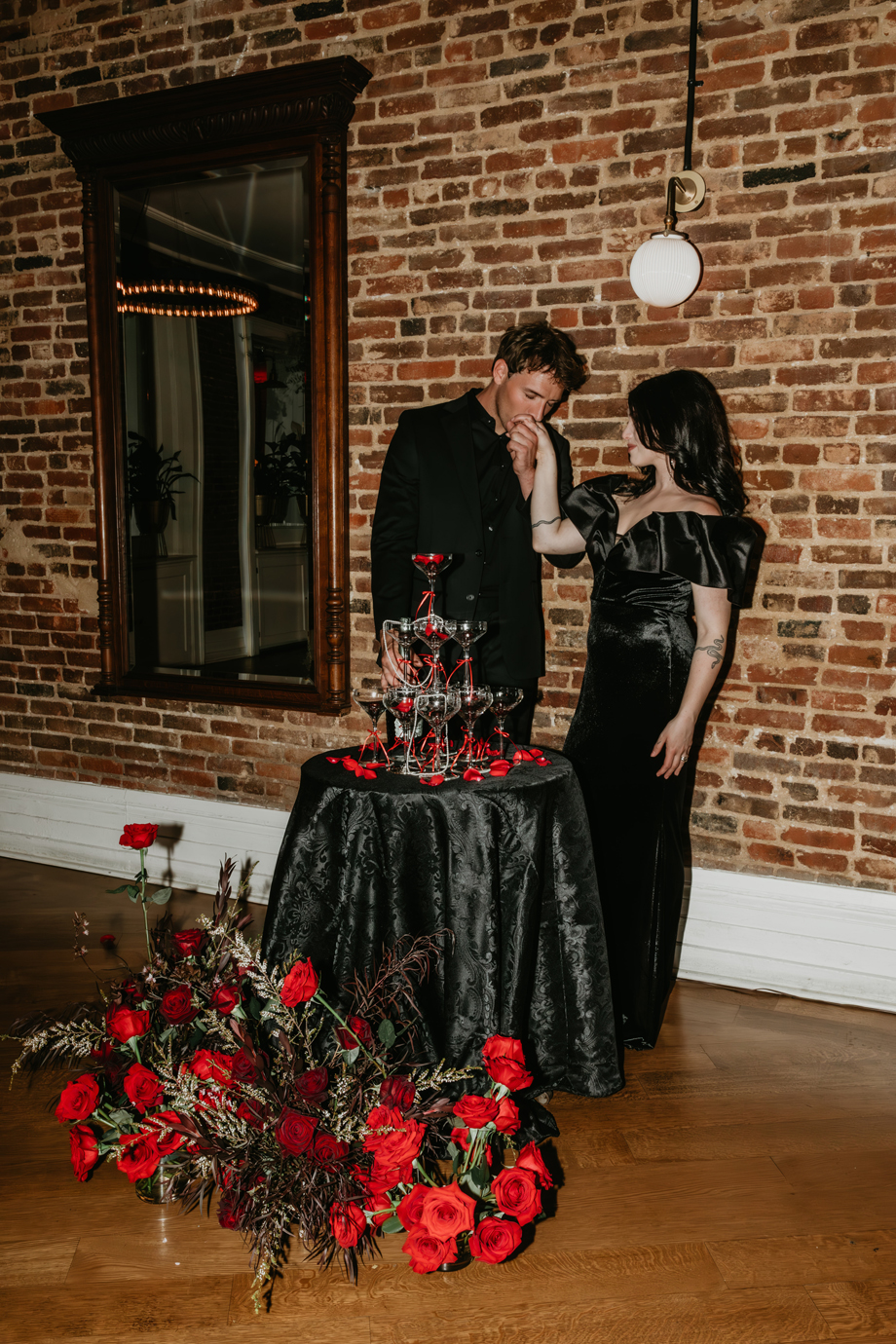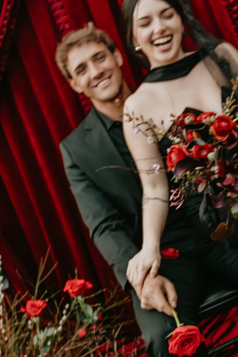 Inspired by the idea that love stories don’t have to follow tradition, the talented creative team of local wedding professionals designed a scene that celebrates individuality and unapologetic romance. Rich red florals cascade across candlelit tables, black attire adds striking sophistication, and the warm glow of the hotel’s historic interiors creates an atmosphere that feels equal parts mysterious and refined. The result? A “Till Death Do Us Part” moment that is as edgy as it is elegant.