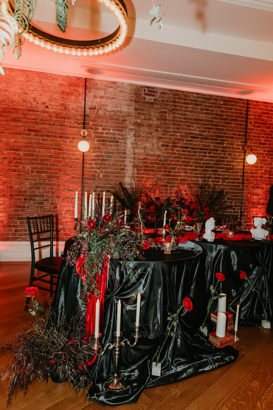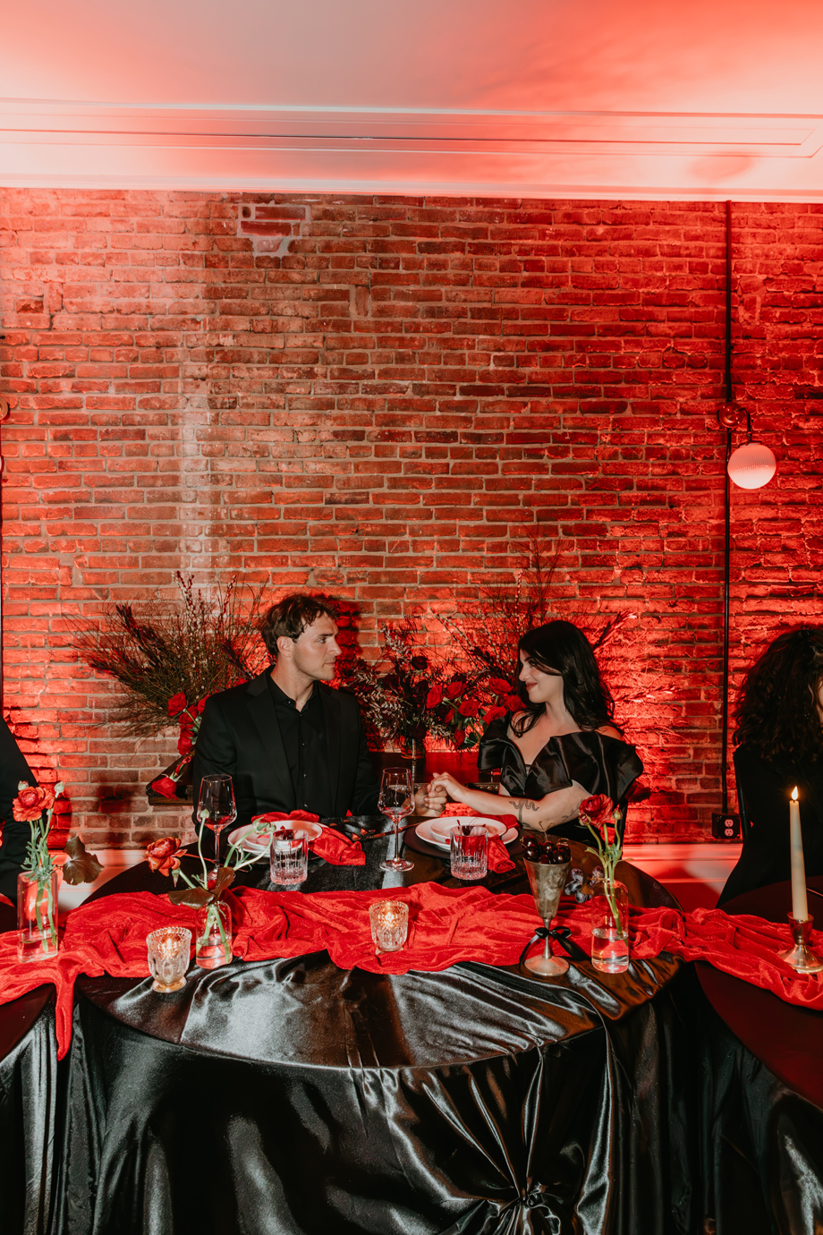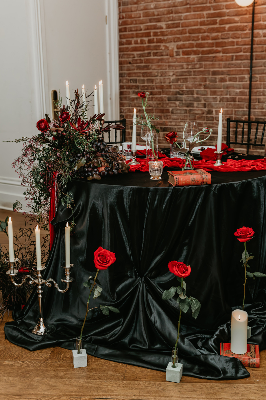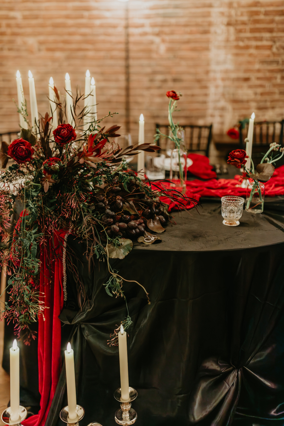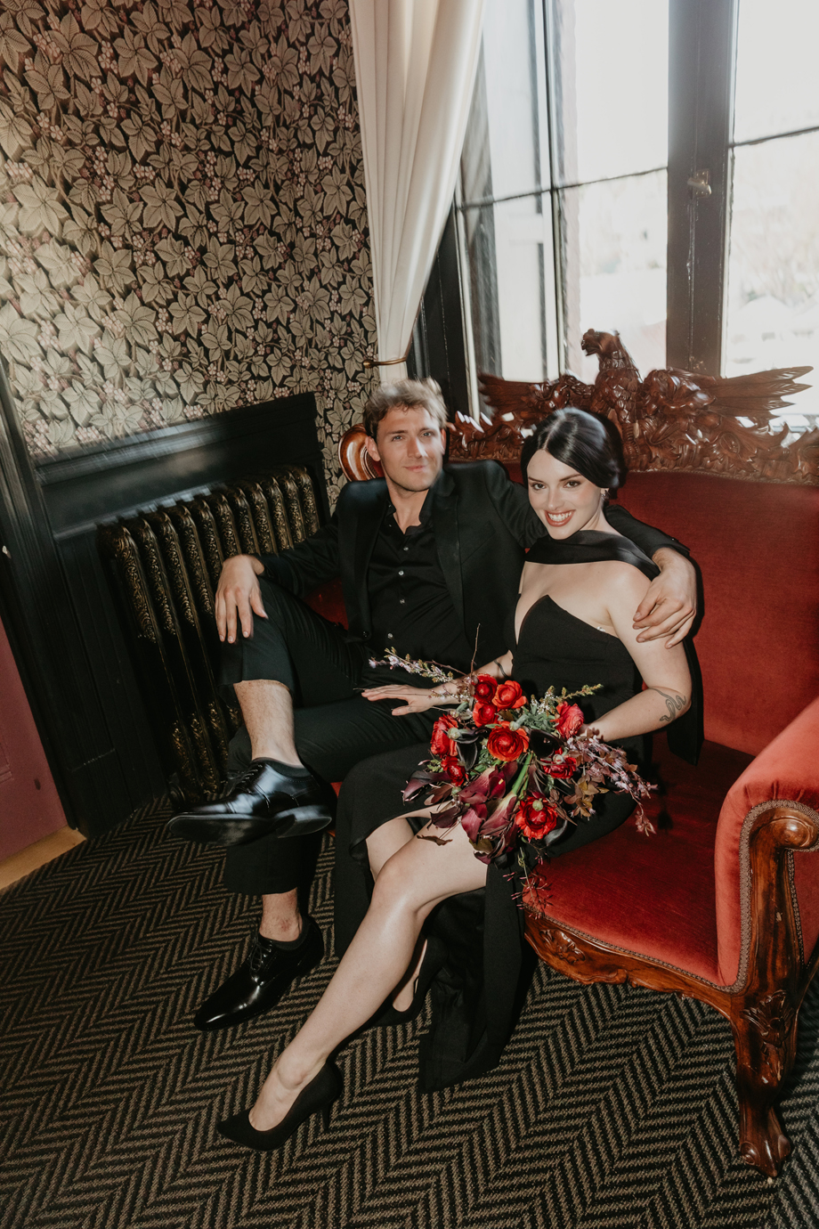 Inspired by the idea that love stories don’t have to follow tradition, the talented creative team of local wedding professionals designed a scene that celebrates individuality and unapologetic romance. Rich red florals cascade across candlelit tables, black attire adds striking sophistication, and the warm glow of the hotel’s historic interiors creates an atmosphere that feels equal parts mysterious and refined. The result? A “Till Death Do Us Part” moment that is as edgy as it is elegant.