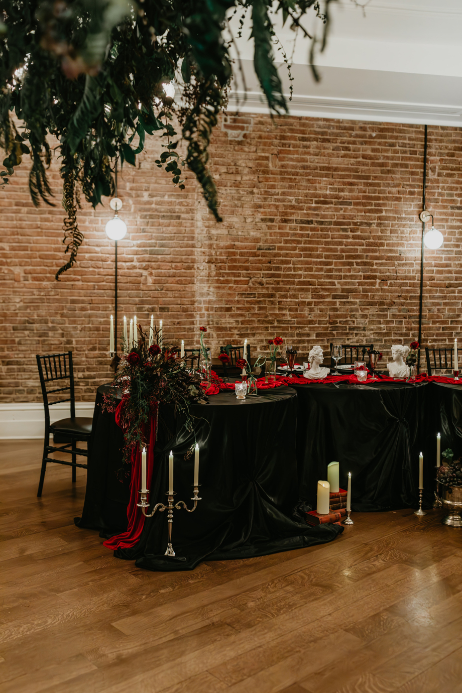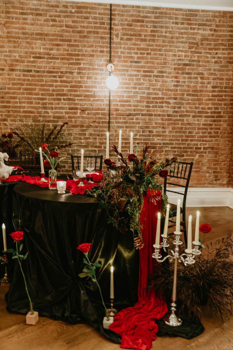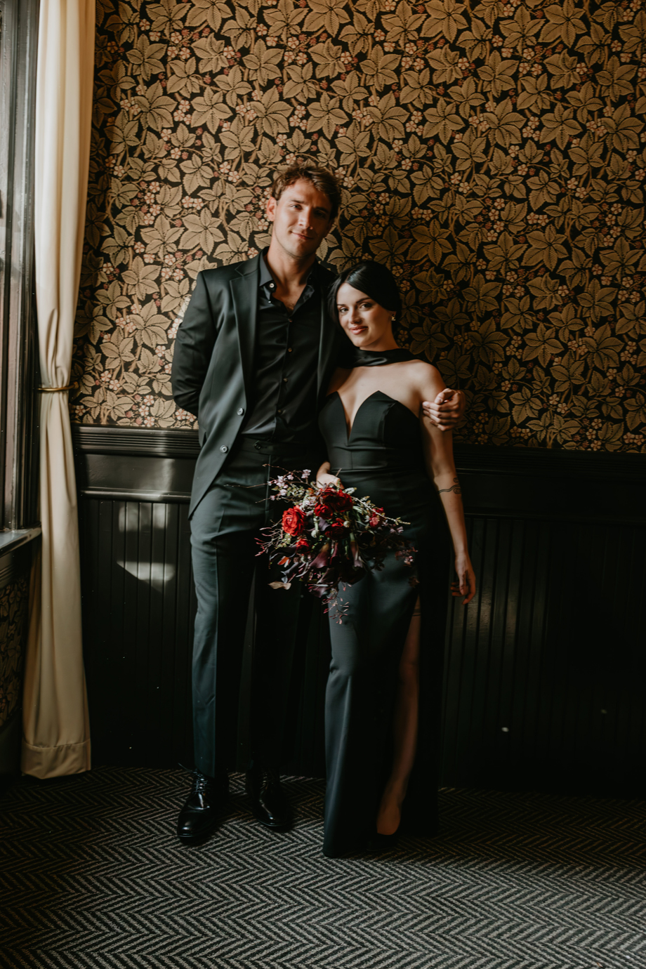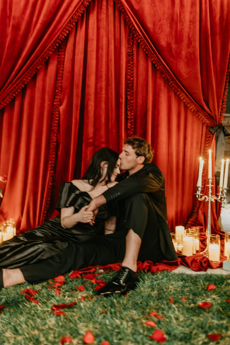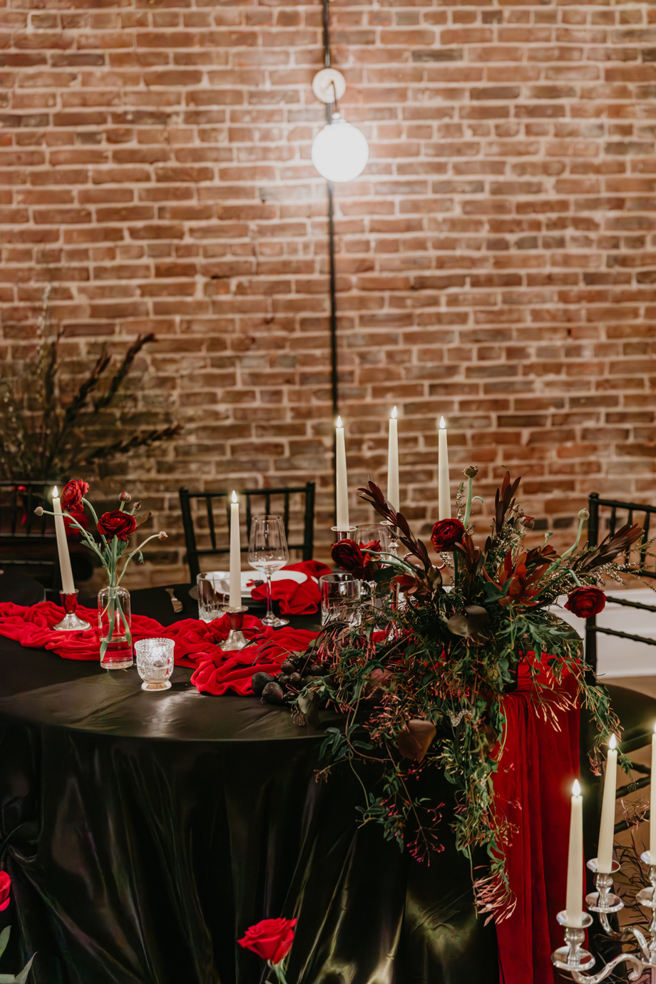 Inspired by the idea that love stories don’t have to follow tradition, the talented creative team of local wedding professionals designed a scene that celebrates individuality and unapologetic romance. Rich red florals cascade across candlelit tables, black attire adds striking sophistication, and the warm glow of the hotel’s historic interiors creates an atmosphere that feels equal parts mysterious and refined. The result? A “Till Death Do Us Part” moment that is as edgy as it is elegant.
