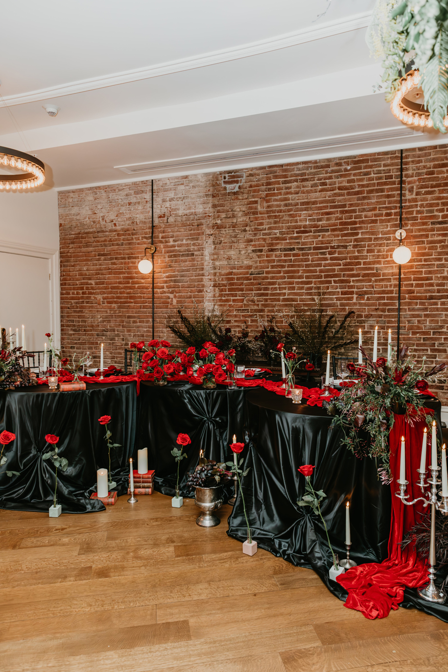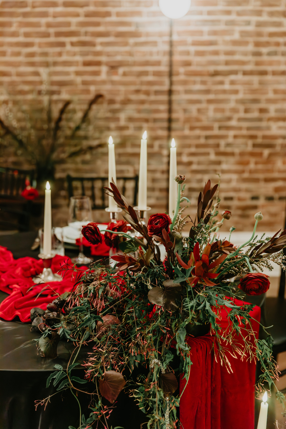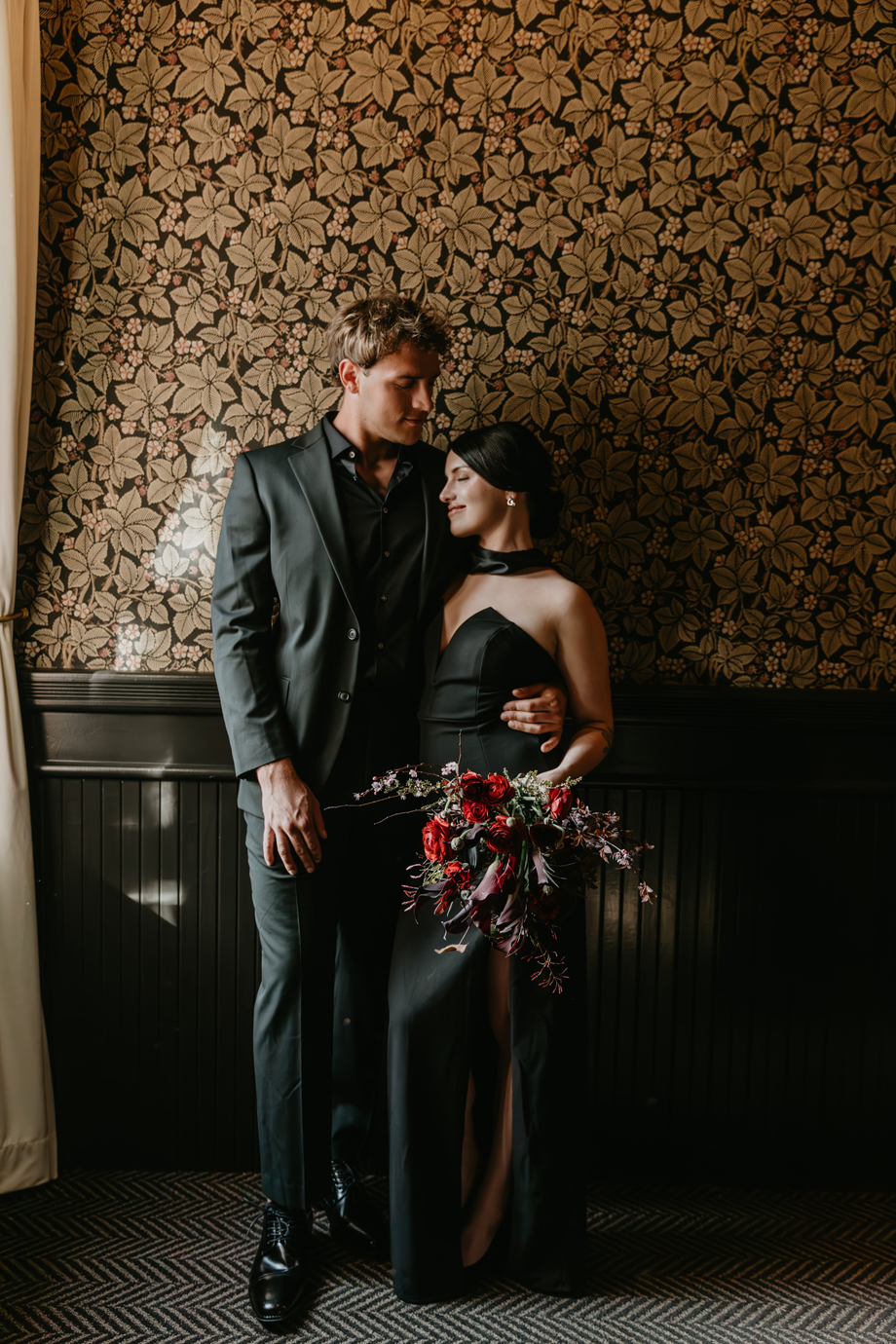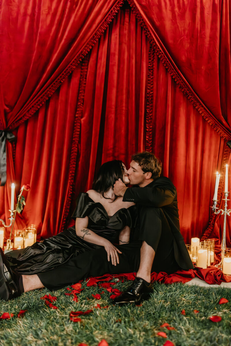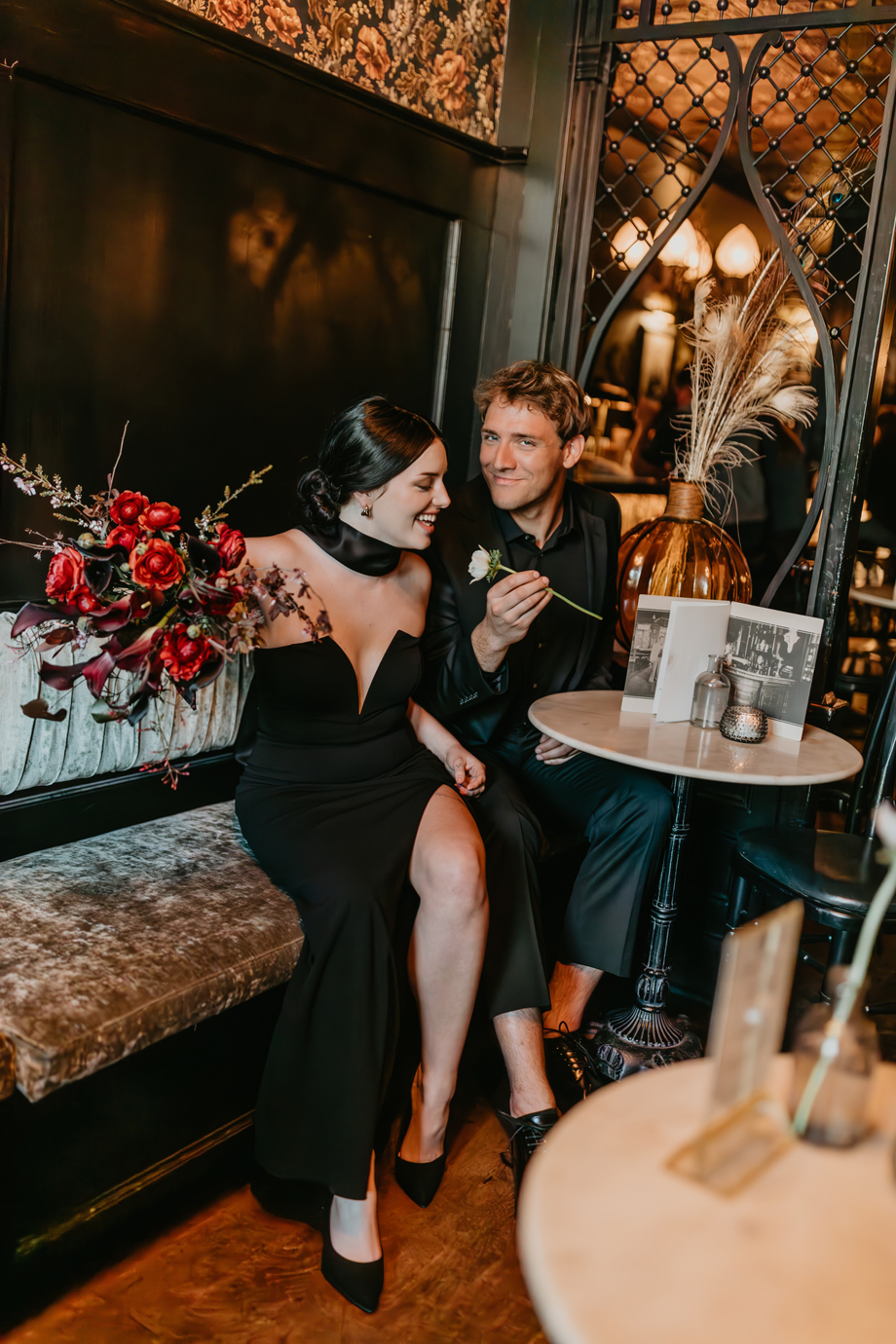 Inspired by the idea that love stories don’t have to follow tradition, the talented creative team of local wedding professionals designed a scene that celebrates individuality and unapologetic romance. Rich red florals cascade across candlelit tables, black attire adds striking sophistication, and the warm glow of the hotel’s historic interiors creates an atmosphere that feels equal parts mysterious and refined. The result? A “Till Death Do Us Part” moment that is as edgy as it is elegant.