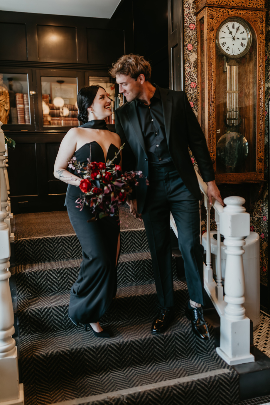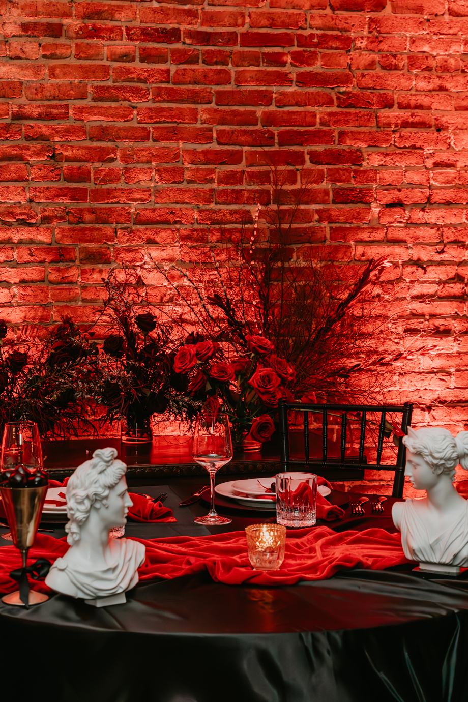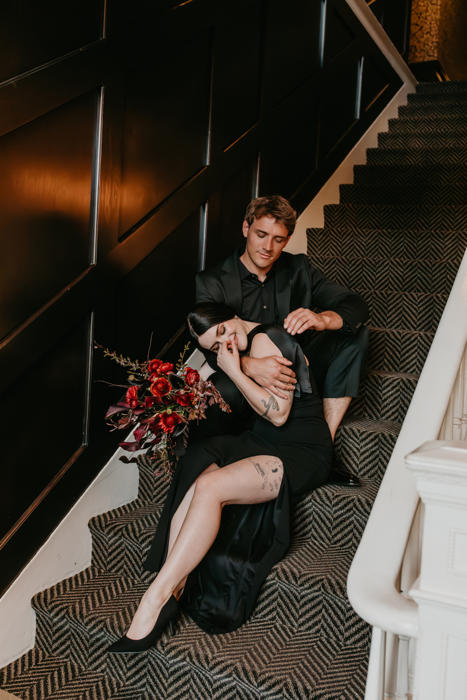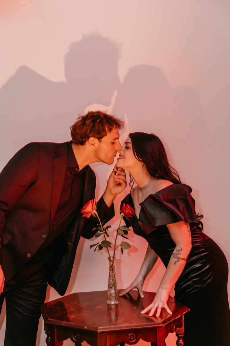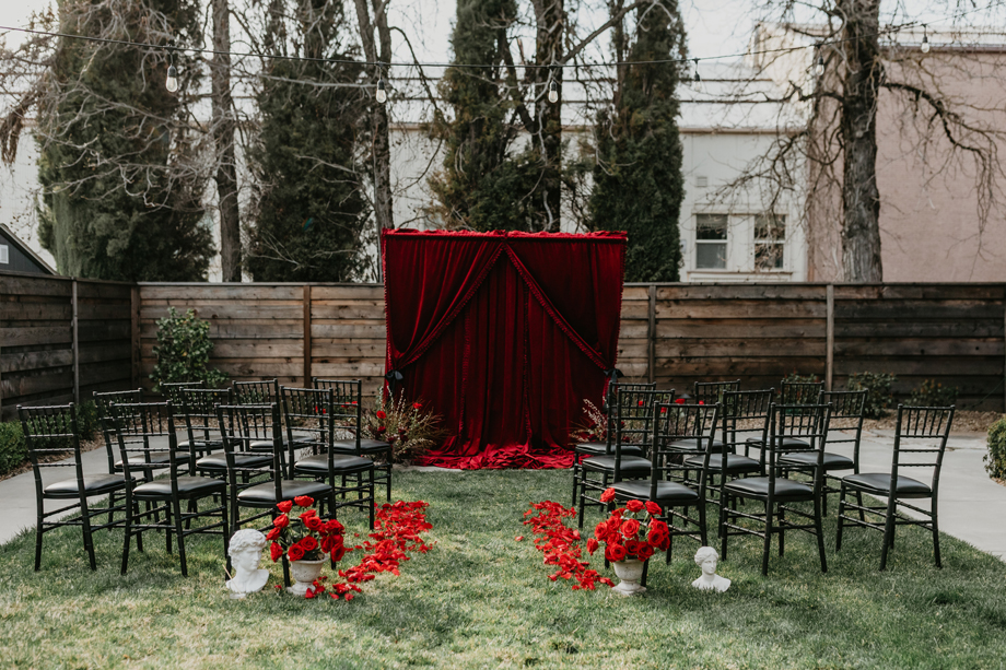 Inspired by the idea that love stories don’t have to follow tradition, the talented creative team of local wedding professionals designed a scene that celebrates individuality and unapologetic romance. Rich red florals cascade across candlelit tables, black attire adds striking sophistication, and the warm glow of the hotel’s historic interiors creates an atmosphere that feels equal parts mysterious and refined. The result? A “Till Death Do Us Part” moment that is as edgy as it is elegant.