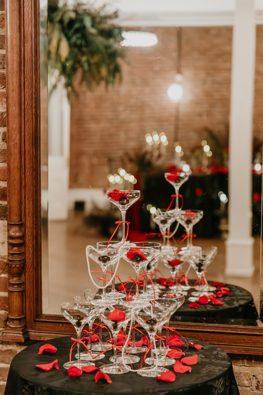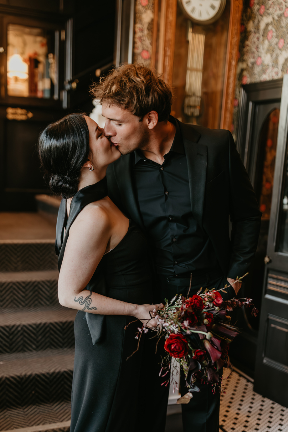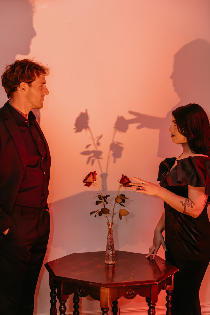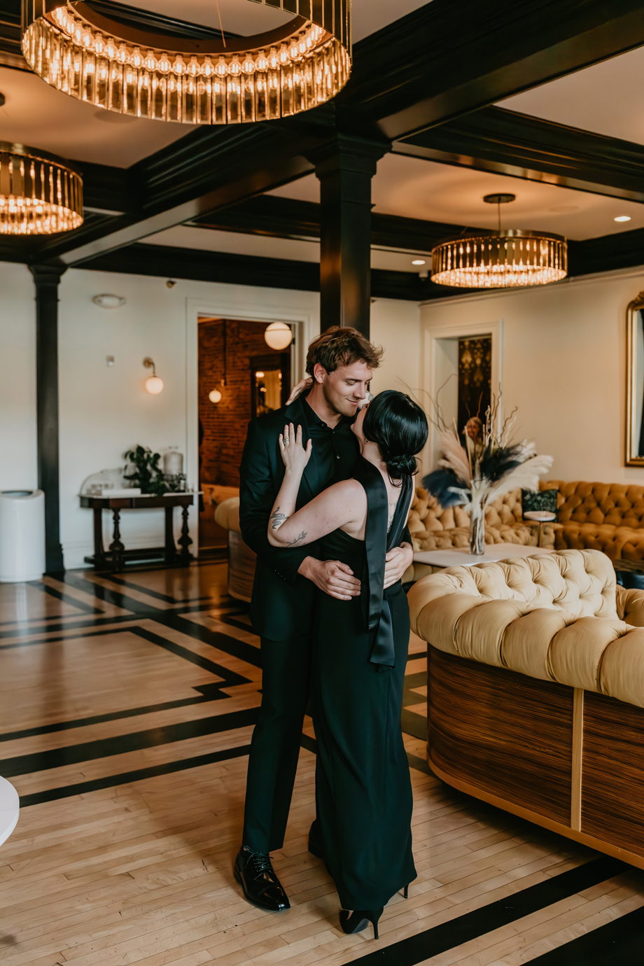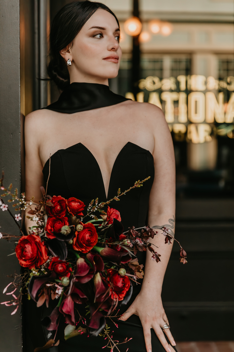 Inspired by the idea that love stories don’t have to follow tradition, the talented creative team of local wedding professionals designed a scene that celebrates individuality and unapologetic romance. Rich red florals cascade across candlelit tables, black attire adds striking sophistication, and the warm glow of the hotel’s historic interiors creates an atmosphere that feels equal parts mysterious and refined. The result? A “Till Death Do Us Part” moment that is as edgy as it is elegant.