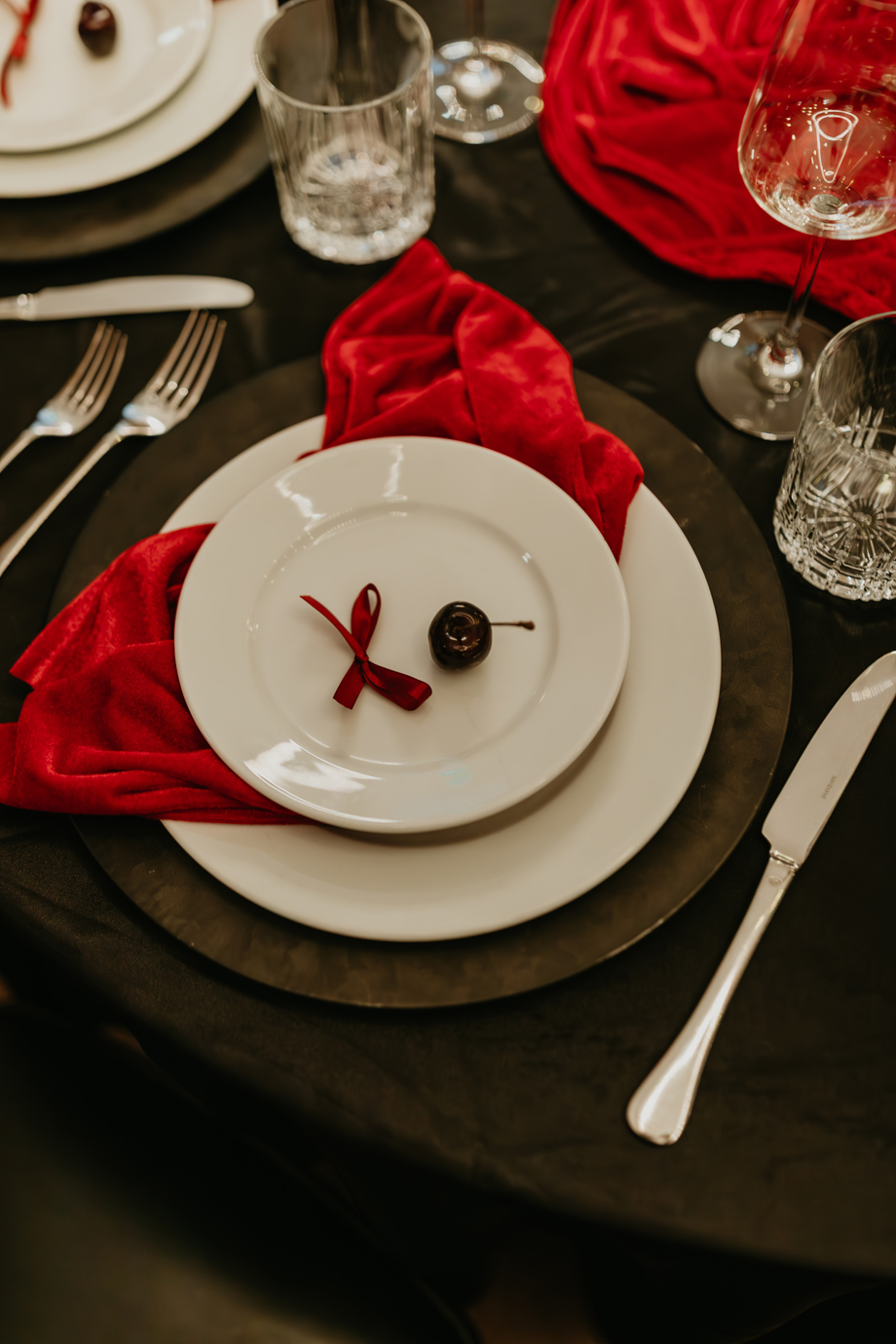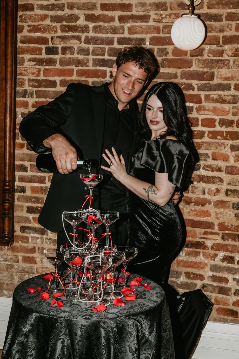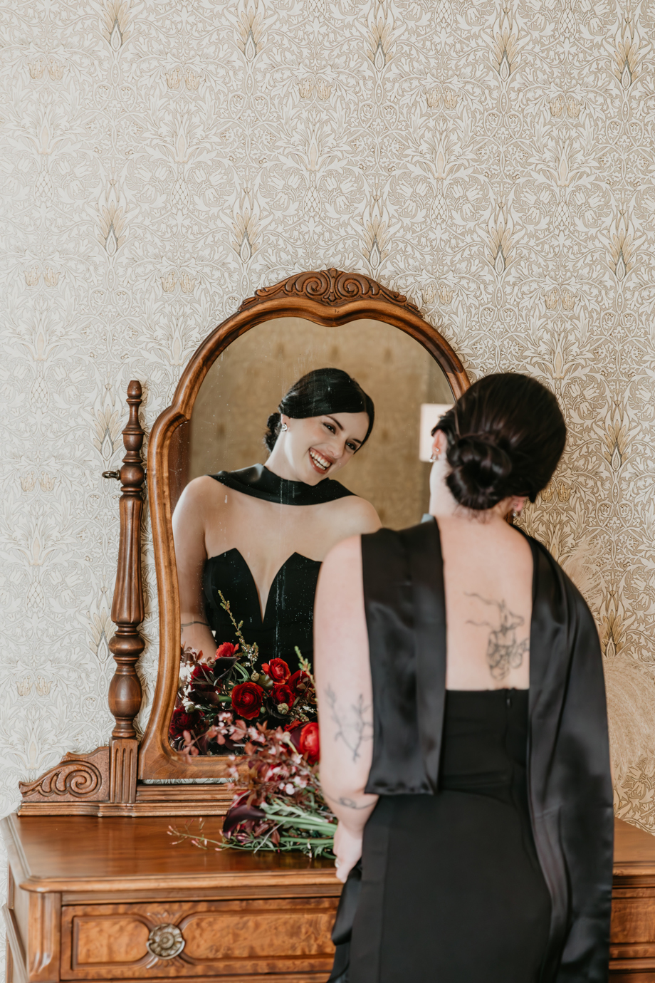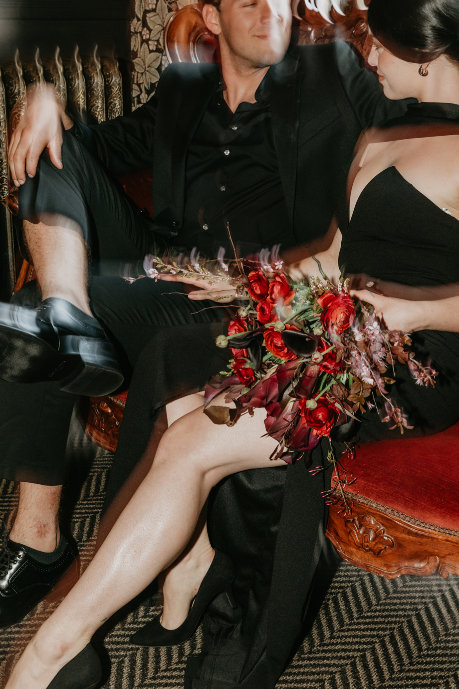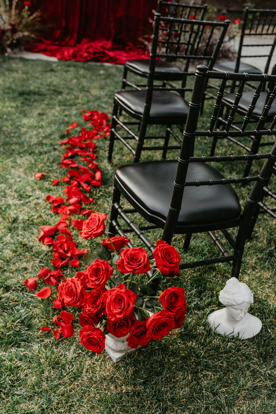 Inspired by the idea that love stories don’t have to follow tradition, the talented creative team of local wedding professionals designed a scene that celebrates individuality and unapologetic romance. Rich red florals cascade across candlelit tables, black attire adds striking sophistication, and the warm glow of the hotel’s historic interiors creates an atmosphere that feels equal parts mysterious and refined. The result? A “Till Death Do Us Part” moment that is as edgy as it is elegant.