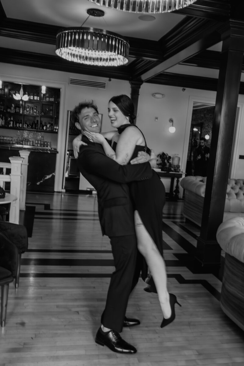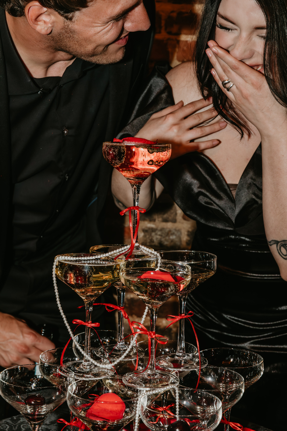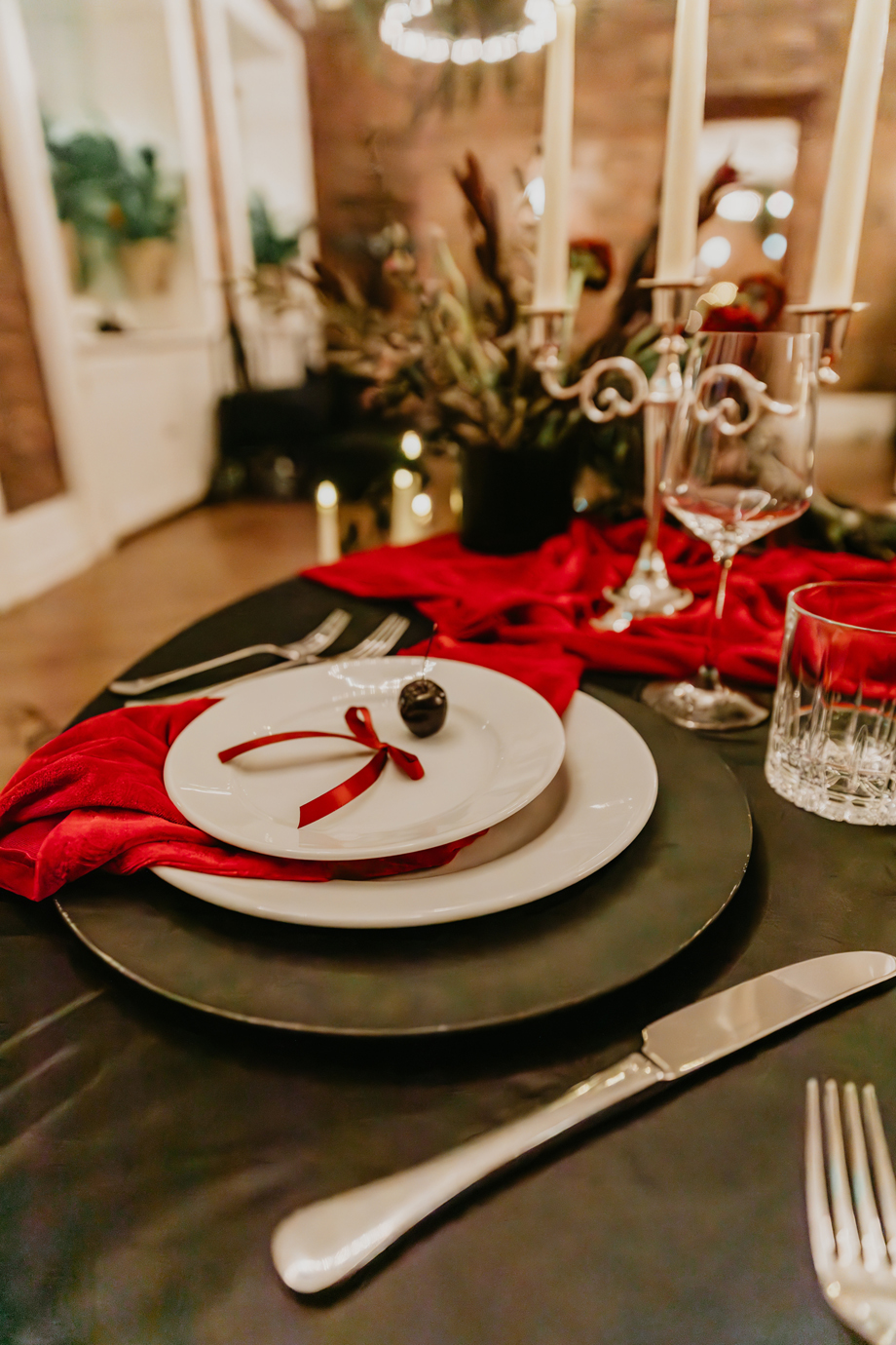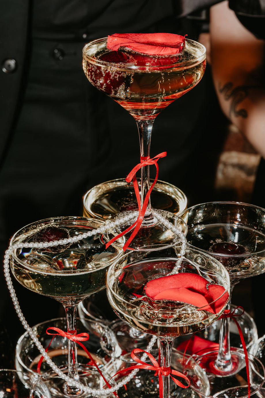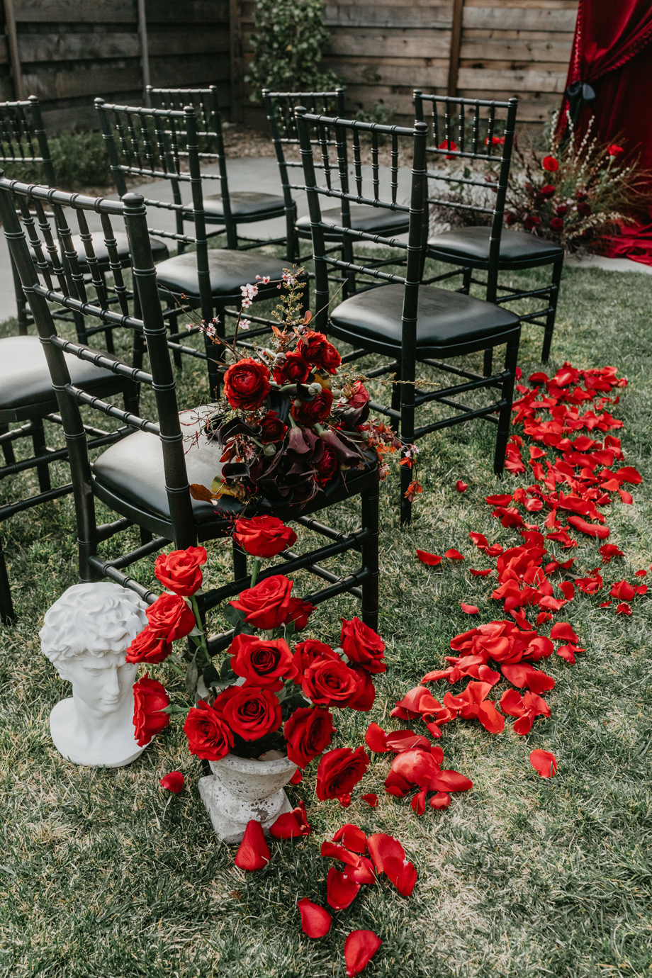 Inspired by the idea that love stories don’t have to follow tradition, the talented creative team of local wedding professionals designed a scene that celebrates individuality and unapologetic romance. Rich red florals cascade across candlelit tables, black attire adds striking sophistication, and the warm glow of the hotel’s historic interiors creates an atmosphere that feels equal parts mysterious and refined. The result? A “Till Death Do Us Part” moment that is as edgy as it is elegant.