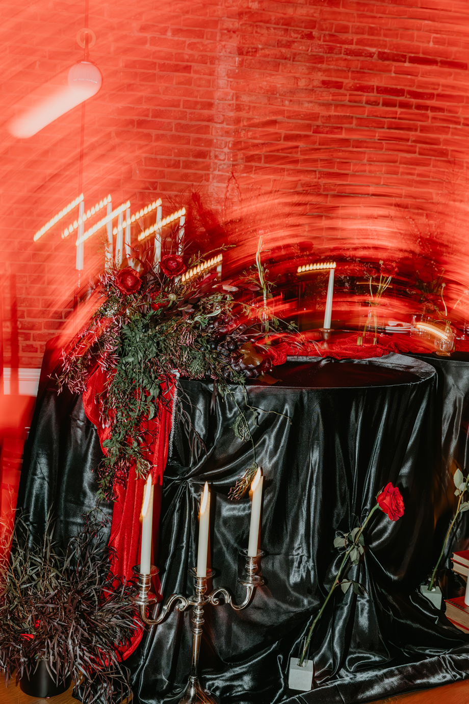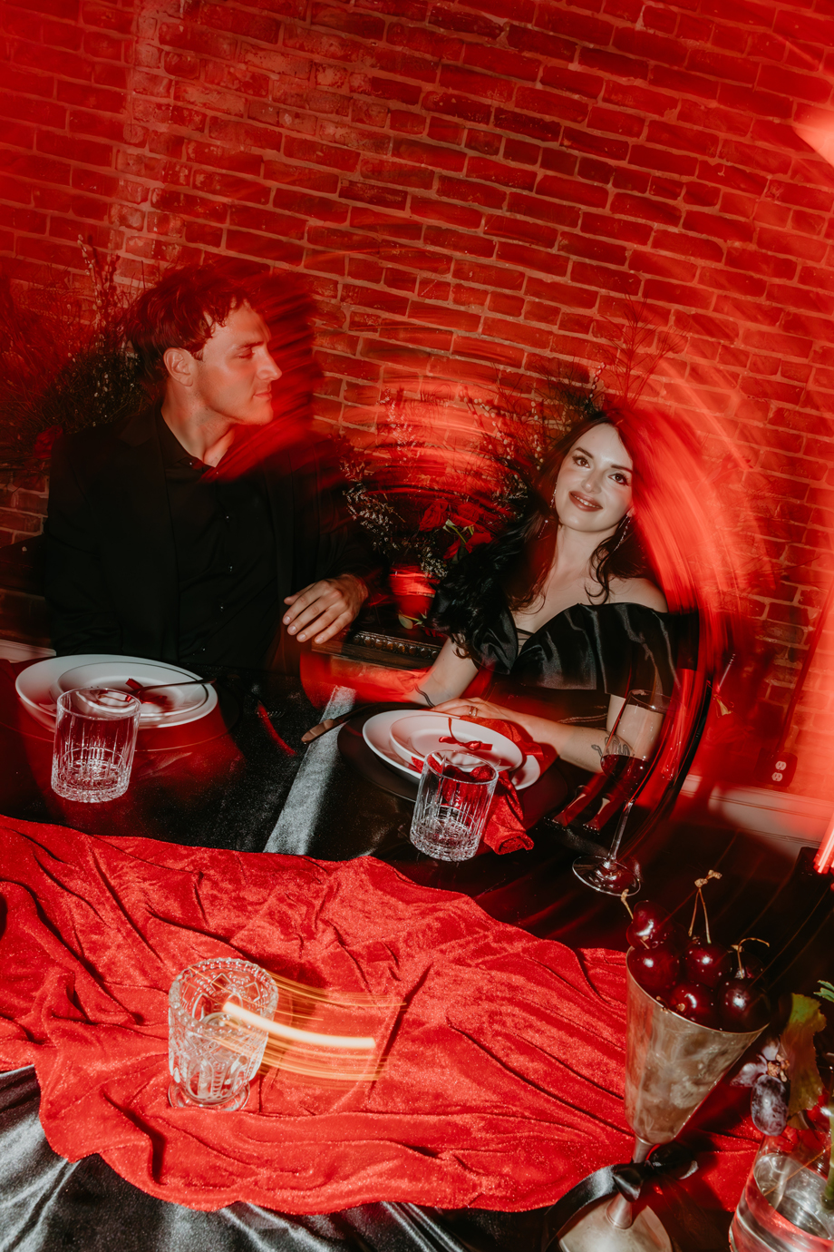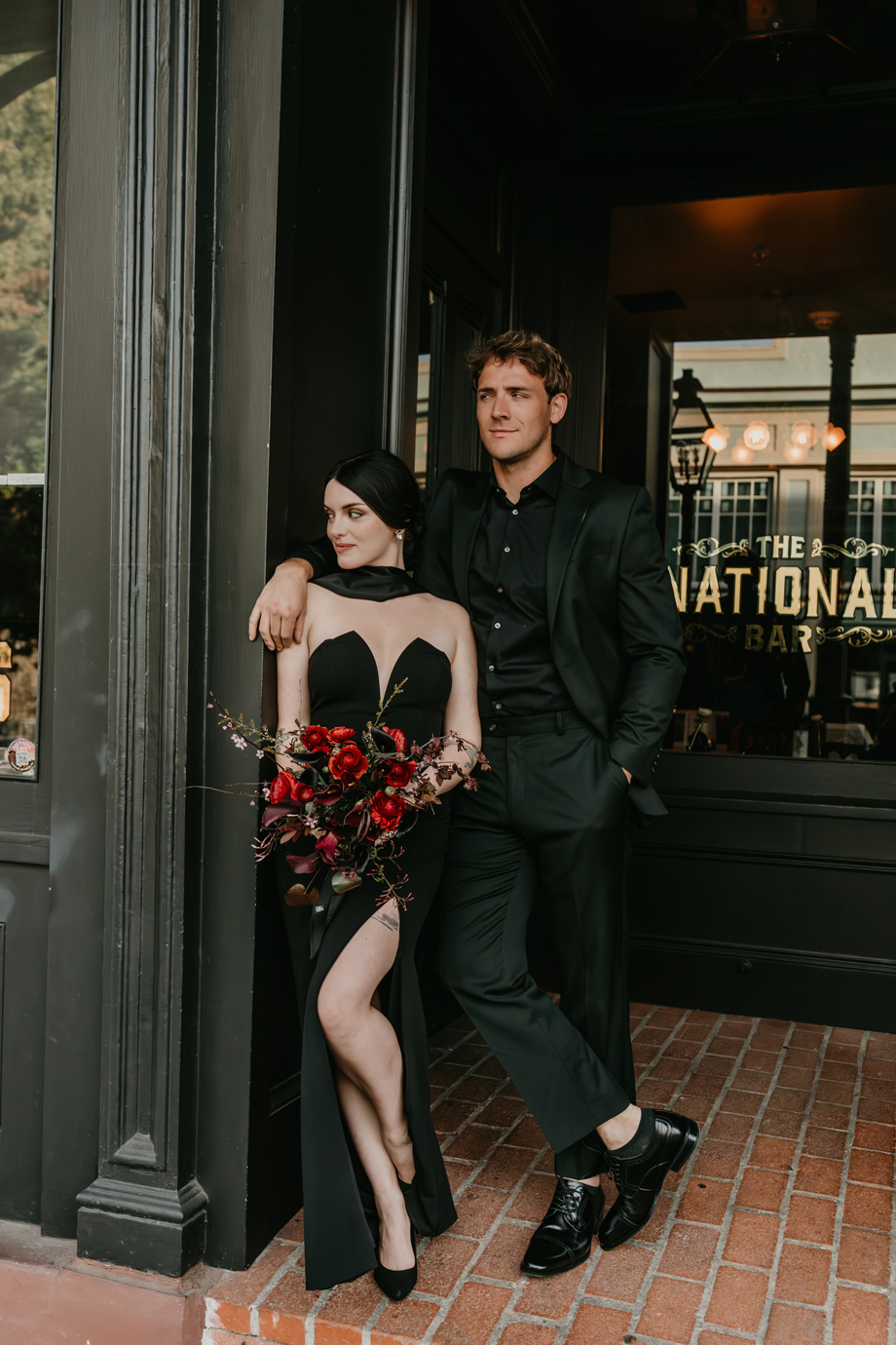 Built during the California Gold Rush and lovingly restored to maintain its historic charm, The National Exchange Hotel provides the perfect backdrop for this bold vision. Against its textured brick, vintage details and dramatic lighting, the deep crimson palette and modern styling create a captivating contrast that feels both timeless and fresh.