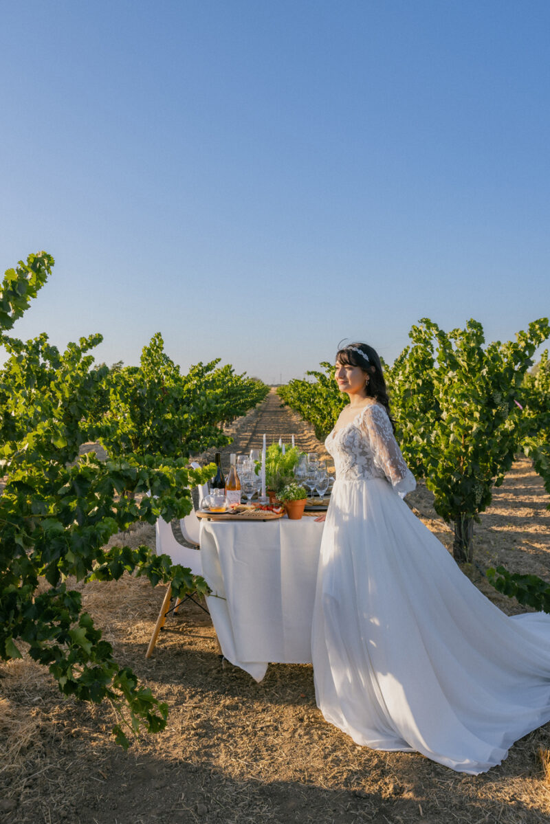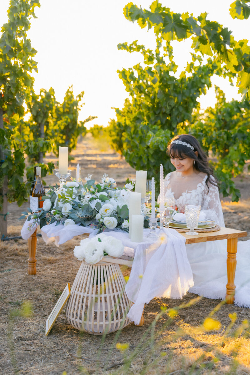 We asked Seniya the inspiration behind this styled shoot, and here’s what she had to say, “Bathed in the golden glow of a California sunset, these tablescapes prove that sustainability and style are the perfect pairing. Set amongst the lush rows the vineyard, this scene celebrates organic beauty, thoughtful design, and the simple joy of gathering among the vines.”