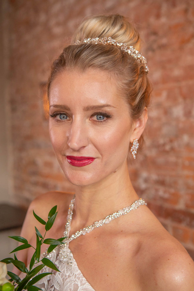 Gown from De La Rosa’s Bridal & Tuxedos; Headpiece by Twigs & Honey; Earrings by USABride; Necklace from Macy’s; Bouquet by Accents by Sage Floral Design; Hair by Lisa Harter Hair and Makeup Artist; Makeup by Happily Beautiful Makeup Artistry & Skin Studio. Photography by Farrell Photography on location at Hotel Sutter.