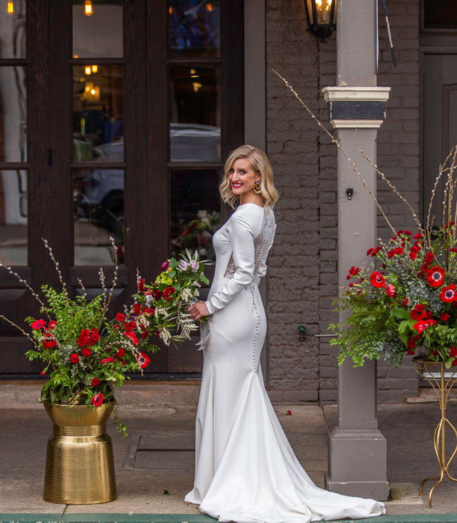 Gown from The Clothes Mine; Hair combs by Always Elegant Bridal & Tuxedo; Jewelry from Macy’s; Boots by Ariat; Bouquet by Accents by Sage Floral Design; Hair by Lisa Harter Hair and Makeup Artist; Makeup by Happily Beautiful Makeup Artistry & Skin Studio. Photography by Farrell Photography on location at Hotel Sutter.