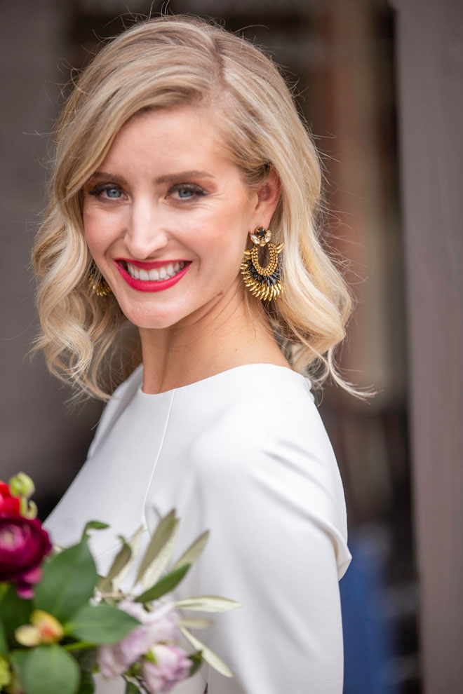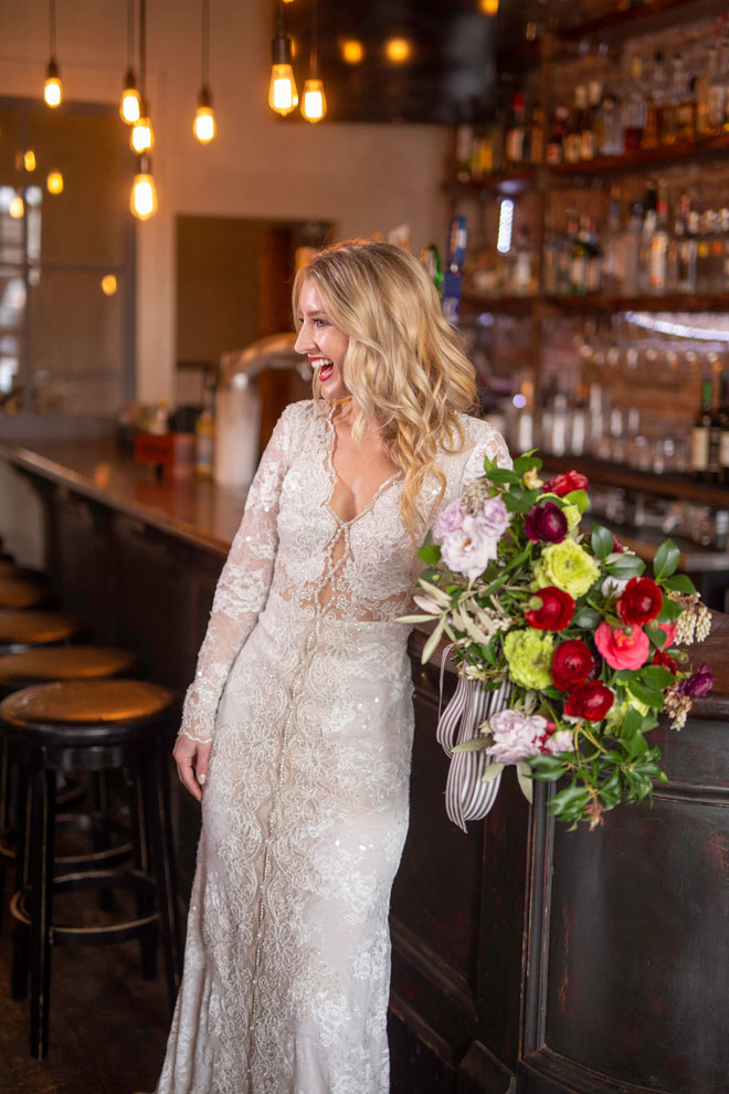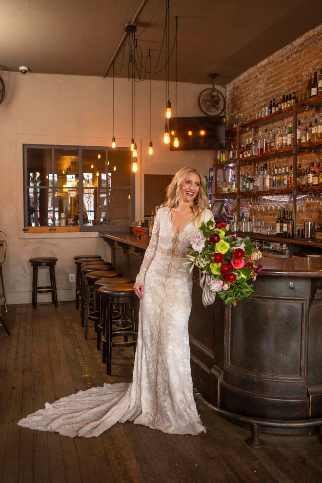 Gown from Second Summer Bride; Earrings by Mariell; Shoes from DSW; Bouquet by Paradise Parkway Event Productions with wholesale flowers from Fiftyflowers.com; Hair by Lisa Harter Hair and Makeup Artist; Makeup by Happily Beautiful Makeup Artistry & Skin Studio. Photography by Farrell Photography on location at Hotel Sutter.