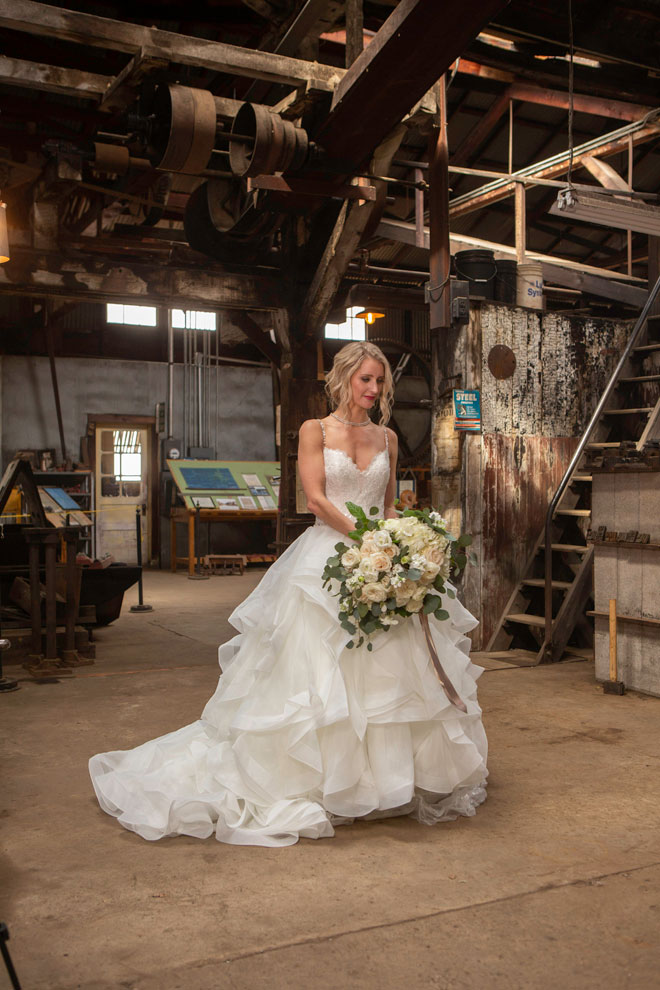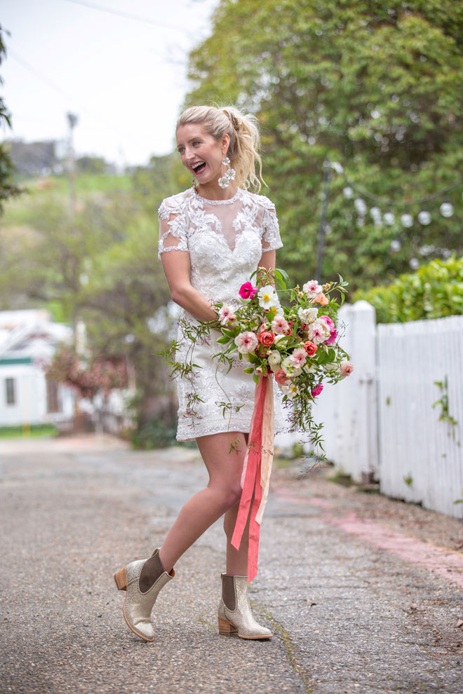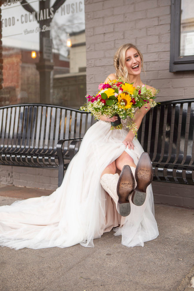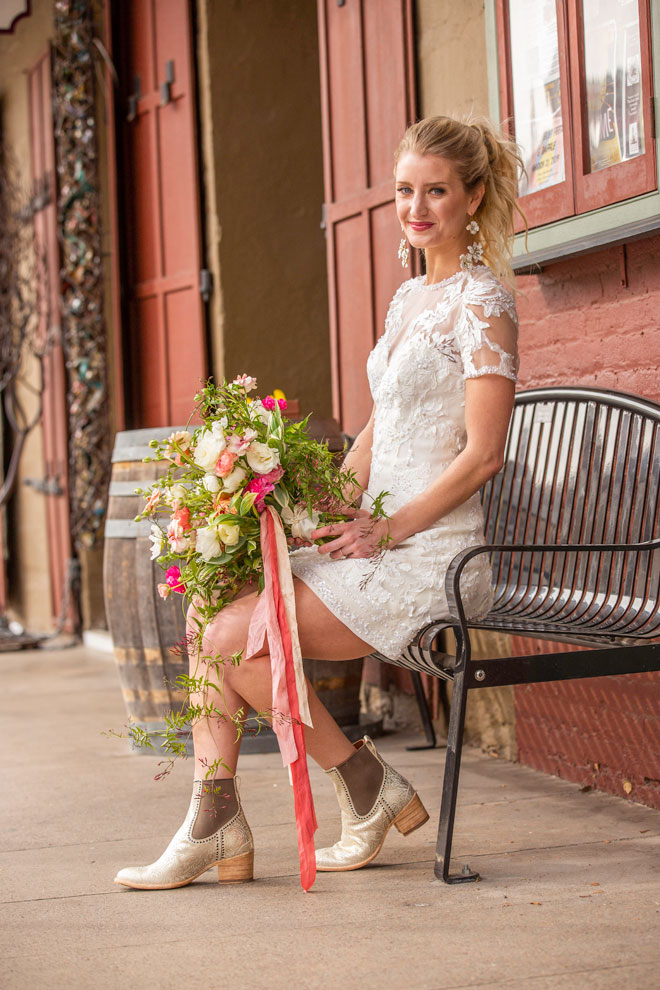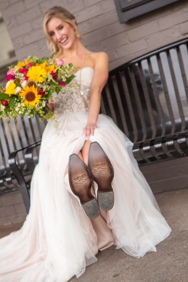 Gown from Second Summer Bride; Earrings by Twigs & Honey; Boots by Ariat; Bouquet by Flourish; Hair by Lisa Harter Hair and Makeup Artist; Makeup by Happily Beautiful Makeup Artistry & Skin Studio. Photography by Farrell Photography on location at Hotel Sutter.