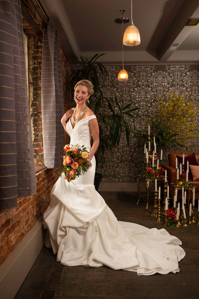 Gown from The Clothes Mine; Headpiece by Hair Comes the Bride; Earrings from Macy’s; Bracelet by Sorrelli Jewelry; Bouquet by Relles Florist; Hair by Lisa Harter Hair and Makeup Artist; Makeup by Happily Beautiful Makeup Artistry & Skin Studio. Photography by Farrell Photography on location at Hotel Sutter.