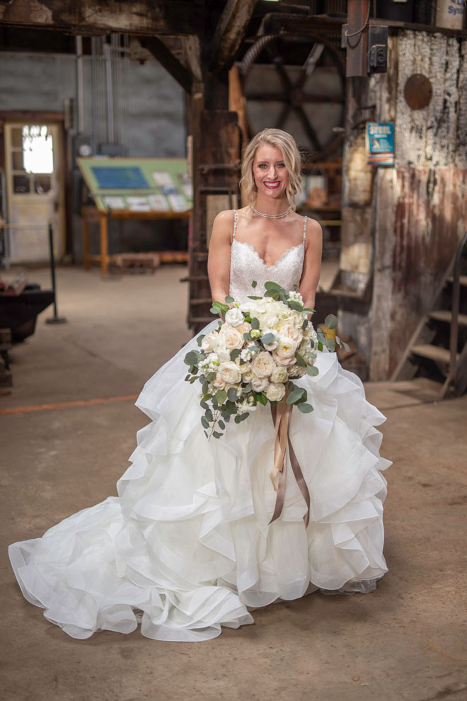 Gown by Solo Merav from Diamond Bridal Gallery; Earrings by Mariell; Bouquet by Placerville Flowers on Main; Hair by Lisa Harter Hair and Makeup Artist; Makeup by Happily Beautiful Makeup Artistry & Skin Studio. Photography by Farrell Photography on location at Hotel Sutter.