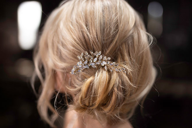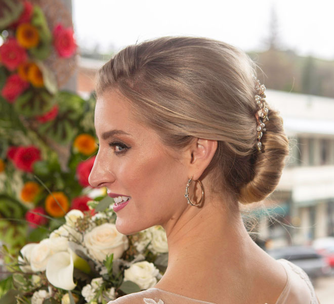 Gown from Always Elegant Bridal & Tuxedo; Jewelry from Macy’s; Floral comb and bouquet by Carson Valley Florist; Hair by Lisa Harter Hair and Makeup Artist; Makeup by Happily Beautiful Makeup Artistry & Skin Studio. Photography by Farrell Photography on location at Hotel Sutter.