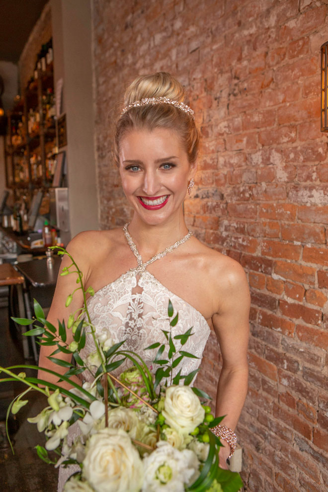Gown from The Bridal Box; Headpiece and earrings by USABride; Bracelet from Macy’s; Bouquet by The Party Concierge; Hair by Lisa Harter Hair and Makeup Artist; Makeup by Happily Beautiful Makeup Artistry & Skin Studio. Photography by Farrell Photography on location at Hotel Sutter.