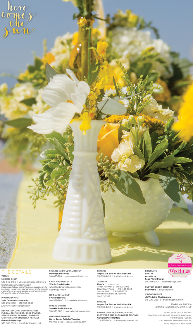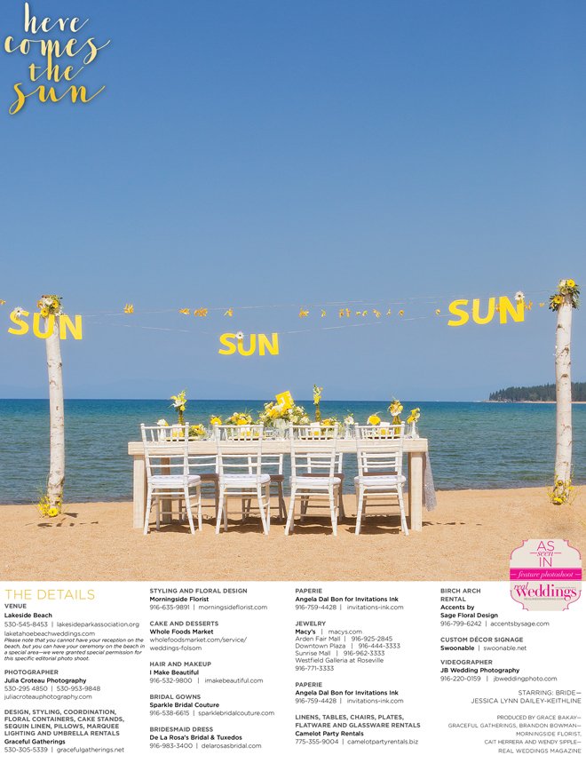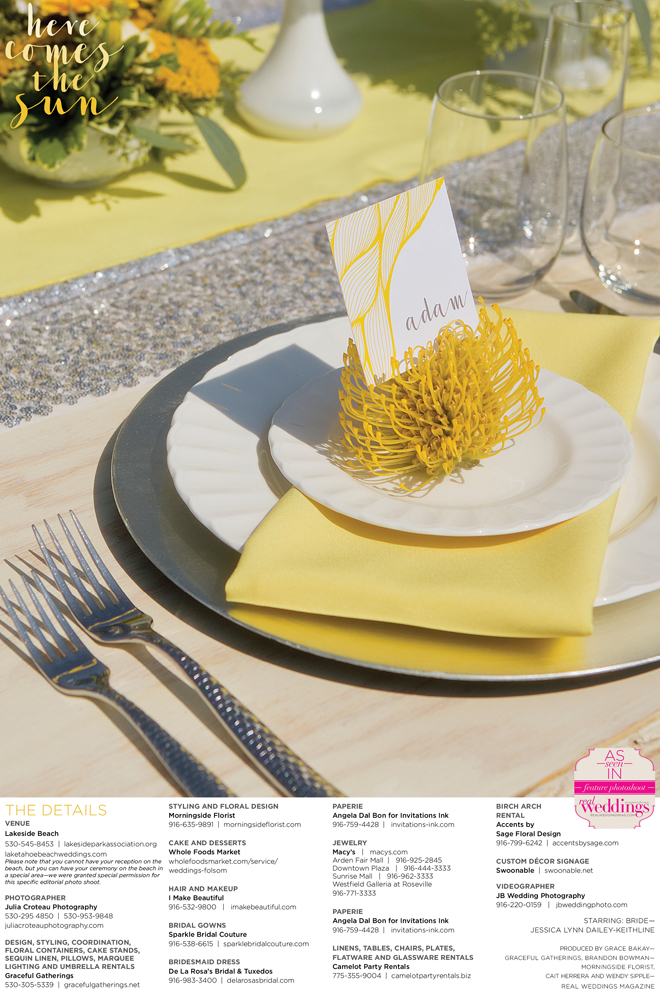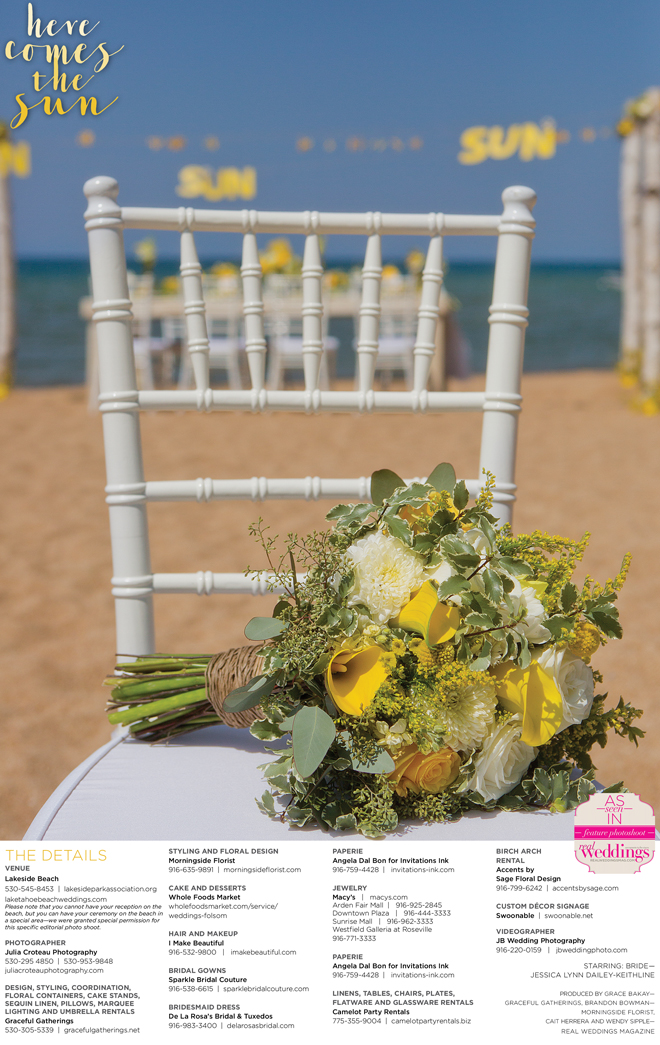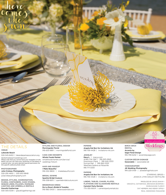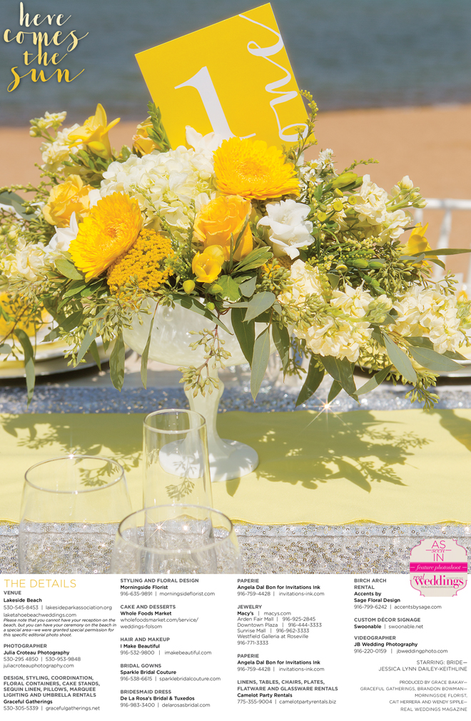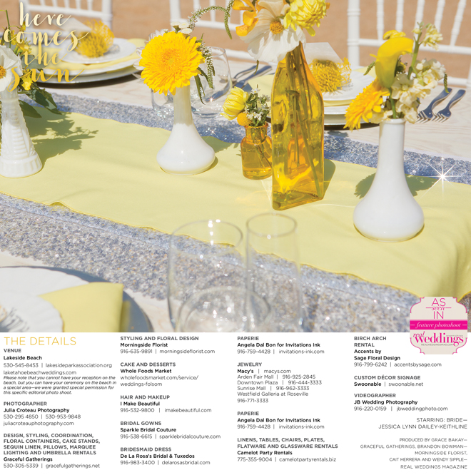 “Here Comes The Sun” styled shoot was produced by Grace Bakay—Graceful Gatherings, Brandon Bowman—Morningside Florist, Cait Herrera and Wendy Sipple—Real Weddings Magazine.