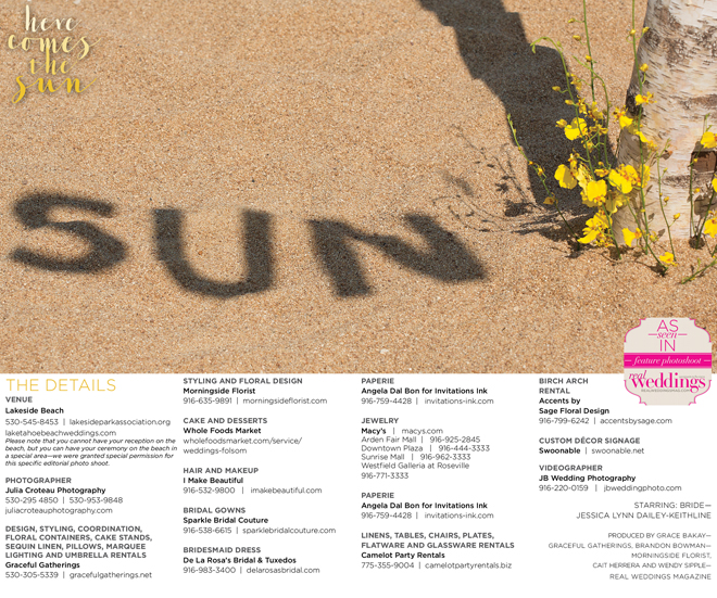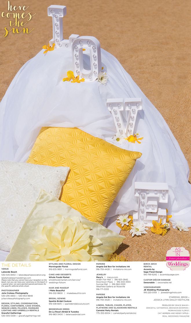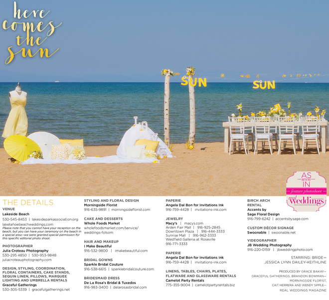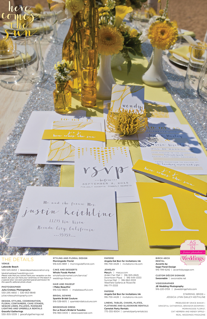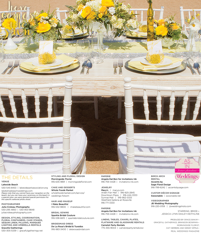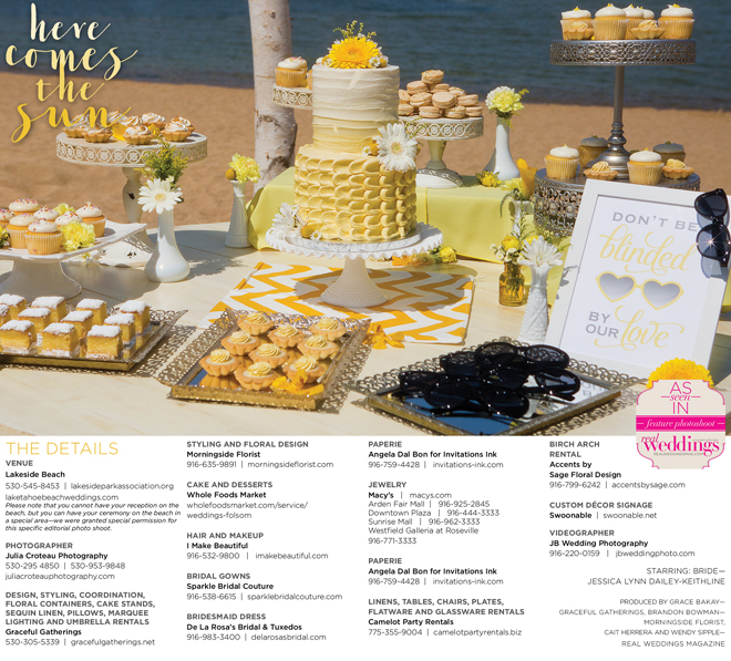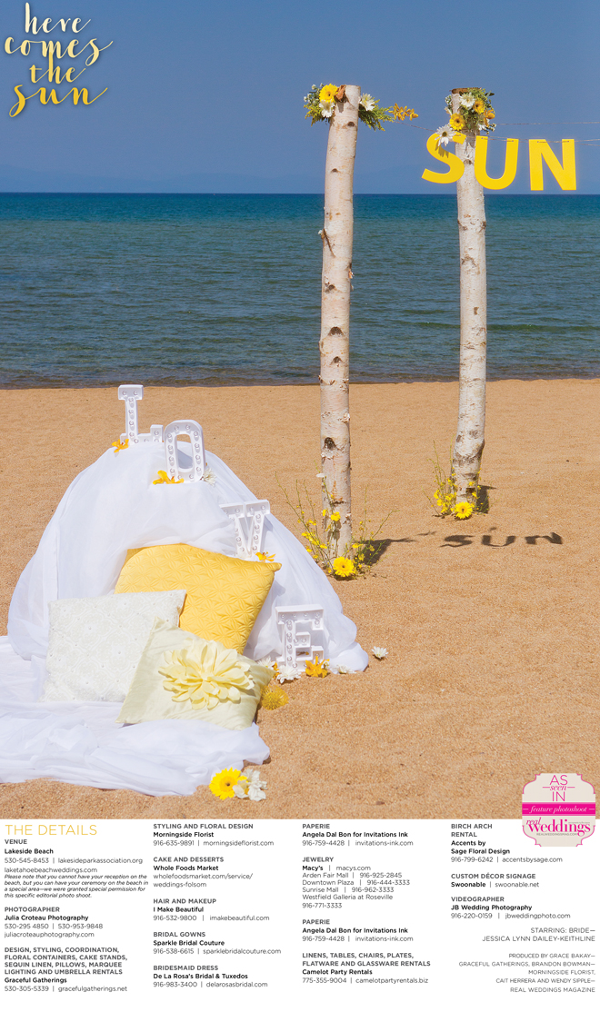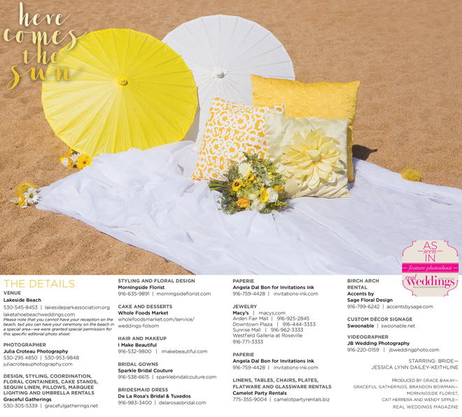“Here Comes The Sun” styled shoot was produced by Grace Bakay—Graceful Gatherings, Brandon Bowman—Morningside Florist, Cait Herrera and Wendy Sipple—Real Weddings Magazine.