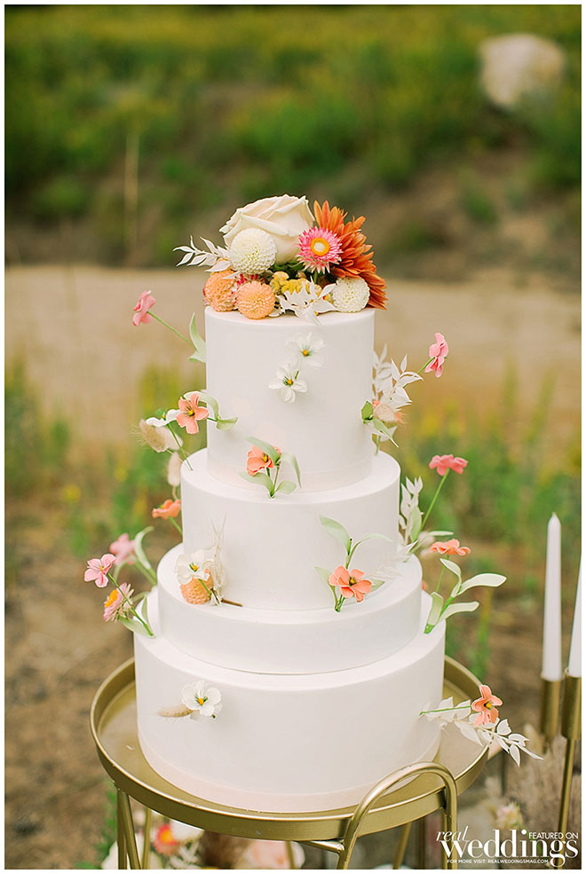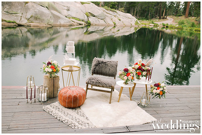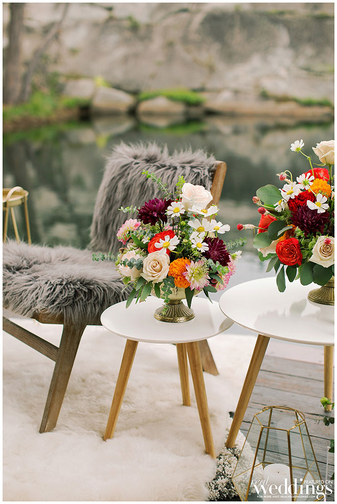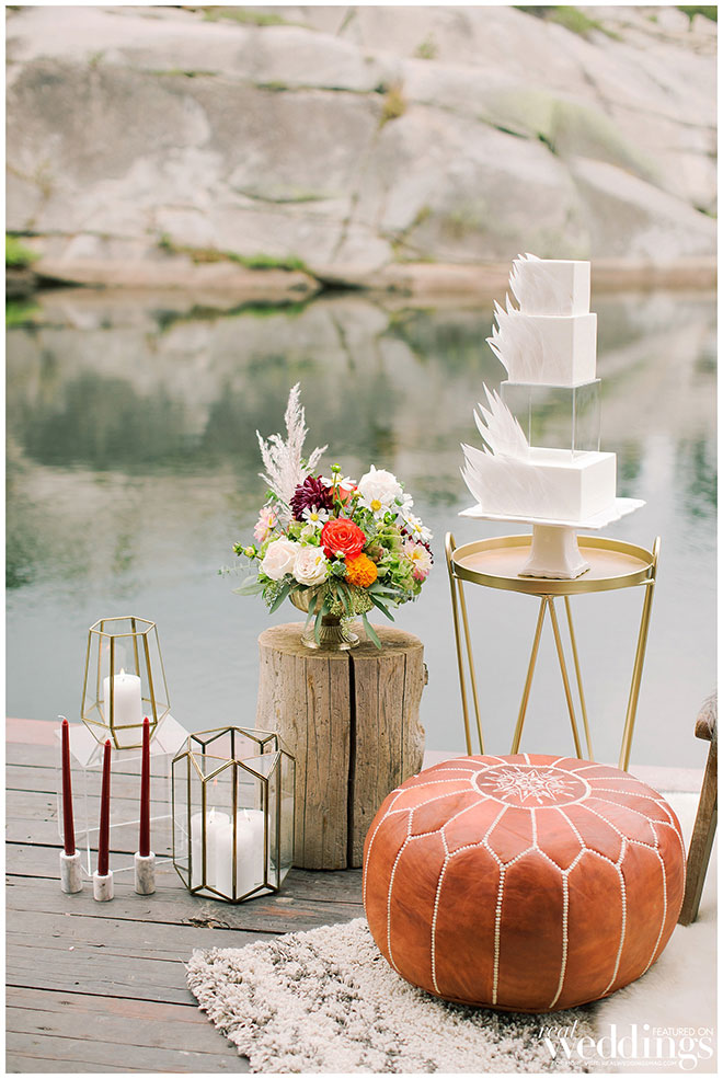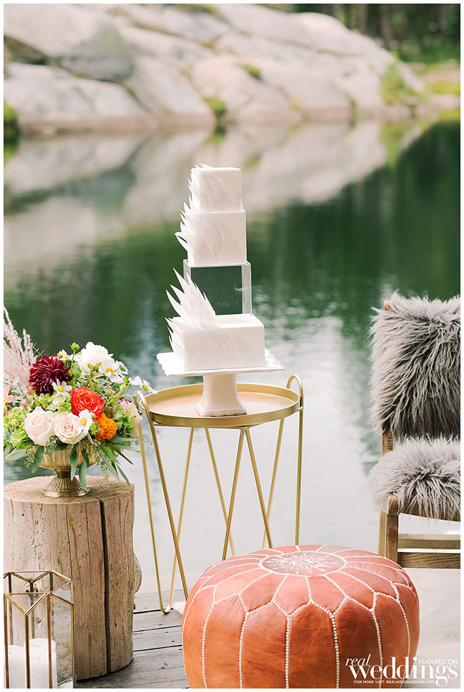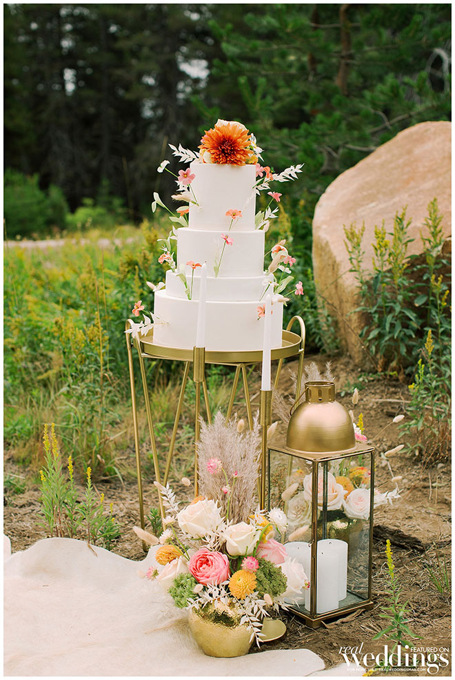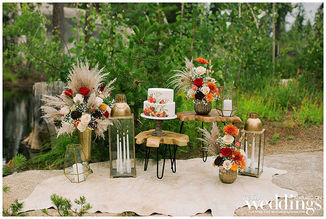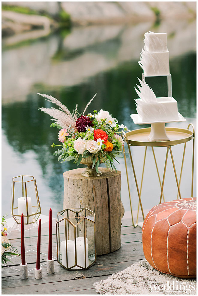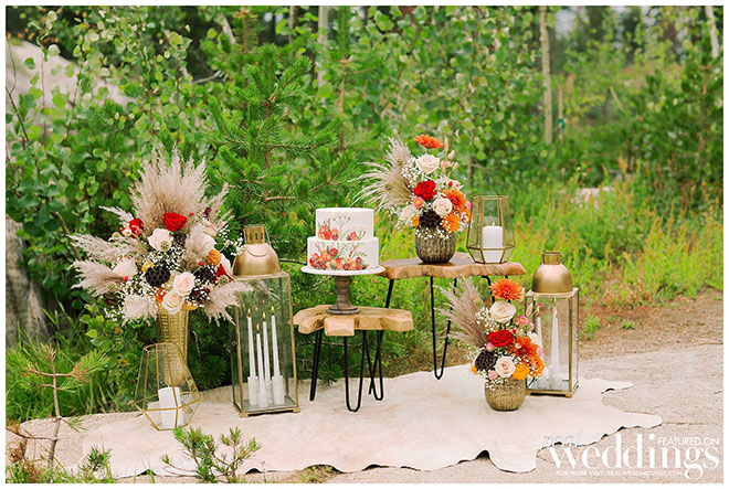Rentals, florals and cakes can really help set the theme for your wedding. For our “Mountain Retreat” Cover Model Photo Shoot our team was inspired to create three sets with colorful flowers, modern cakes and trendy rentals, adding to the already stunning backdrop of the venue.