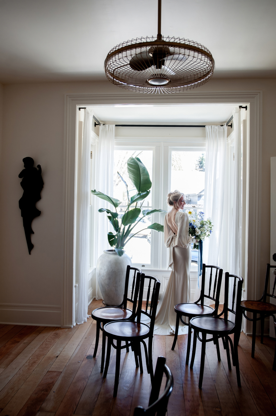 On Shelby: Earrings by Adora by Simona; Feather Shrug from Perfect Dress Party; Pantsuit from Brides for a Cause