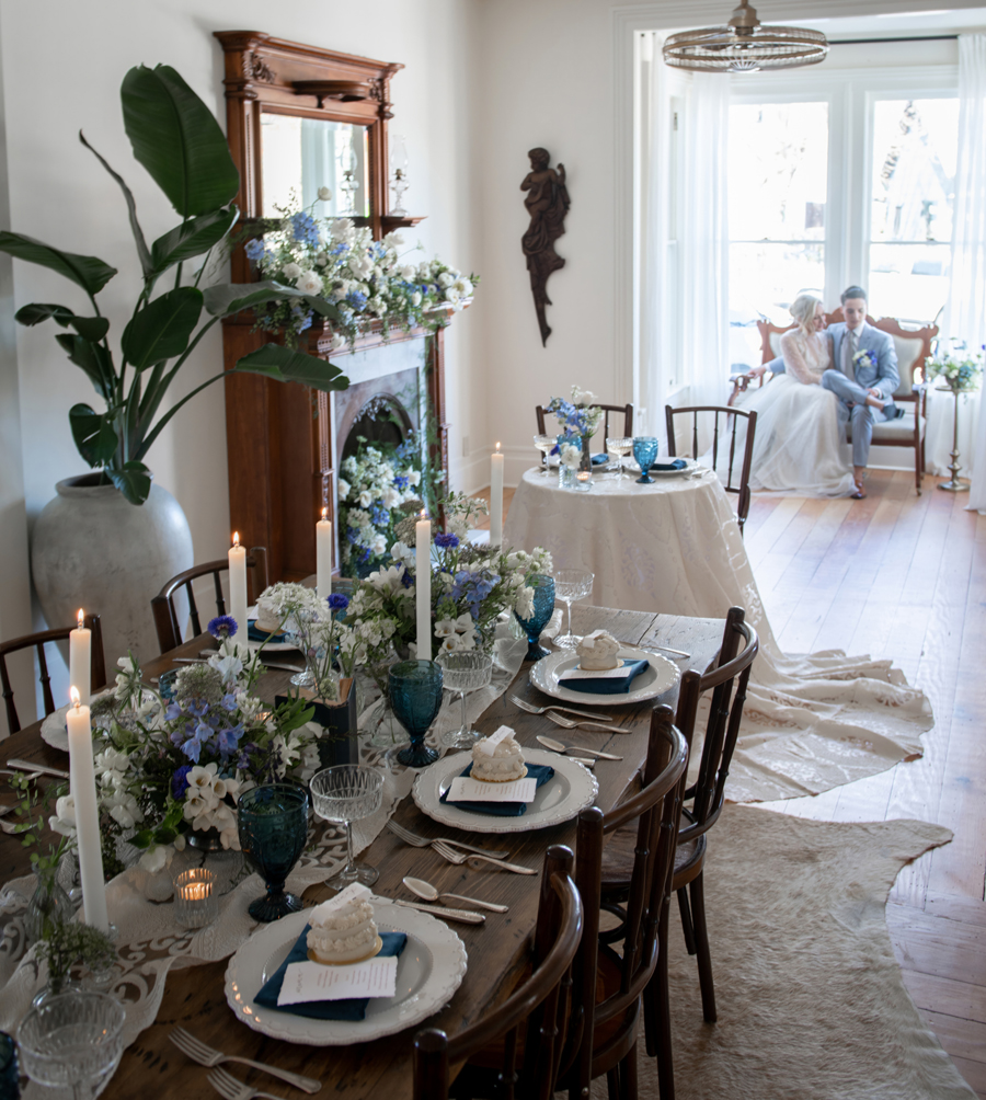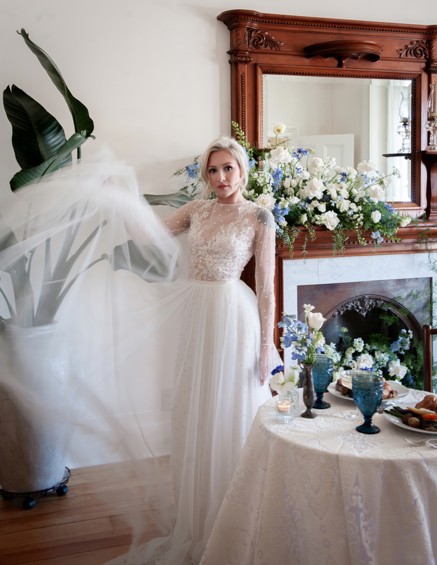 Shelby + Paige: Our favorite show right now is “Bridgerton” and this styled shoot was definitely giving those vibes. The Victorian Moody Romance theme was so fun to experience because it’s so different from our every-day life. It was like walking into a fairy tail surrounded by beautiful florals, with the most visually pleasing food, impeccable tablescapes, while wearing gorgeous whimsical dresses. We definitely got to live out our fairytale dress up dream!