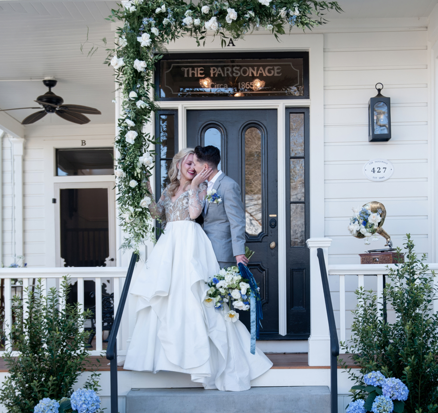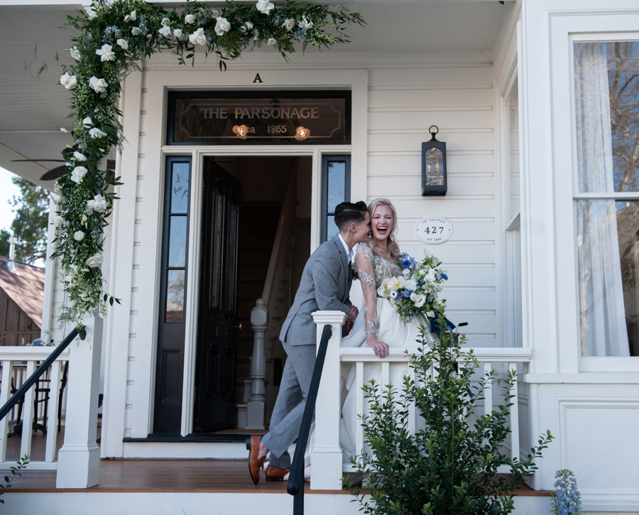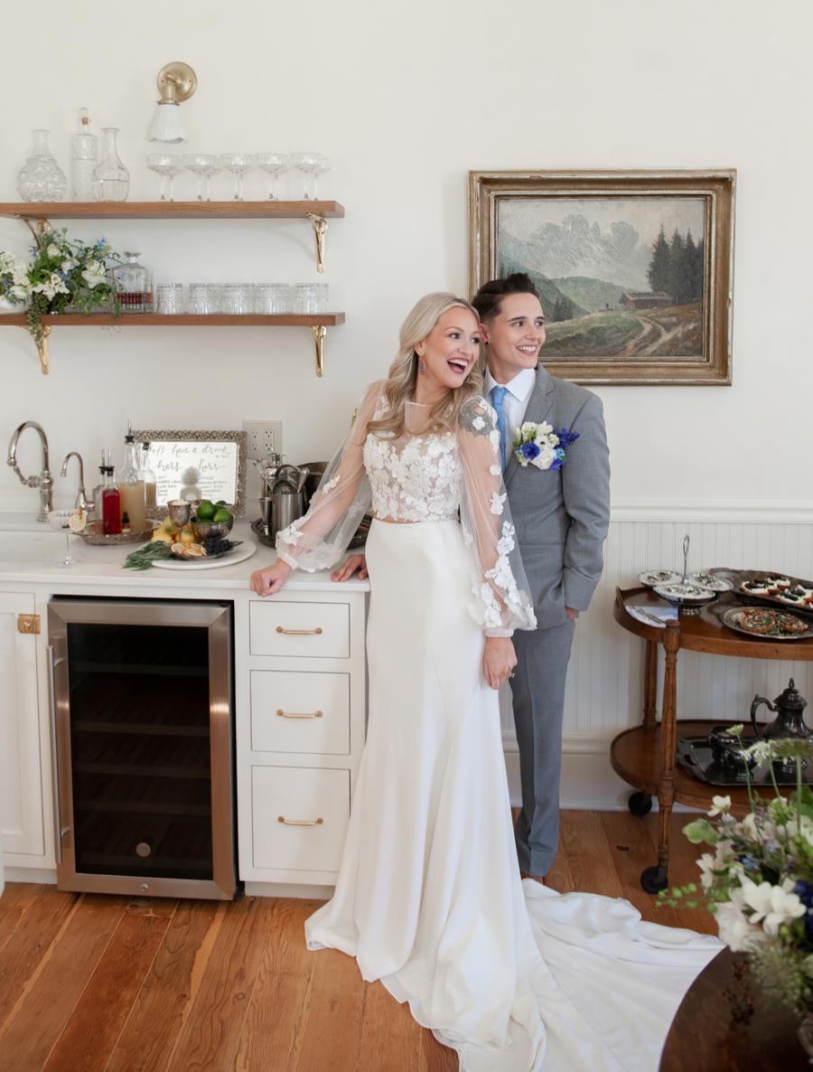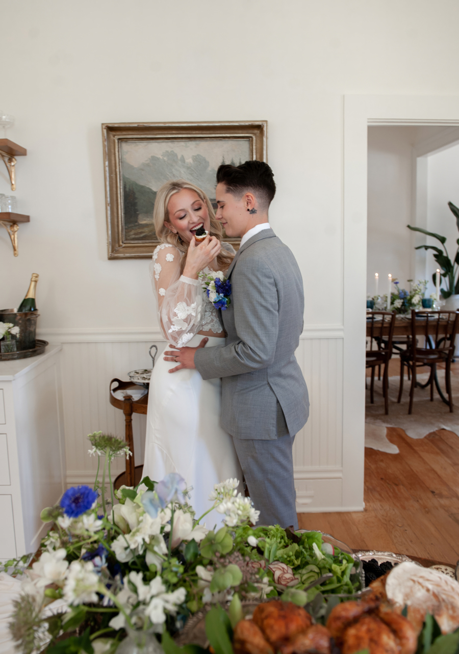 We first set our eyes on Shelby + Paige when their photographer, Captured by Kay, submitted their wedding to us for our Summer/Fall 2023 issue, and we were instantly smitten! Their wedding was overflowing with love, with a generous helping of fun (cue the blow-up dinosaur costumes for two members of their wedding party for their grand entrance!); so when we were looking for a real couple to model specifically for this shoot, we instantly thought of Shelby + Paige. We’re so honored to have featured not only their wedding but also to have them star in this styled shoot—here, you get to learn more about this delightful couple!