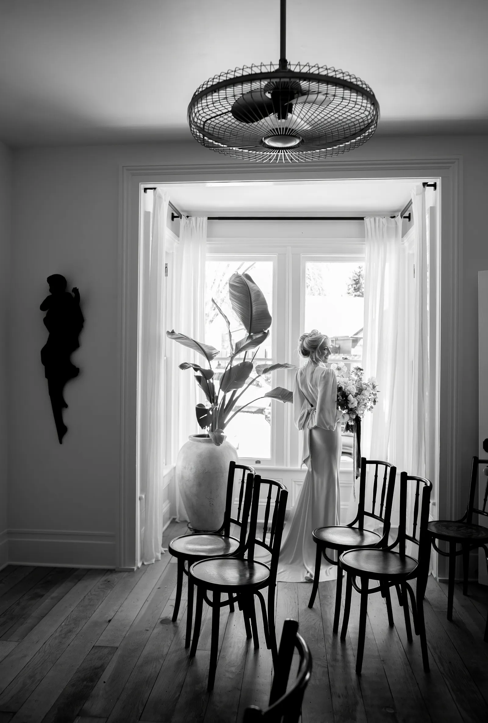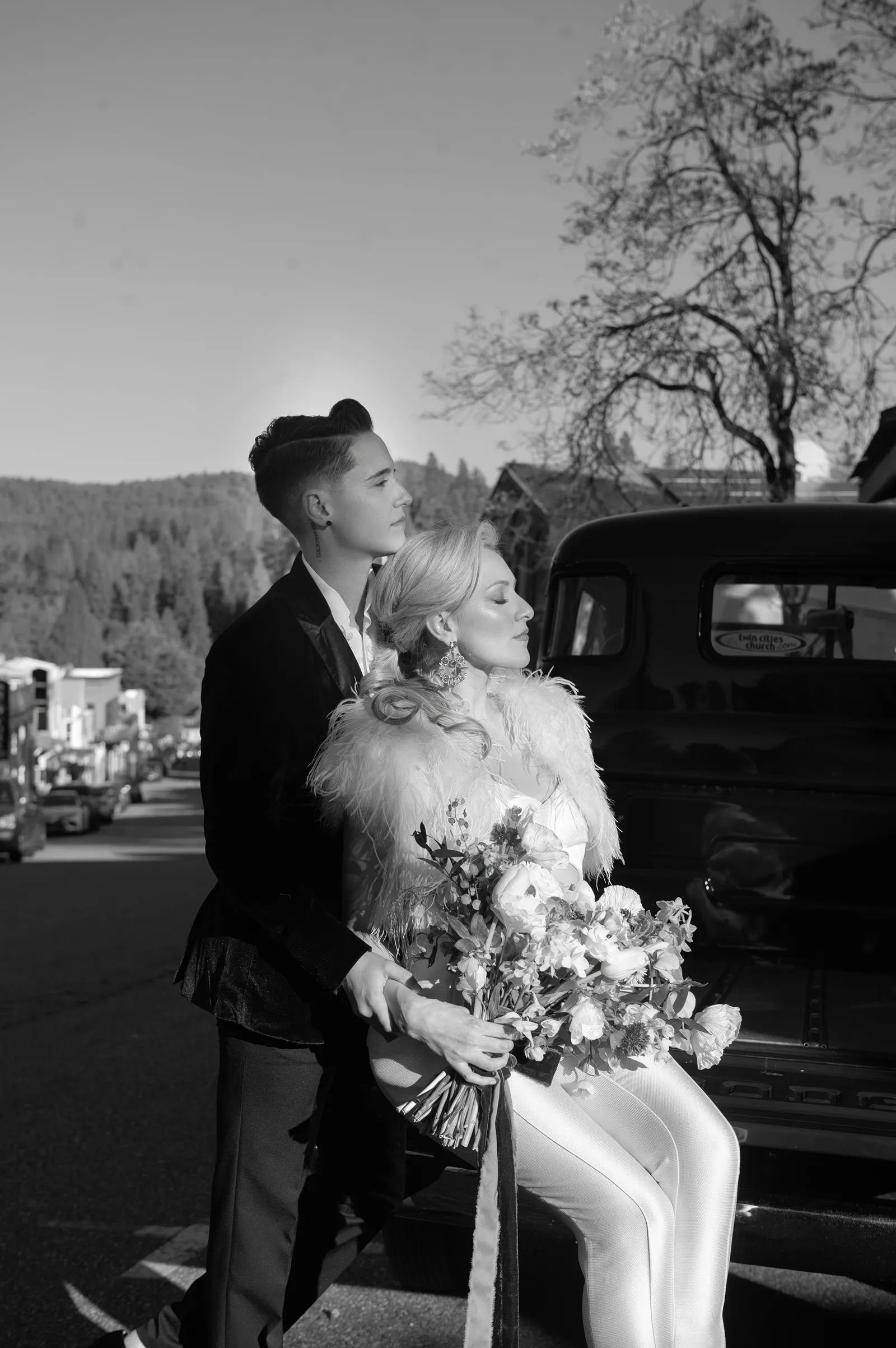 On Shelby: Earrings by Adora by Simona; Feather Shrug from Perfect Dress Party;Pantsuit from Brides for a Cause
