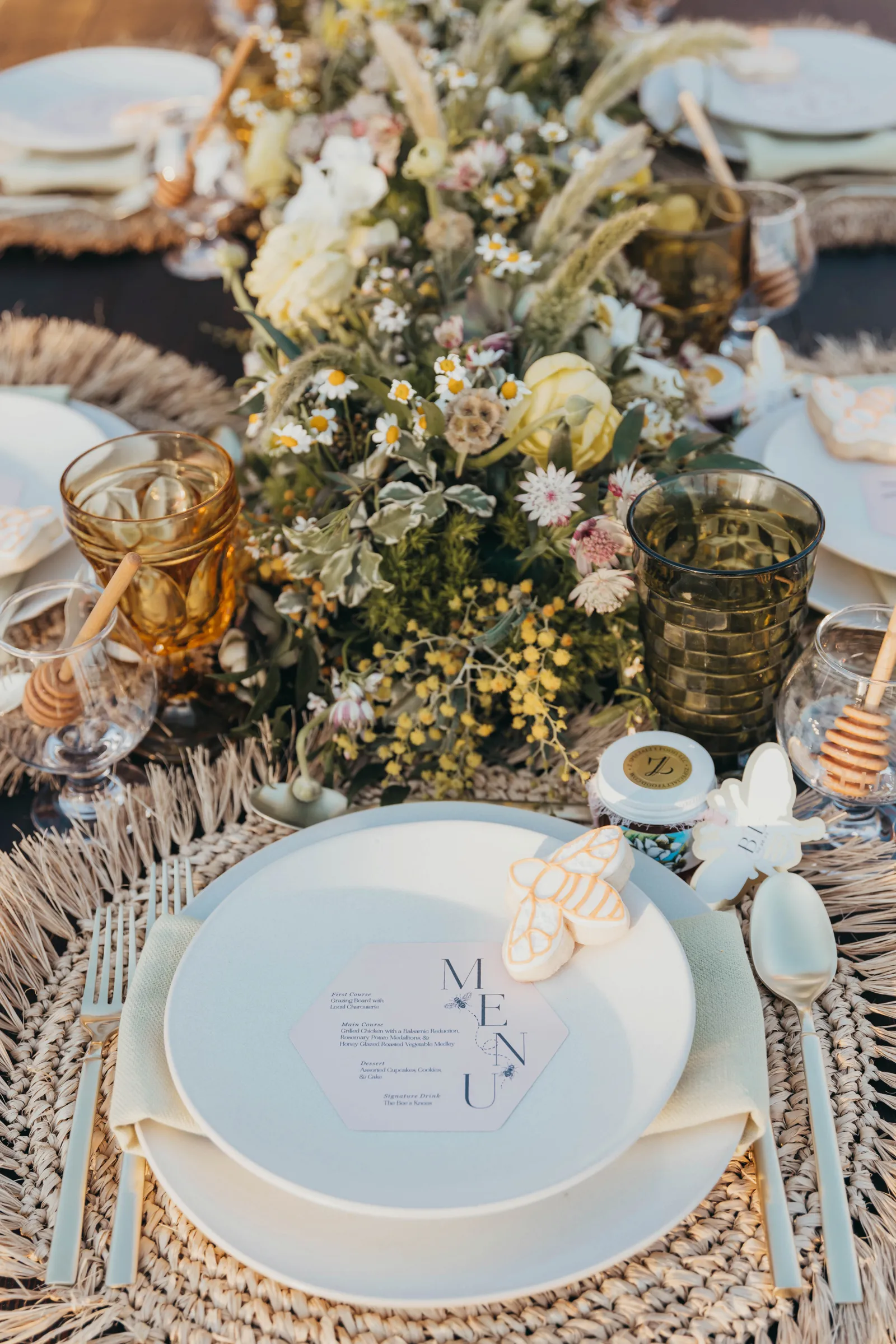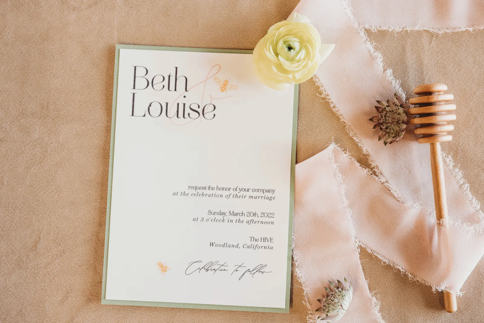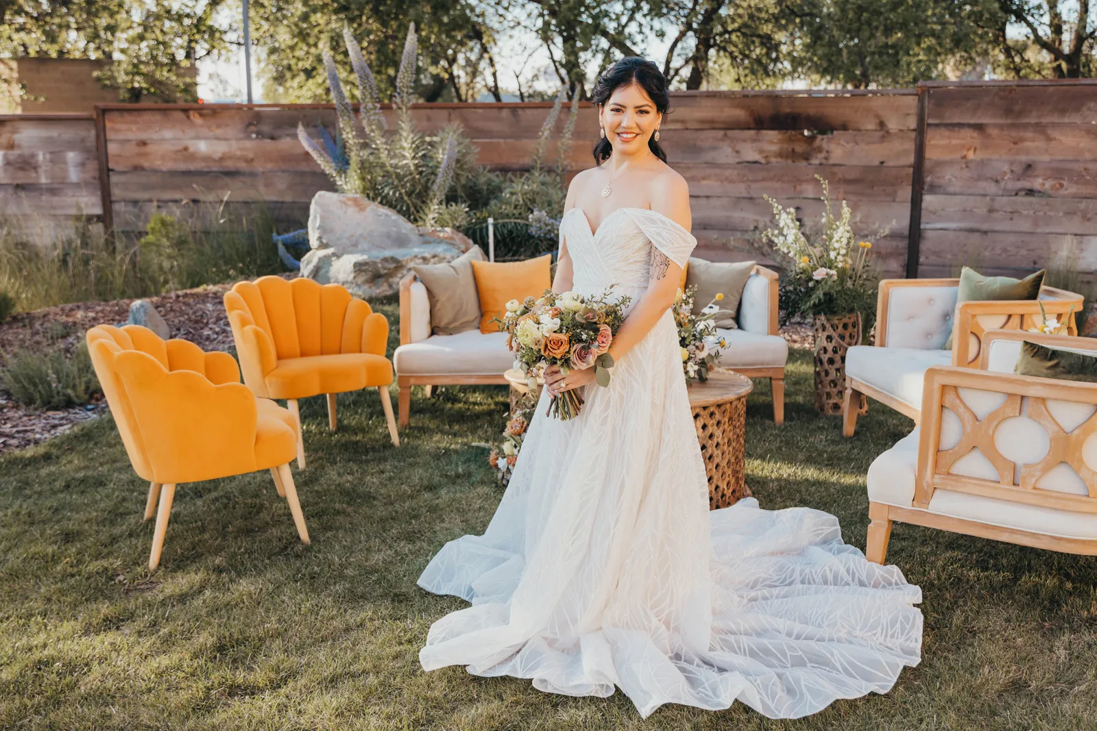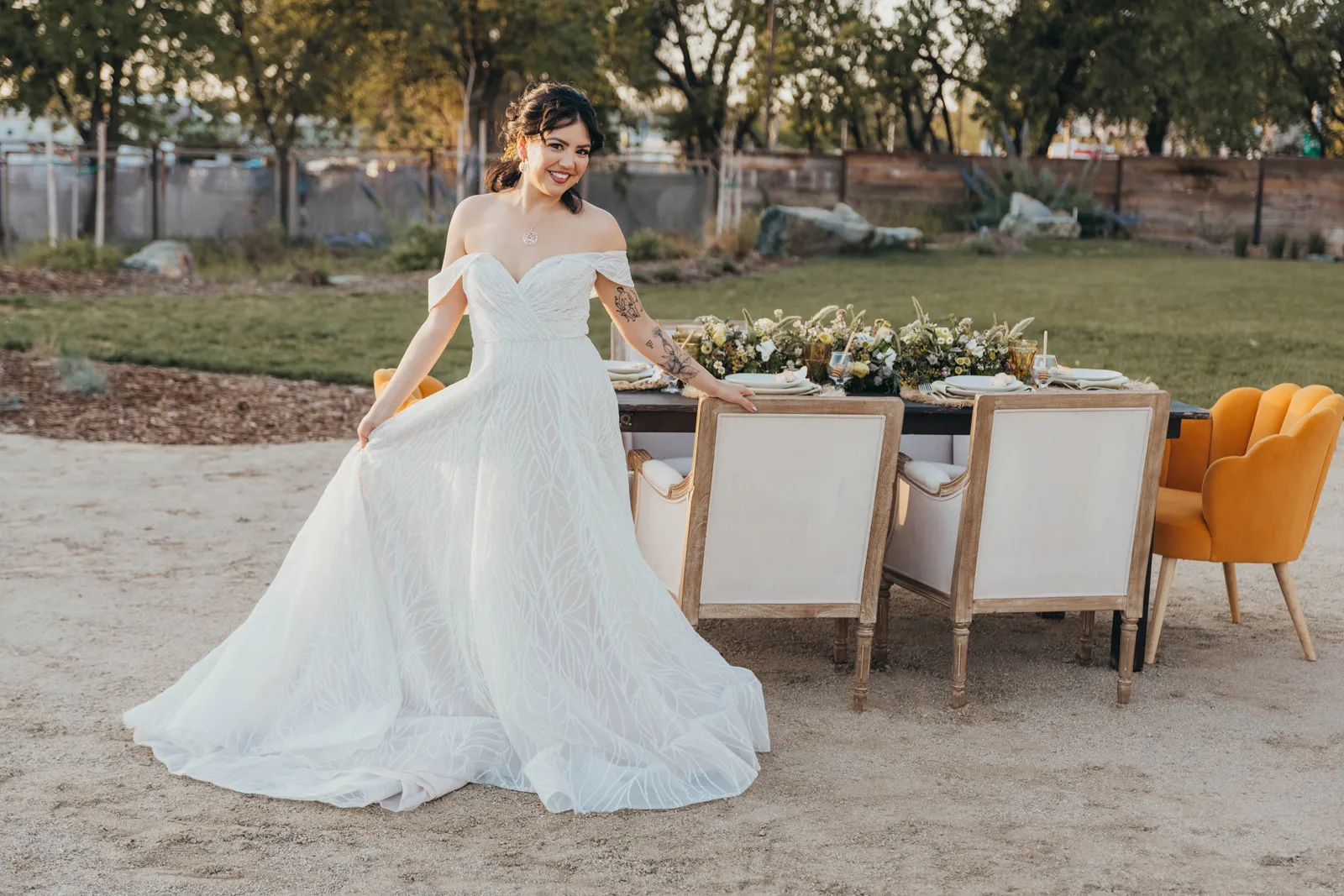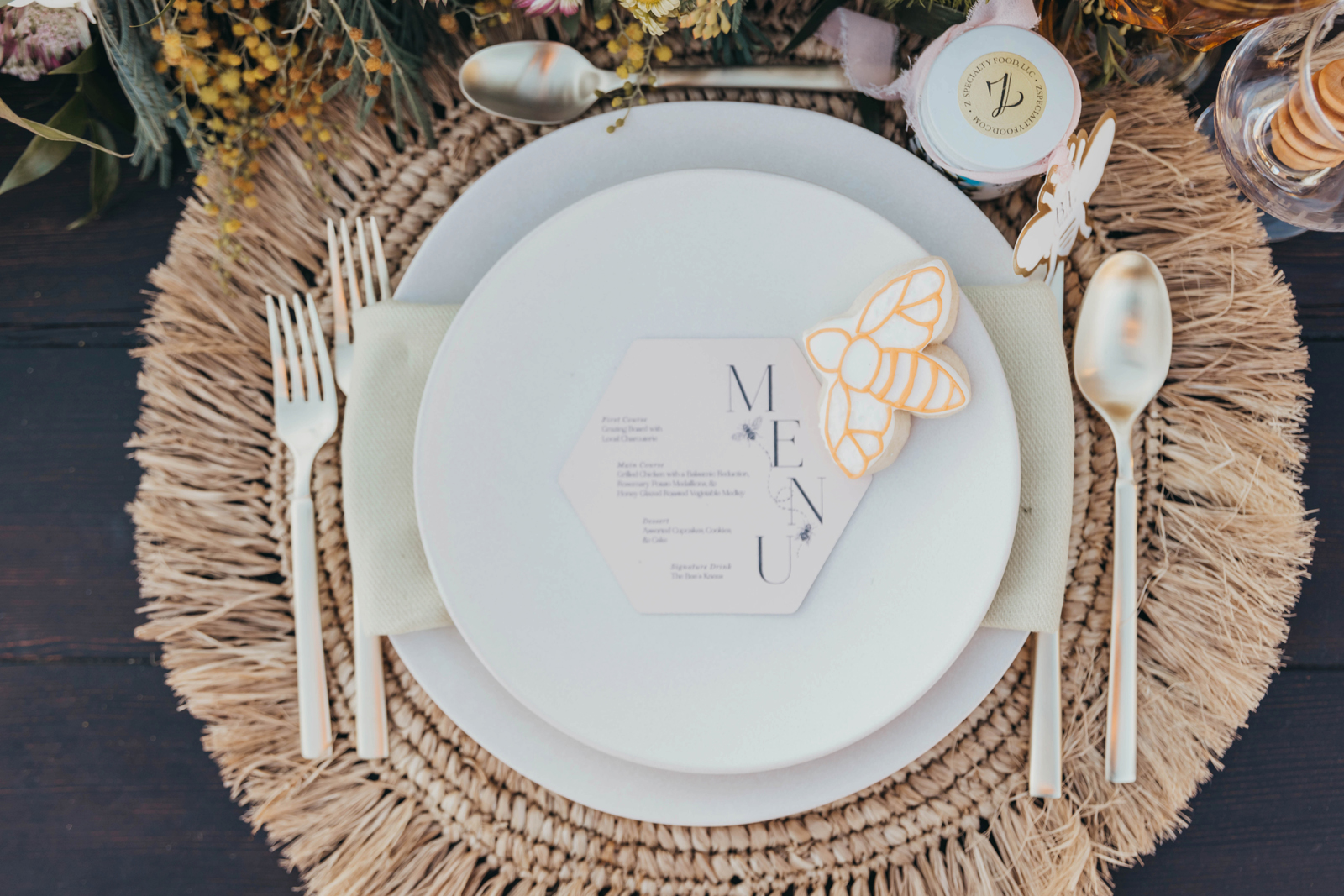 Happy Sunday, everyone! It’s time for yet another Submitted Styled Shoot fresh from our Summer/Fall #30 publication — and we’re just buzzed for you to see it! Set at The HIVE in Woodland, you can expect fun honeybee-themed decor and rentals (thanks Blossom Farm Vintage Rentals!), amazing flowers from Strelitzia Flower Co., and absolutely stunning gowns, courtesy of Brides for a Cause. Keep scrolling to find some more inspiration. Happy Sunday, and happy reading!