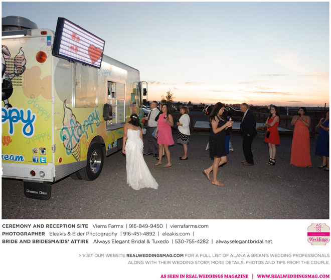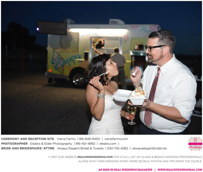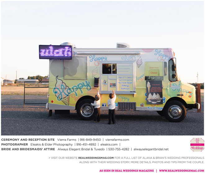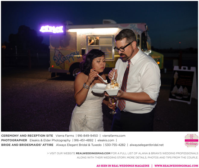 Alana and Brian both wanted an alternative to wedding cake, so they went to a food truck meet-up to see what choices were available. Enter Steve with the Happy Cowmobile. “It was awesome,” Brian says. At the wedding reception, Steve made sundaes for everybody and a gigantic sundae for the bride and groom to share.