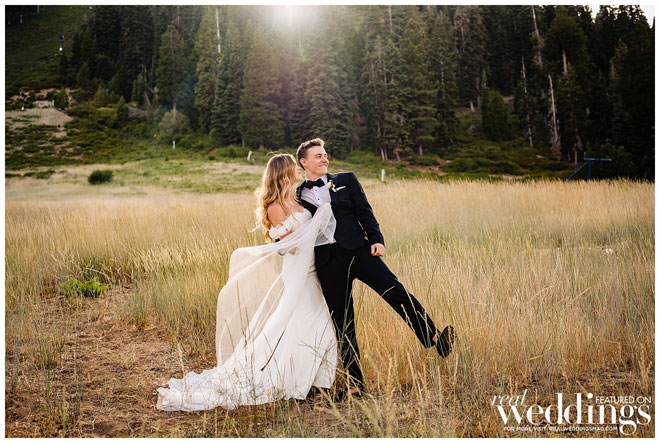 Though the wedding was held on one of Tahoe’s famously sunny summer days, Alex says the occasionally breezy gusts across the lake made the day beyond memorable. “The weather was perfect during the whole day,” she says, “but out of nowhere, there was a huge gust of wind while we were saying our vows. It was special and felt much bigger than us.” After the ceremony, the two took advantage of their venue’s location directly across from Homewood Ski Resort and took photos together, framed by golden grass and towering pine trees.