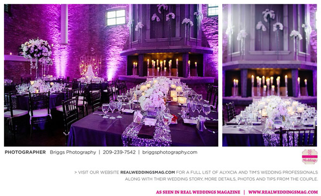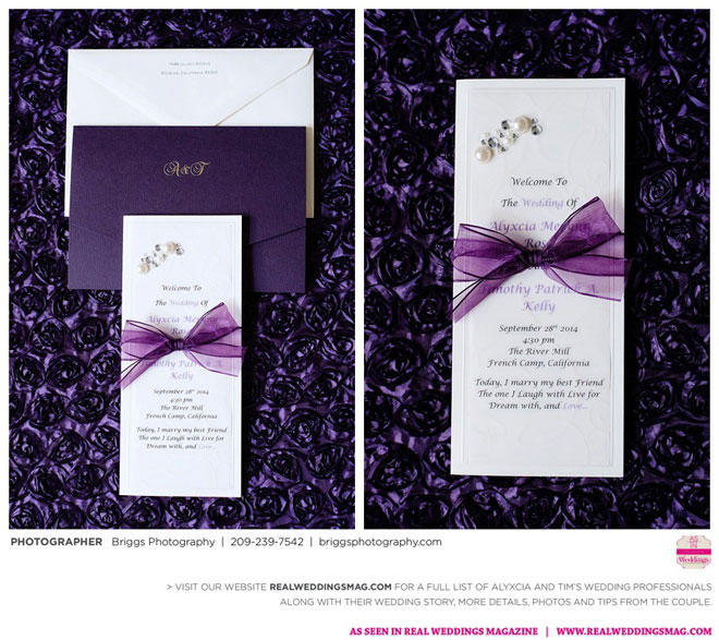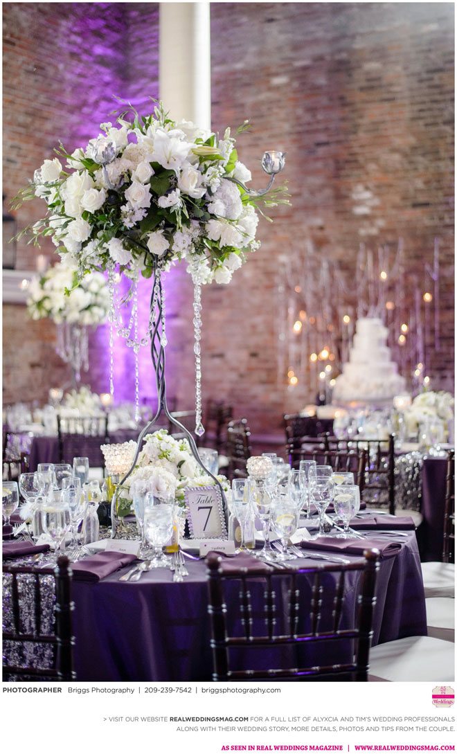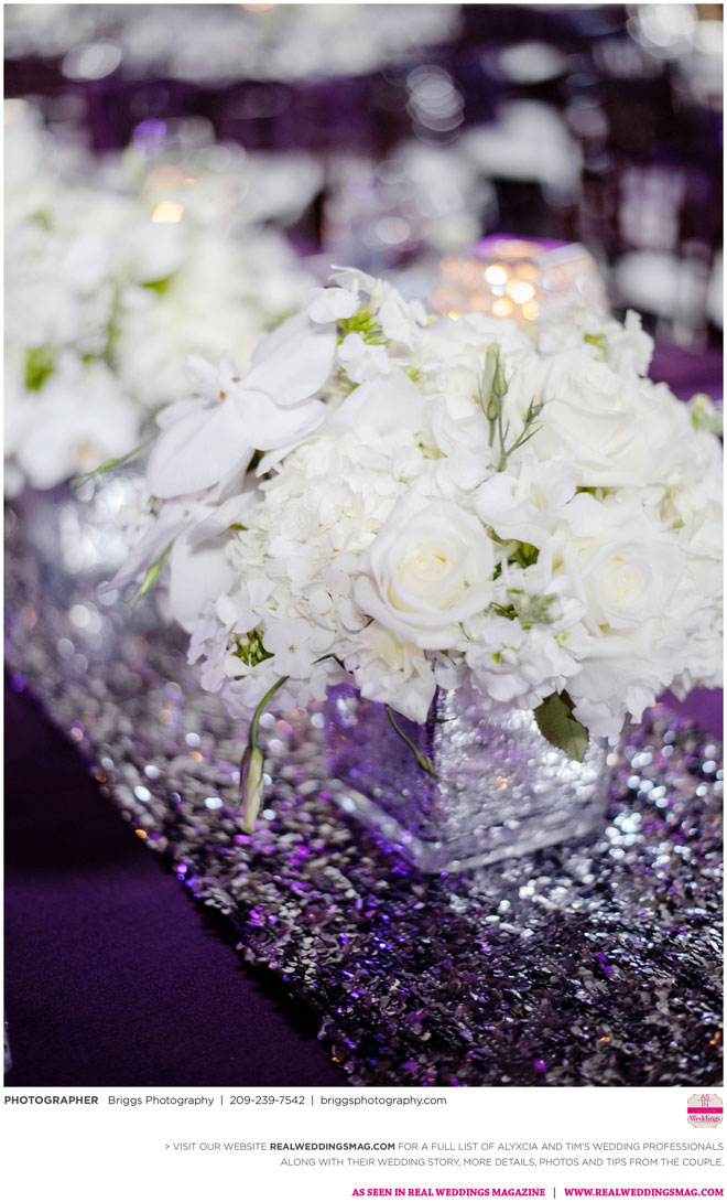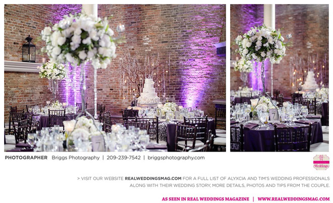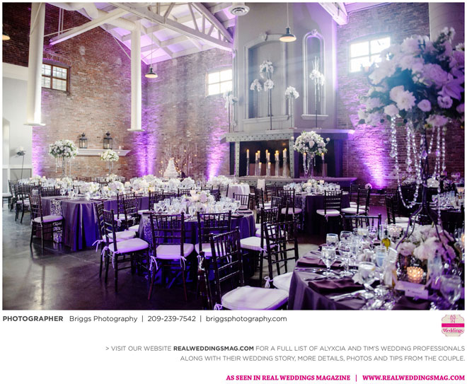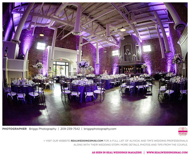 The couple decided on a long engagement and planned their magical day for early fall at the historic and romantic River Mill in French Camp. The bride had a specific vision for the romance she wanted to convey in the setting, and made the dream a reality with abundant flowers in shades of white and purple, and theme lighting that bathed the indoor venue in a magical violet hue. The attention paid to the interior turned out to be even more important, as an ill-timed storm forced the ceremony inside instead of outdoors as planned, which “ended up being the most romantic setting,” Alyxcia says.