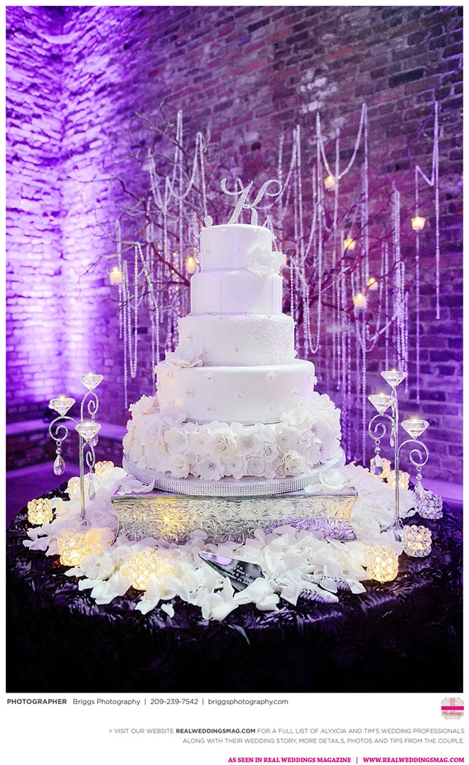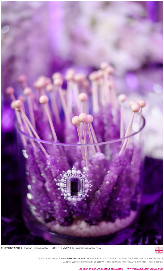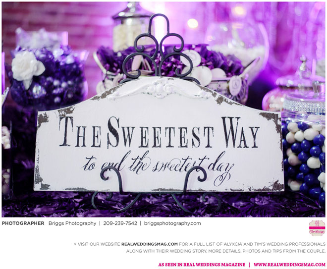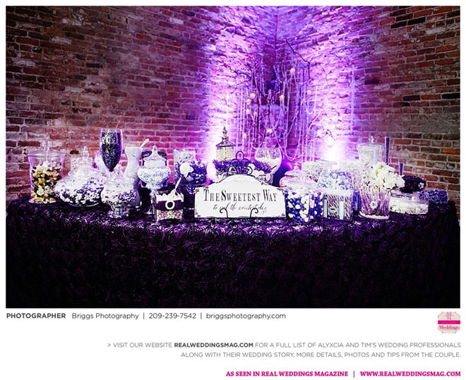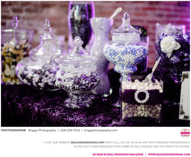 We had a candy bar and all of the candies were white and purple. Our cake was strawberry swirl (with fresh strawberry filling) and triple chocolate (with raspberry compote filling). With buttercream icing, the cake had icing flowers and crystals all over.