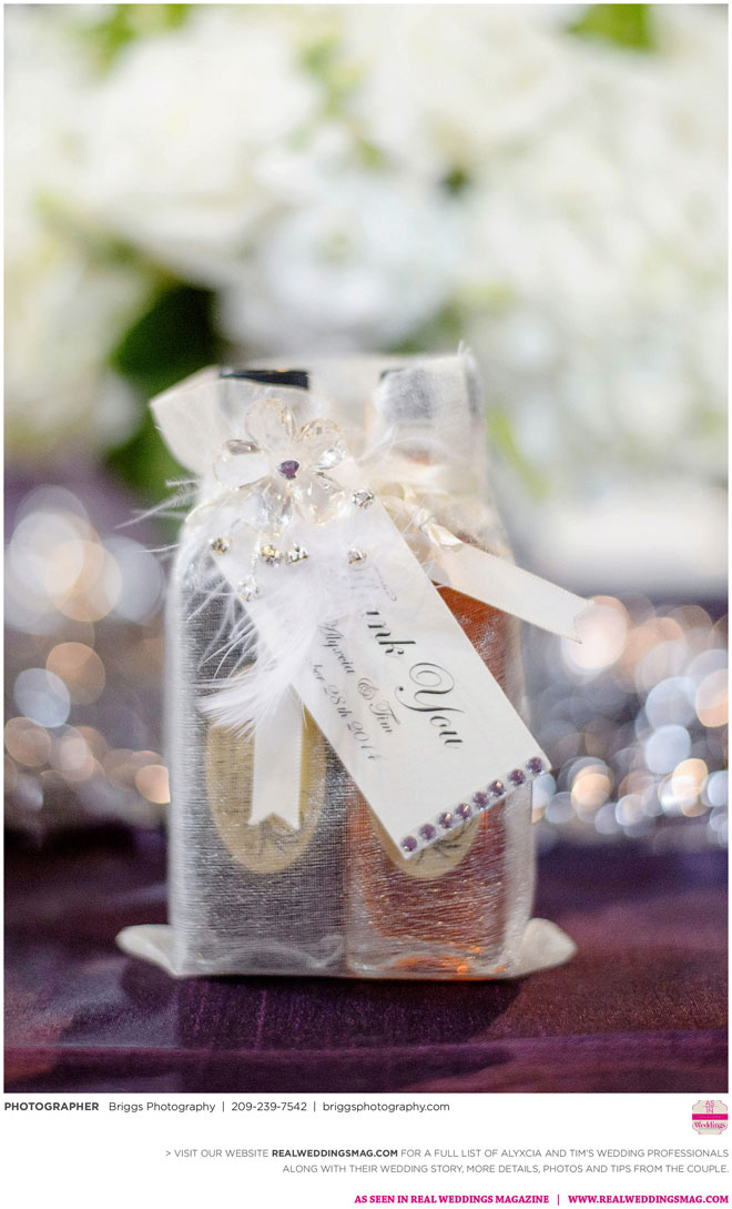 We had small olive oil and balsamic vinegar in cream bags, decorated with crystals. We purchased the olive oil and balsamic vinegar from The True Olive Connection (Santa Cruz, CA), and my mom and I put the bags together with decorations we bought at Michaels.