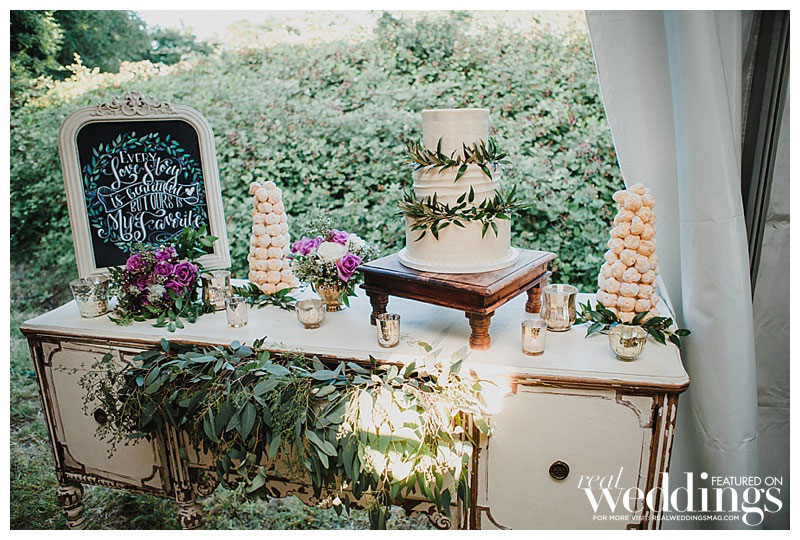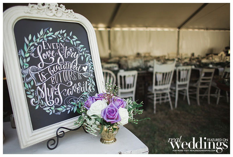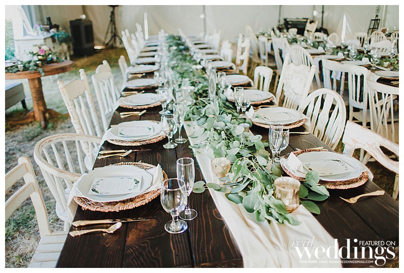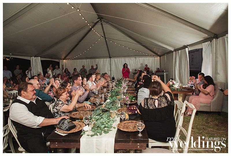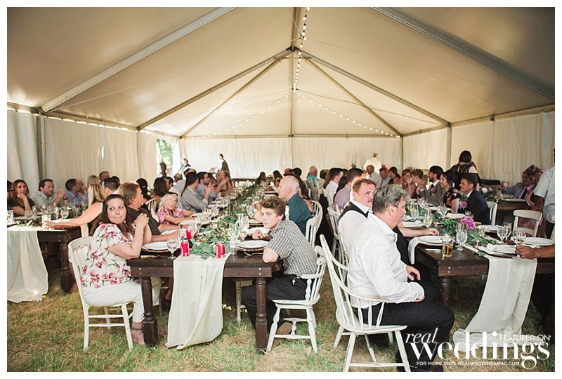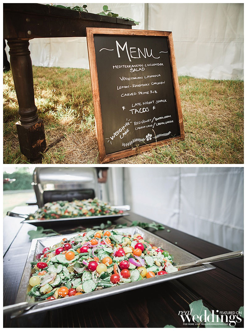 “We settled pretty instantly on the venue: our home,” she says. “I suggested hiring a wedding planner since we had a lot of landscaping and home improvements to focus on before the big day, and I was pregnant. Roger worked evenings and weekends to get the property wedding-ready in just four months!” Amanda envisioned an outdoor wedding under a tent with a romantic and rustic theme. “It turned out spot-on in terms of what I wanted,” she says.