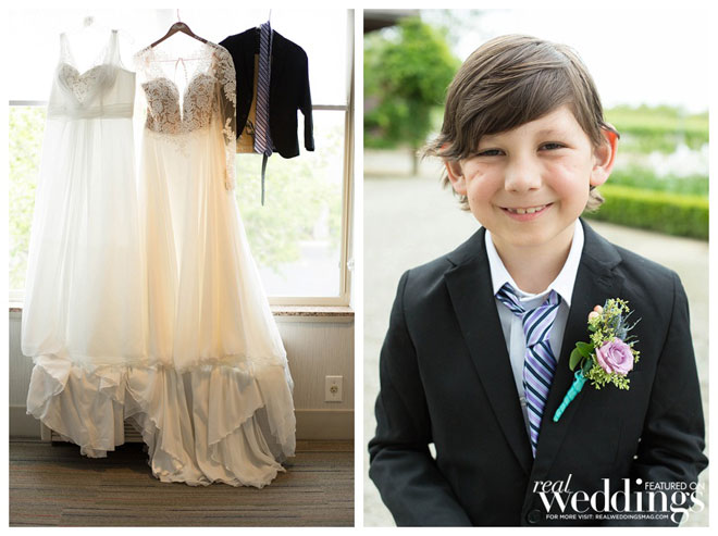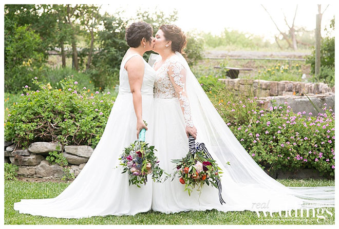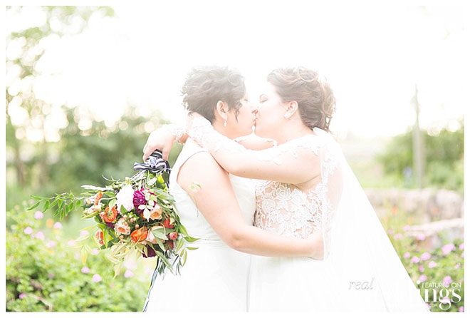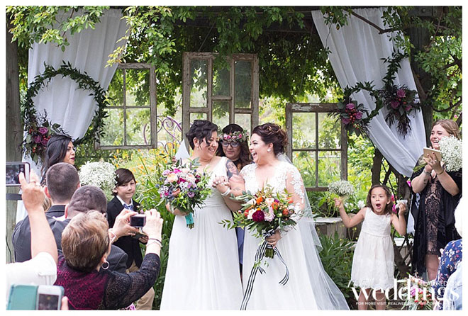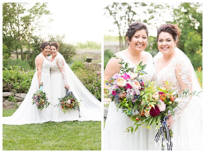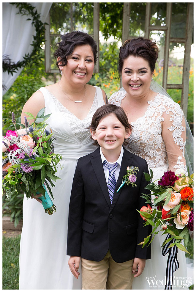 Mandy proposed to Vanessa on a hiking trail behind their first home. Mandy told Vanessa that they were taking pictures for Aiden’s sixth birthday, but really she had her ring on a cupcake, to propose. “Aiden got a little proposal cupcake, too,” the couple shares. “The whole thing was photographed by Nikki from Nikki Hancock Photography, and [was] one of the most special moments.” Vanessa proposed to Mandy soon after at Grace Patriot Winery, where she took Mandy for a walk through the vineyard. “It was beautiful, intimate and perfect,” says Mandy. “We both cried and couldn’t wait to get started planning our future.”
