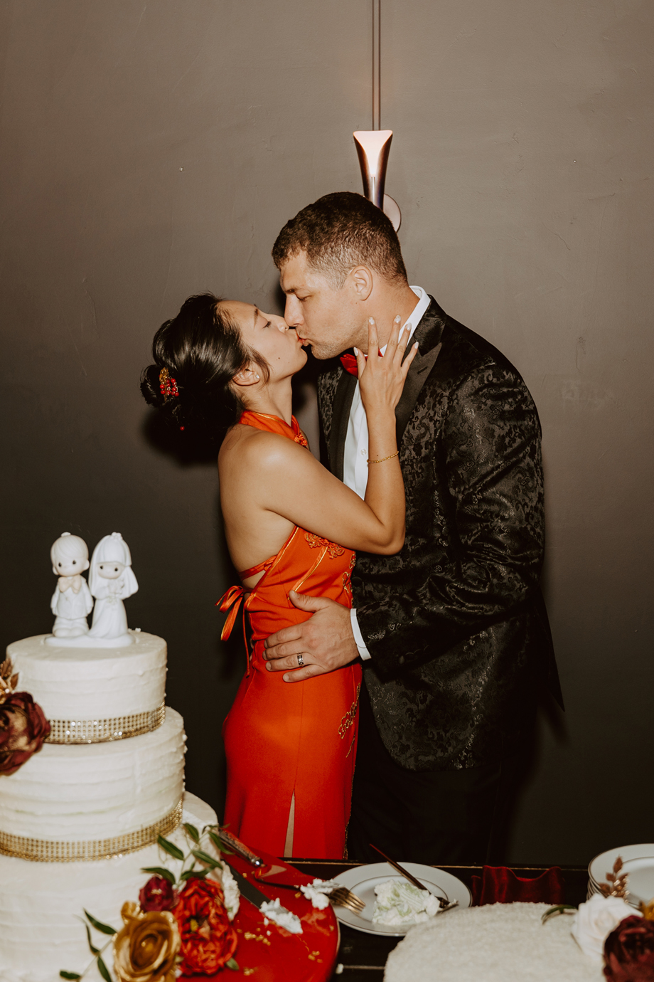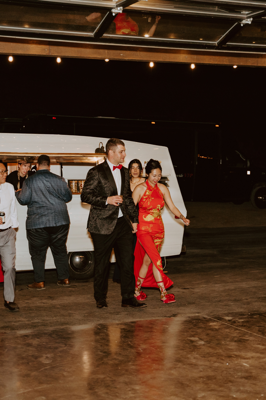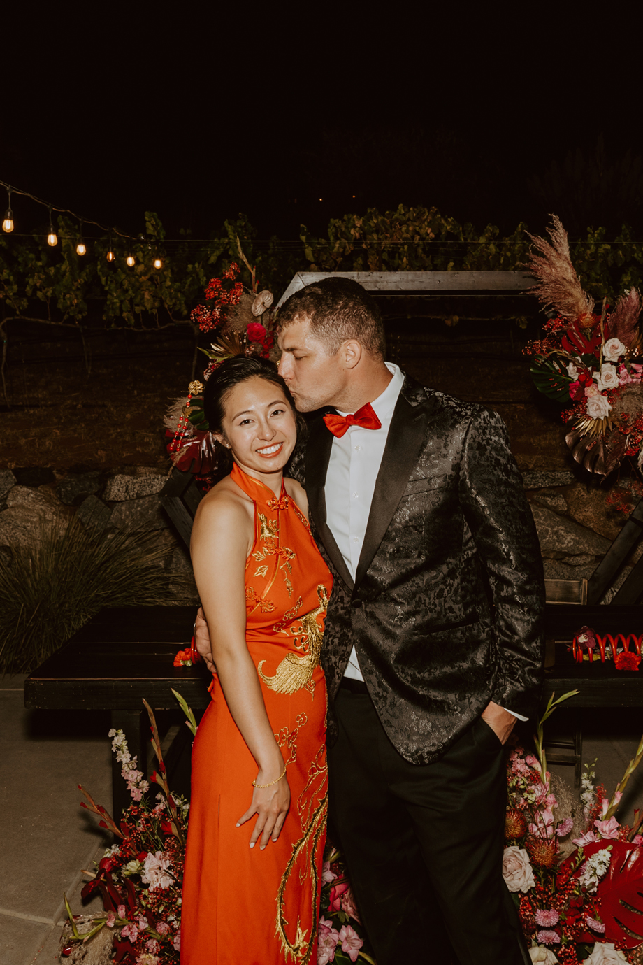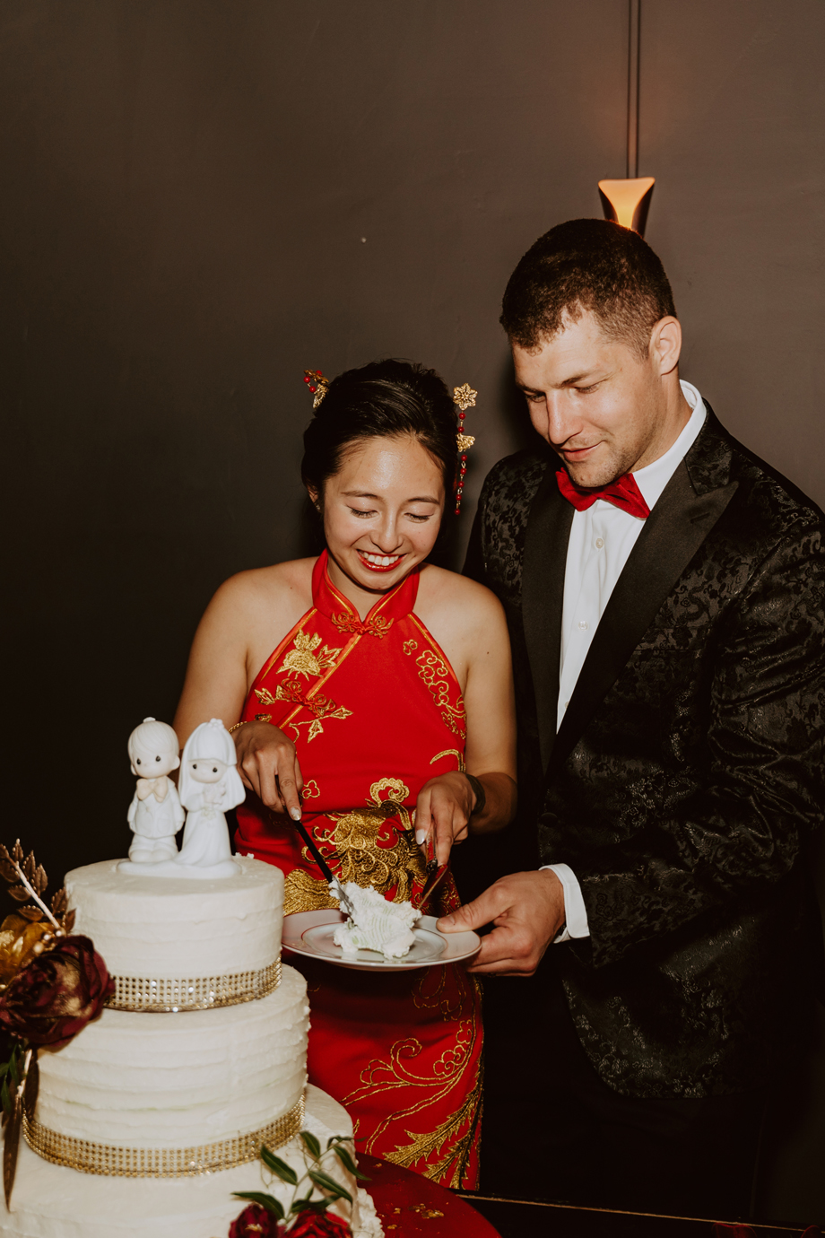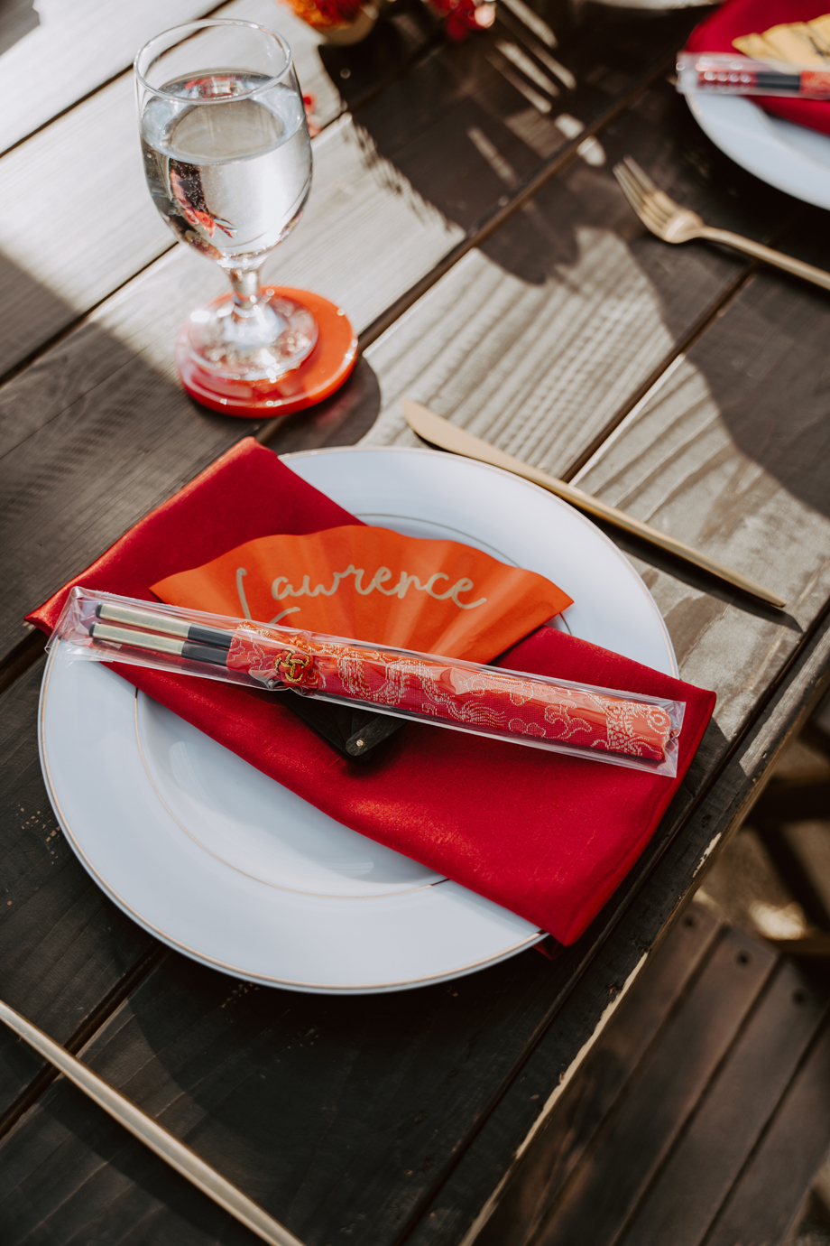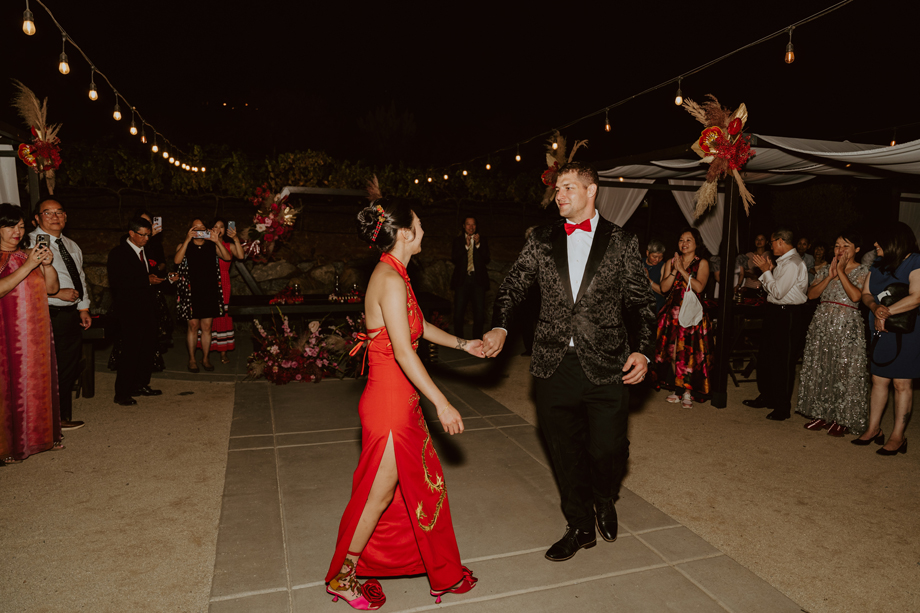 I wanted to subtly incorporate my family’s Chinese heritage into our wedding celebrations. The night before, we held a private tea ceremony to honor the elders and share a special moment with my family. On the wedding day, we served traditional Chinese dishes, including a whole roasted pig and Peking duck bao as hors d’oeuvres during the cocktail hour. Midway through the reception, I changed into a traditional red qipao dress, matching my husband’s custom qipao suit, to close out the evening in style!