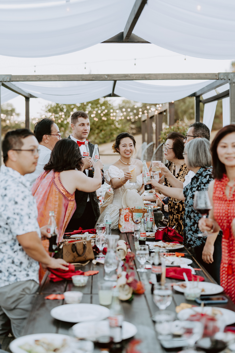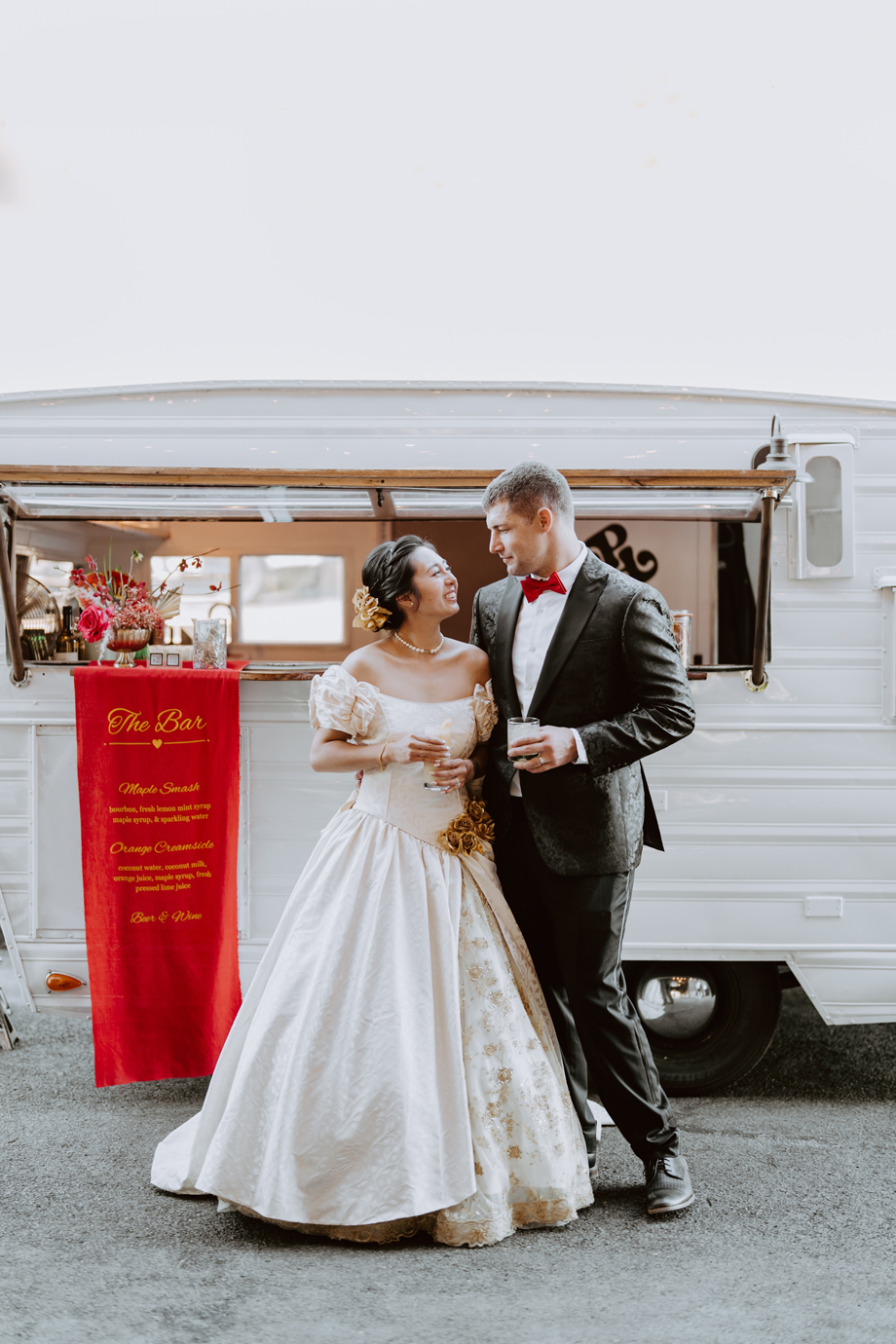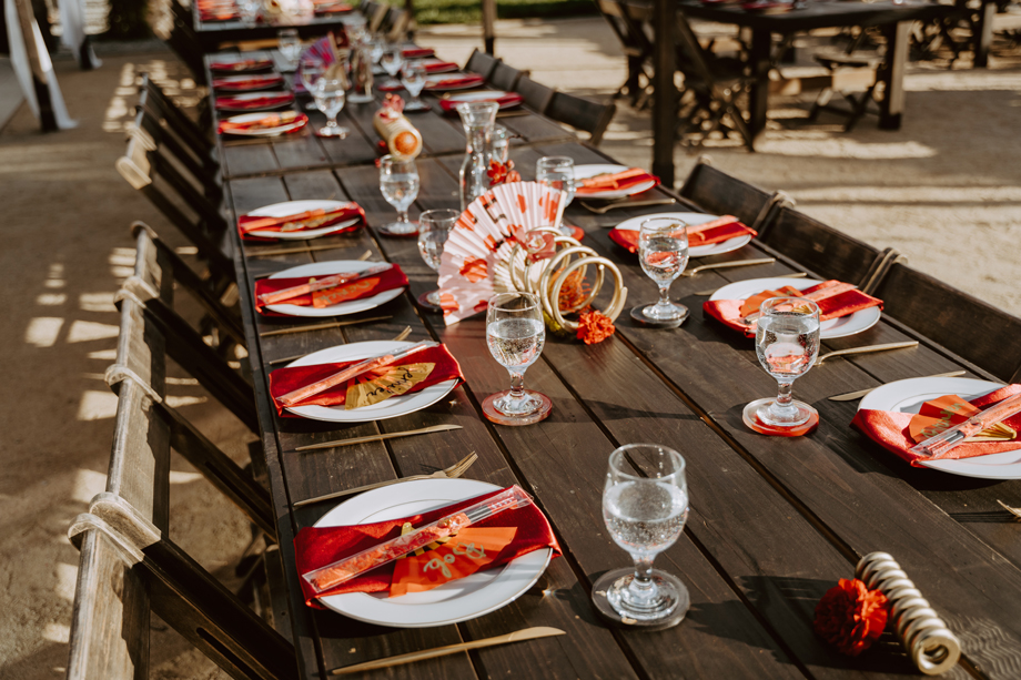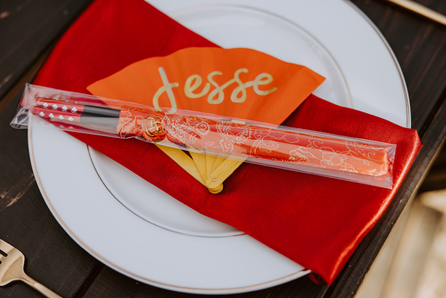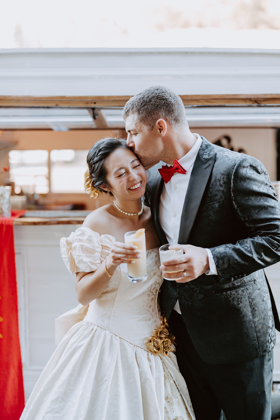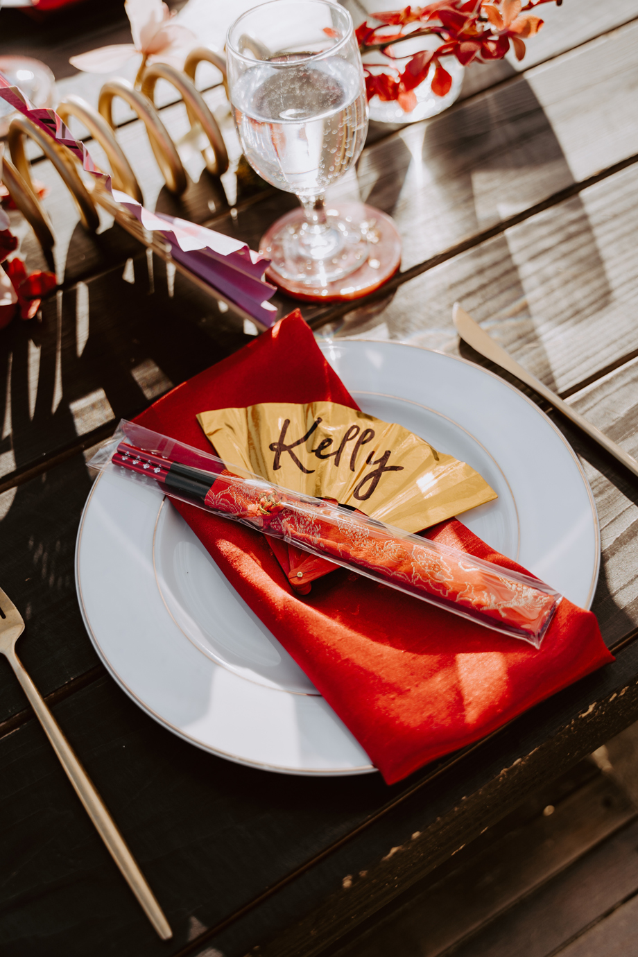 I wanted to subtly incorporate my family’s Chinese heritage into our wedding celebrations. The night before, we held a private tea ceremony to honor the elders and share a special moment with my family. On the wedding day, we served traditional Chinese dishes, including a whole roasted pig and Peking duck bao as hors d’oeuvres during the cocktail hour. Midway through the reception, I changed into a traditional red qipao dress, matching my husband’s custom qipao suit, to close out the evening in style!