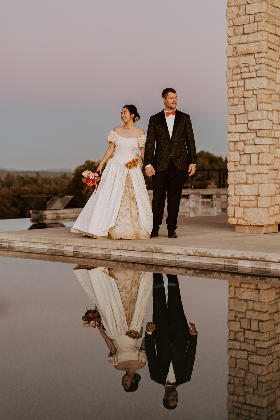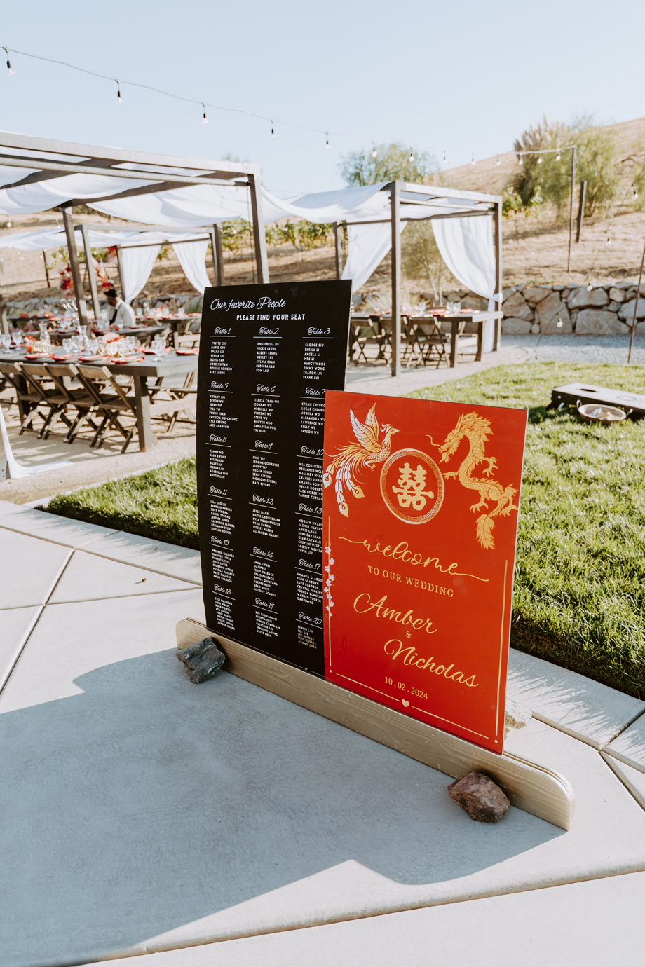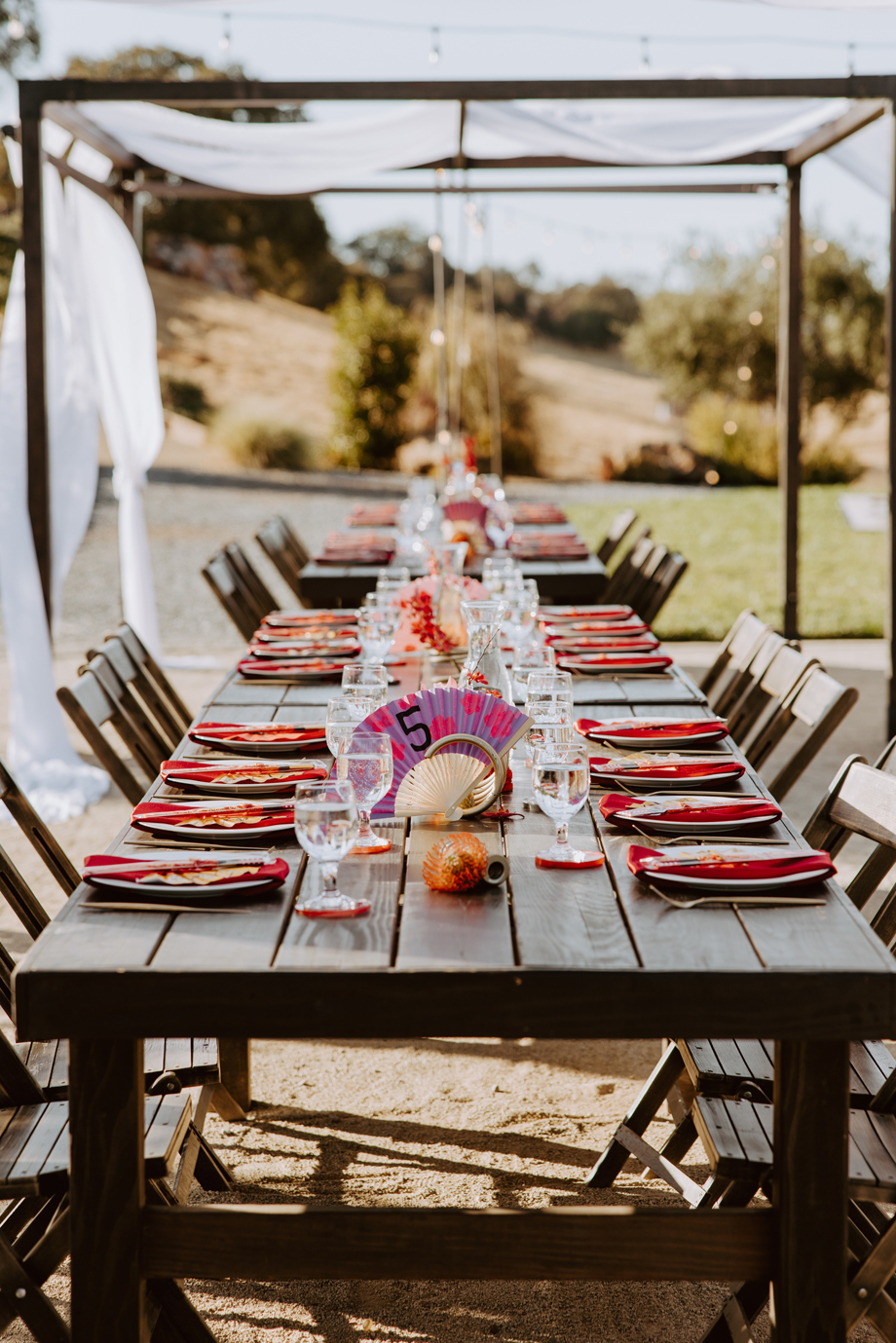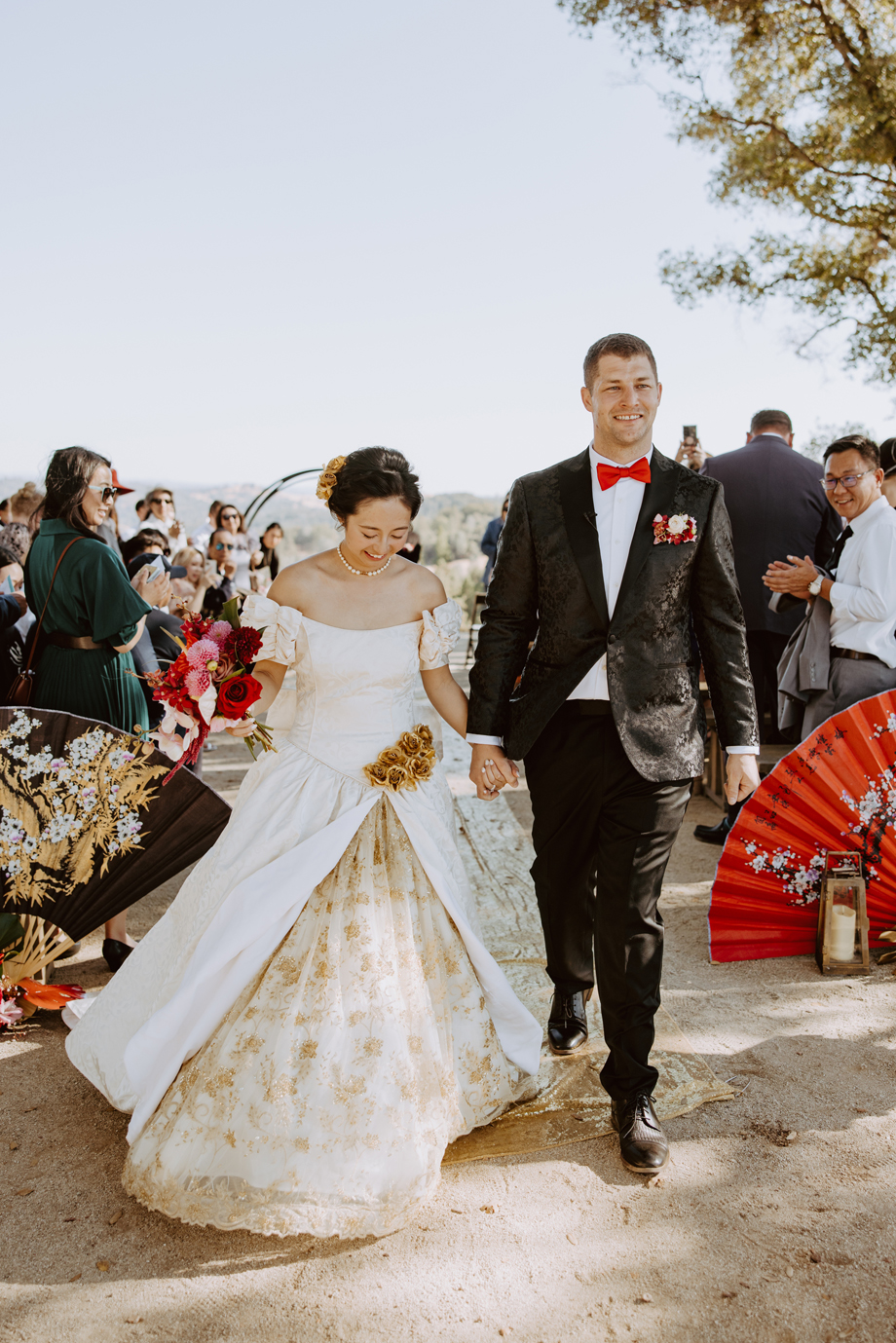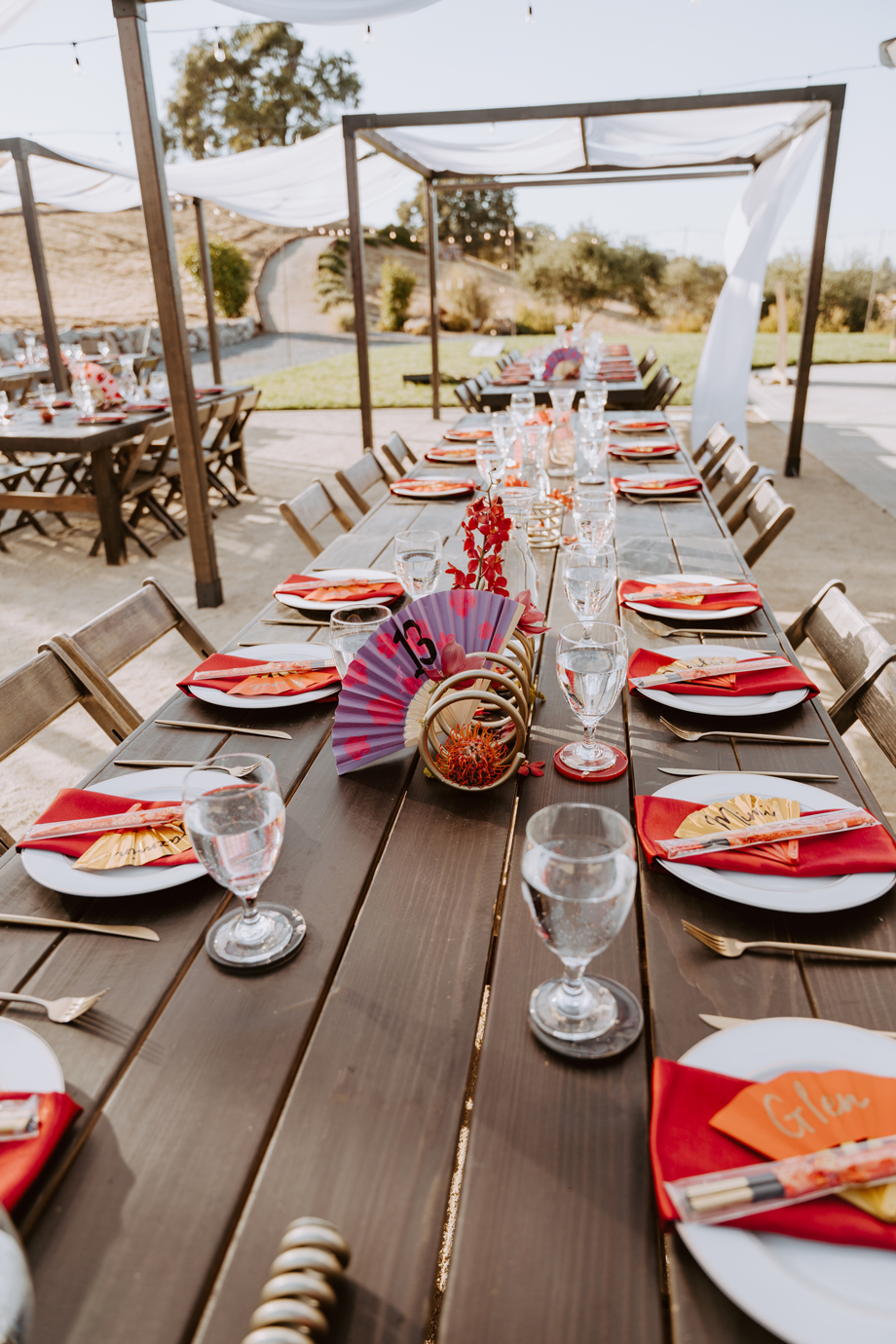 I wanted to subtly incorporate my family’s Chinese heritage into our wedding celebrations. The night before, we held a private tea ceremony to honor the elders and share a special moment with my family. On the wedding day, we served traditional Chinese dishes, including a whole roasted pig and Peking duck bao as hors d’oeuvres during the cocktail hour. Midway through the reception, I changed into a traditional red qipao dress, matching my husband’s custom qipao suit, to close out the evening in style!