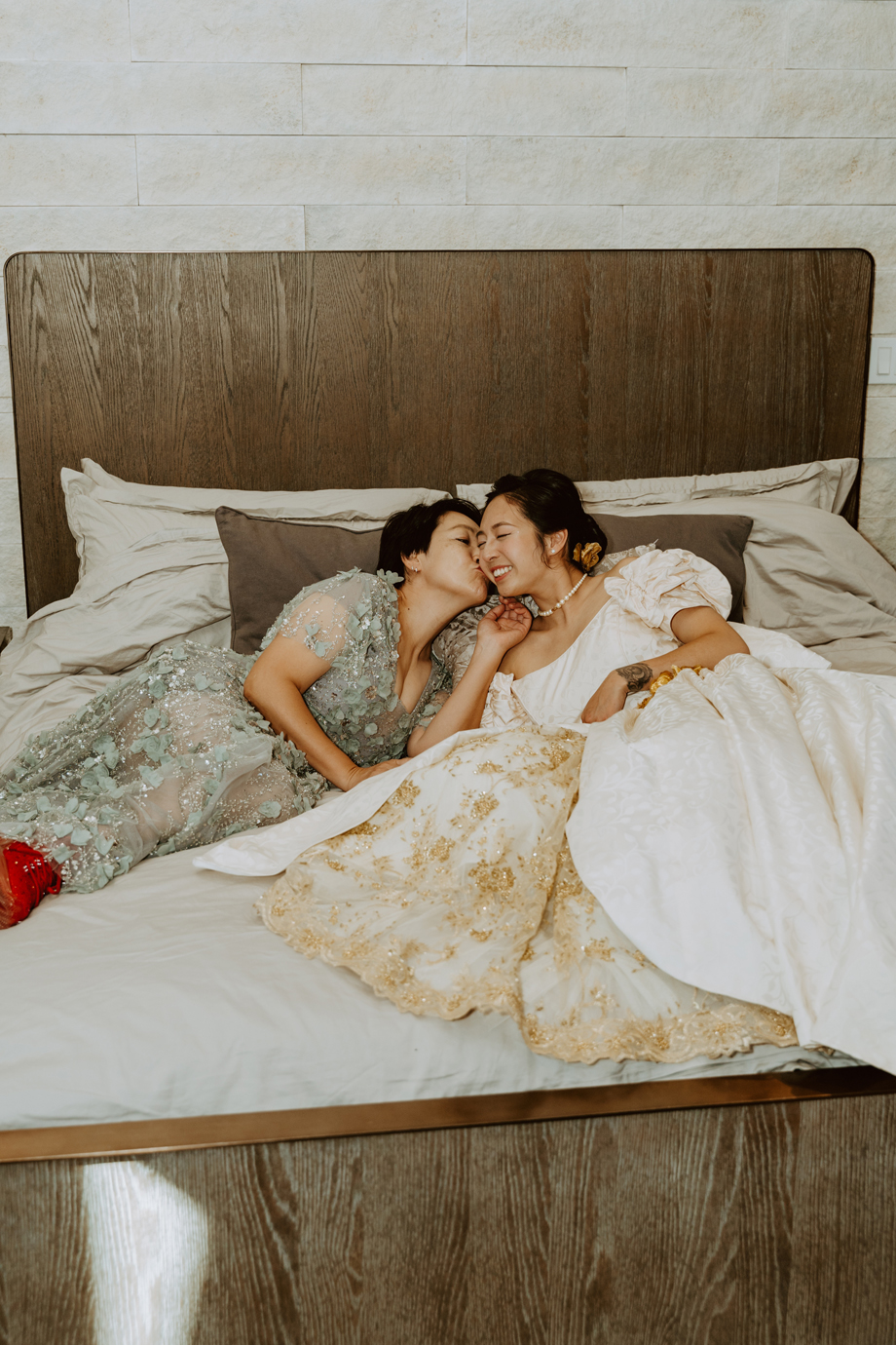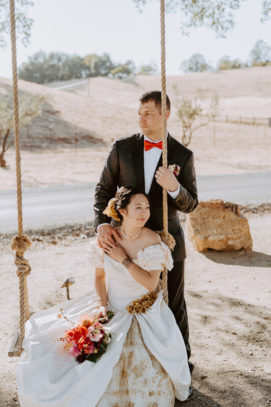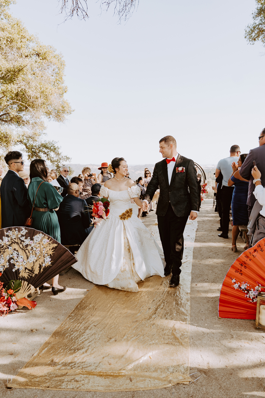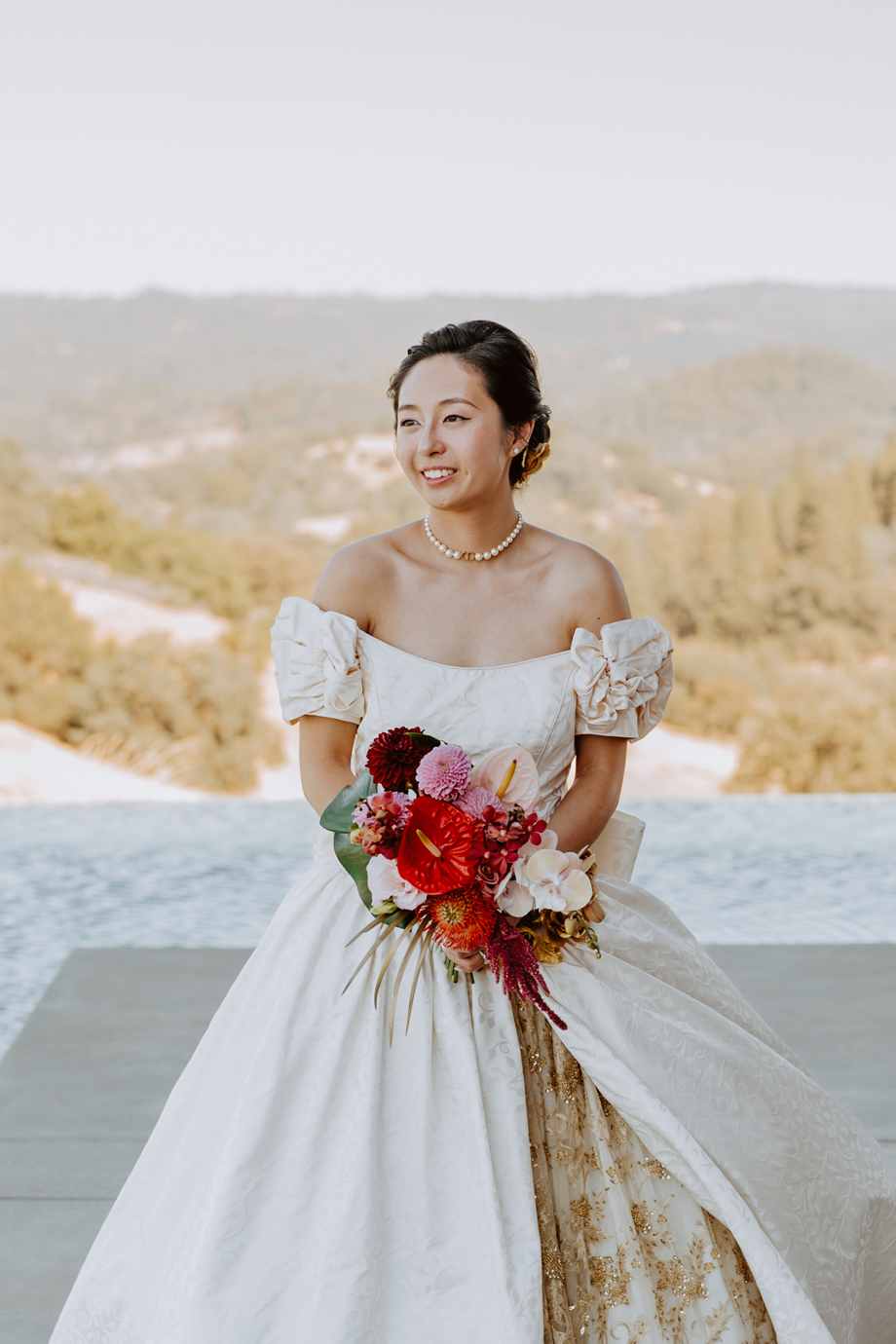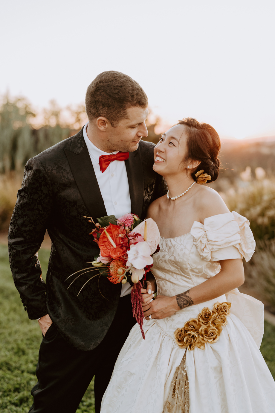 I wanted to subtly incorporate my family’s Chinese heritage into our wedding celebrations. The night before, we held a private tea ceremony to honor the elders and share a special moment with my family. On the wedding day, we served traditional Chinese dishes, including a whole roasted pig and Peking duck bao as hors d’oeuvres during the cocktail hour. Midway through the reception, I changed into a traditional red qipao dress, matching my husband’s custom qipao suit, to close out the evening in style!