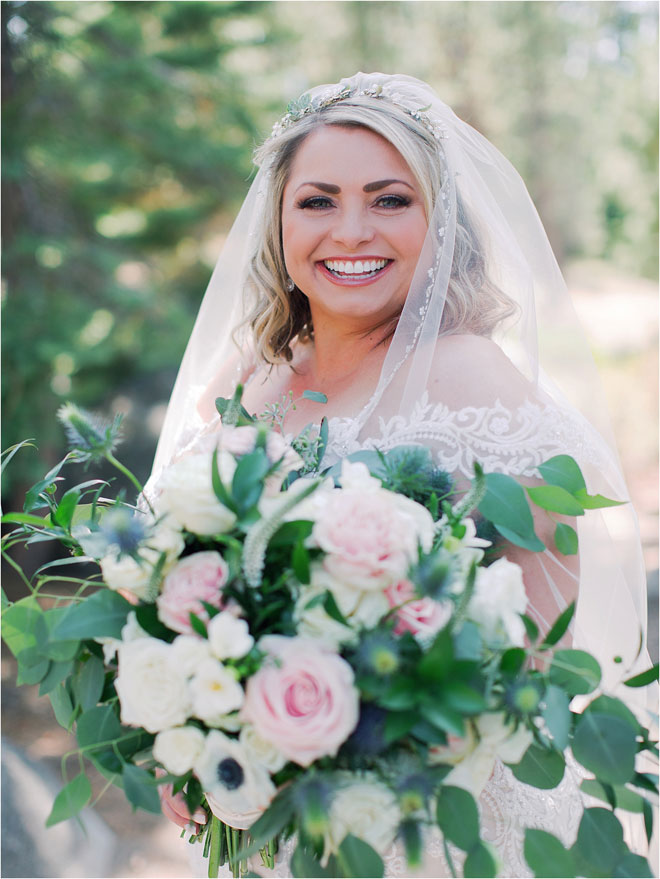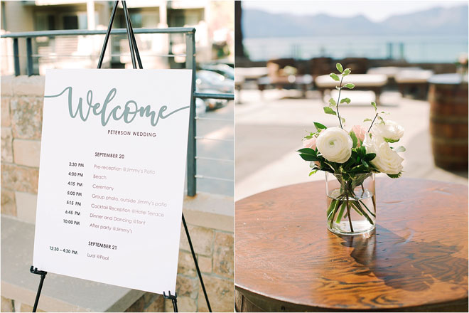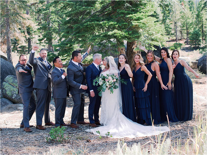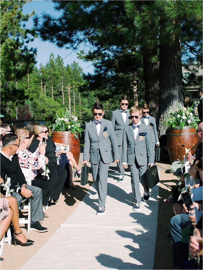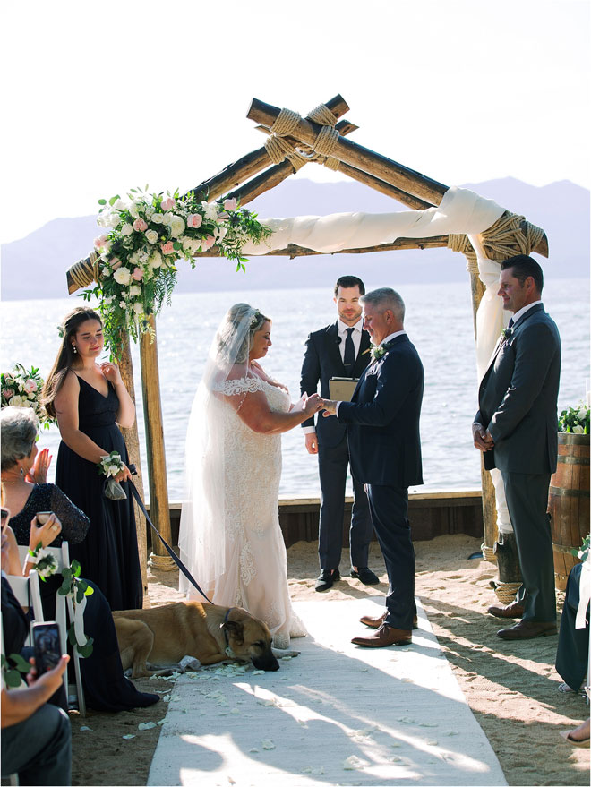 Andra and Billy planned a September wedding, both because she knew she wanted to marry in the fall and because a friend had gotten engaged at the same time, and the two wanted to space the celebrations out a bit to make it easy on their mutual friend group. Fortunately, The Landing Resort in South Lake Tahoe proved to be the perfect venue for an autumn wedding, especially as they were able to host their reception at the resort and host the ceremony across the street at the beautiful Lakeside Beach. They opted for a non-traditional ceremony incorporating a candle ceremony to honor Billy’s late father, security guard outfits and sunglasses for the ring bearers and a sparkly collar for the couple’s pooch, Allie. After the two were pronounced husband and wife, they walked back down the aisle under a cloud of bubbles blown by their 100 guests.