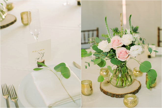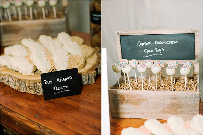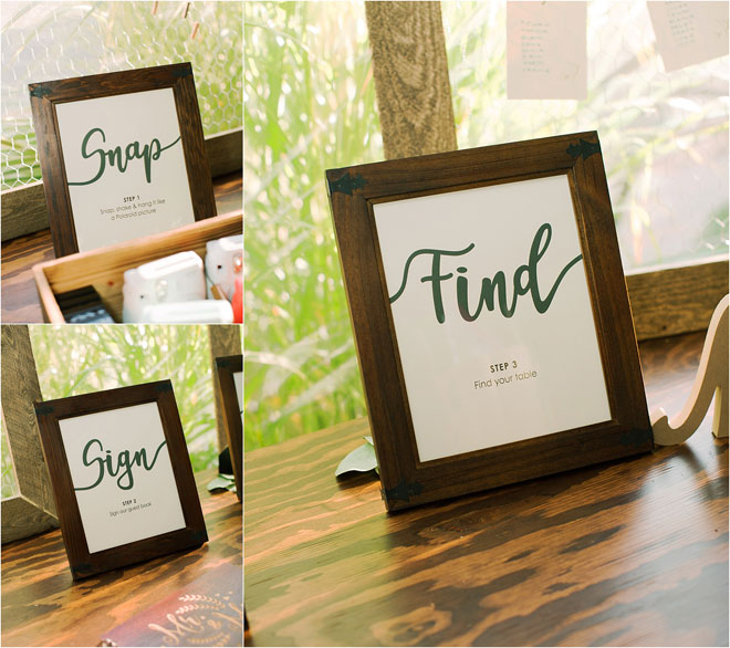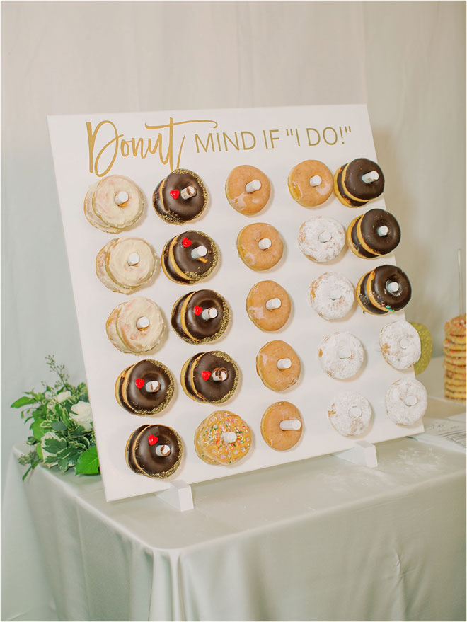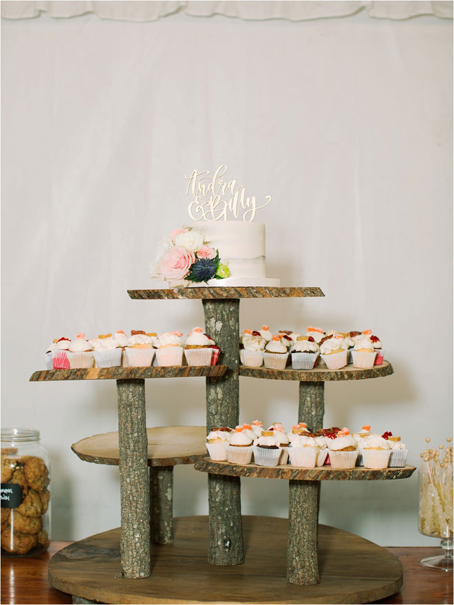 After that, it was on to the cocktail hour and reception, where Andra and Billy planned plenty to ensure their guests had an excellent time long into the evening. “We did Polaroid cameras and had everyone take pictures at the welcome table as they entered, and put them up on a big wood frame of chicken wire. That was so fun for everyone and we love all the pictures that were taken,” says Andra. In addition to a family-style meal at dinner, the reception included a sprawling dessert table with a wedding cake, cookies, candy, cupcakes and even a separate donut bar. Guests left the reception with pine tree sprigs bearing the message “Let Love Grow” to plant when they got home. “We get lots of status updates on how they’re growing,” says Andra. “And we love it.”