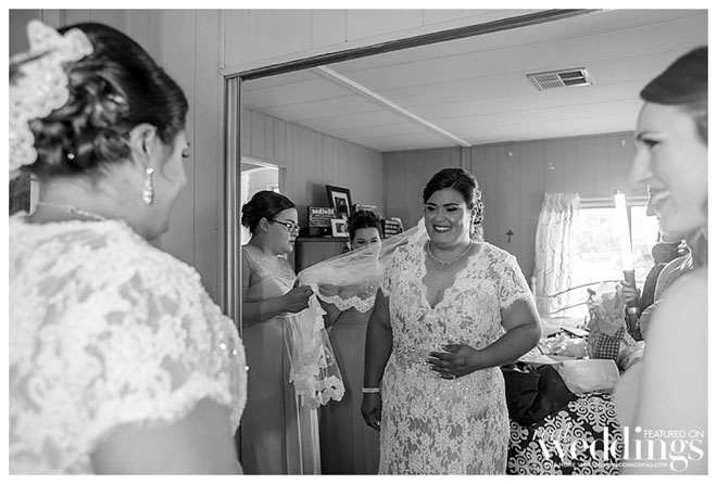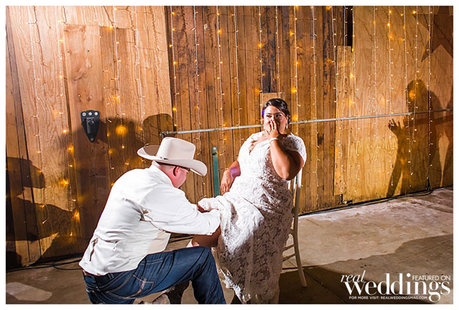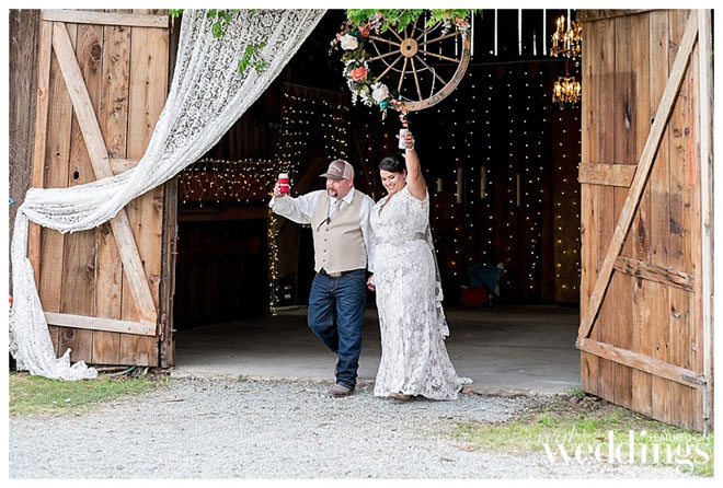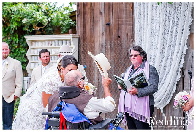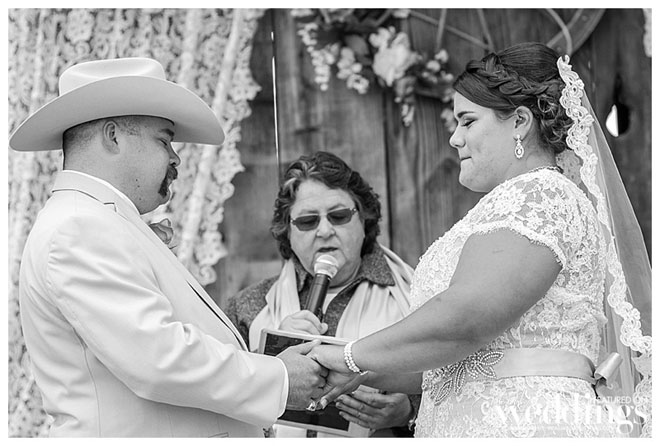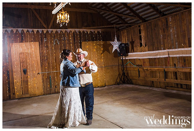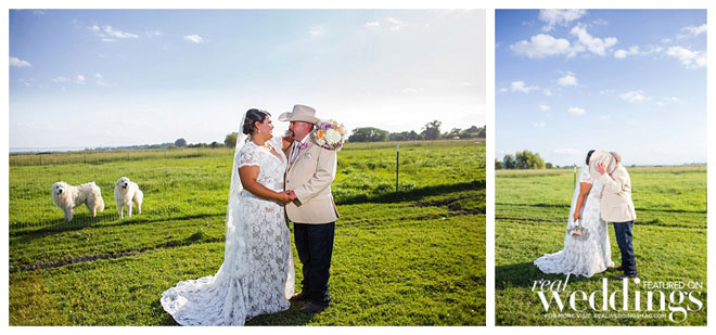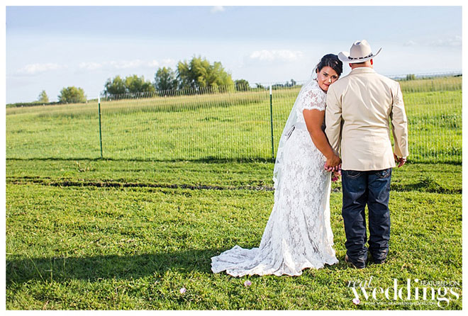 “We are simple people,” says Andrea, explaining she and John dressed modestly and comfortably for their wedding. He wore jeans, and his boutonnière, a rifle cartridge, was made by a family friend. She wore a simple yet elegant dress from Sparkle Bridal Couture, which was accessorized by her mother who spruced up the bride’s jacket with lace and rhinestones. John remembers, “how beautiful my bride was. I was in awe as she walked towards me.” And Andrea admired her groom, too, saying, “He looked so good in that cowboy hat.”