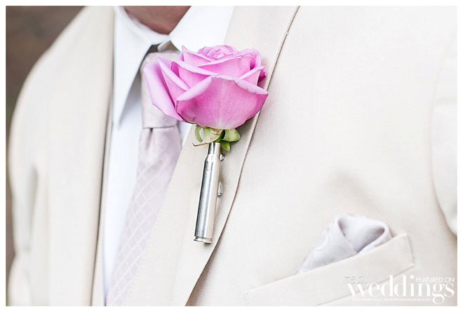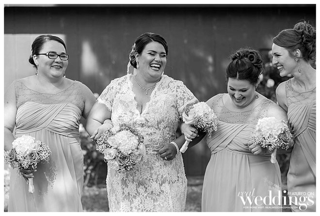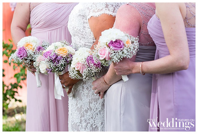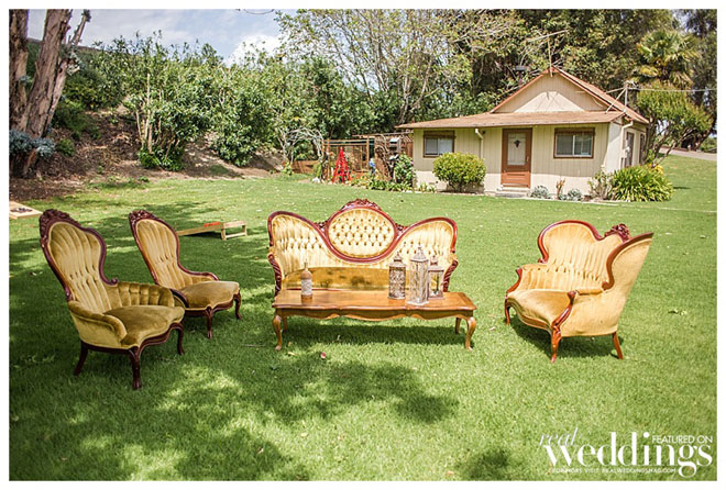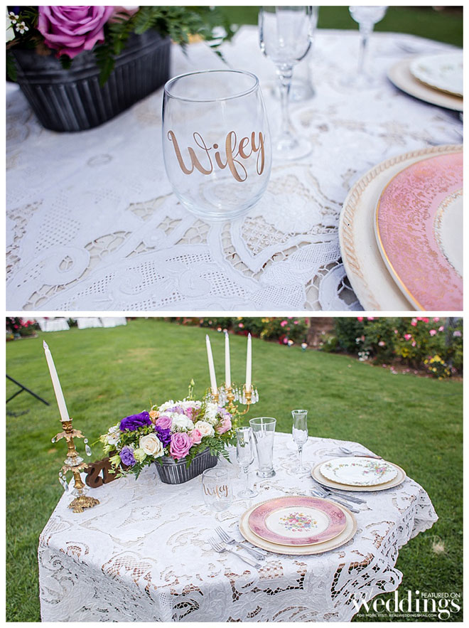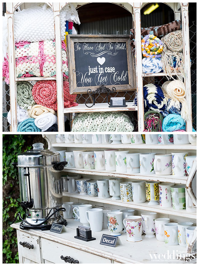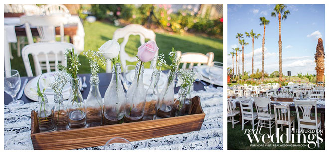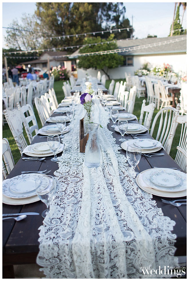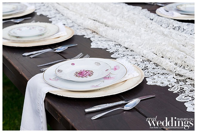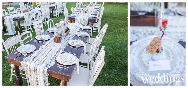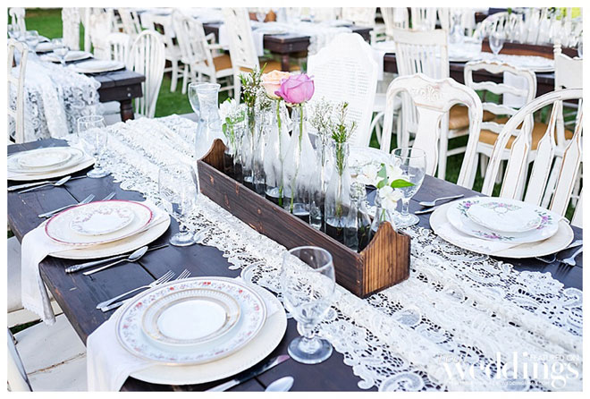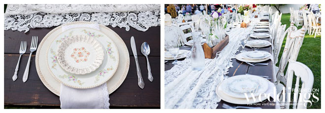 The reception vibe was comfortable. “We had mismatched china, distressed chairs, farm tables simply draped in lace from one end to the other and vintage sofas for seating in our cocktail area,” says Andrea. “I love simple, understated décor.”
