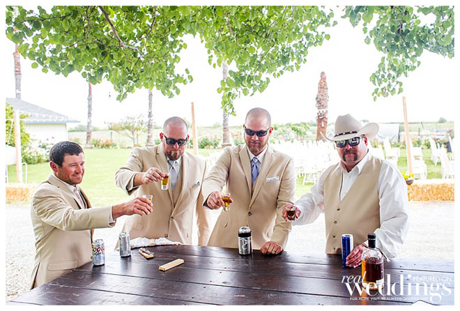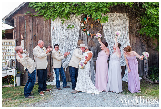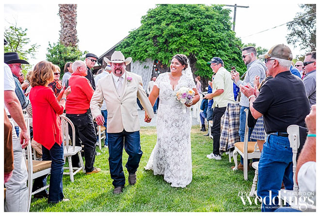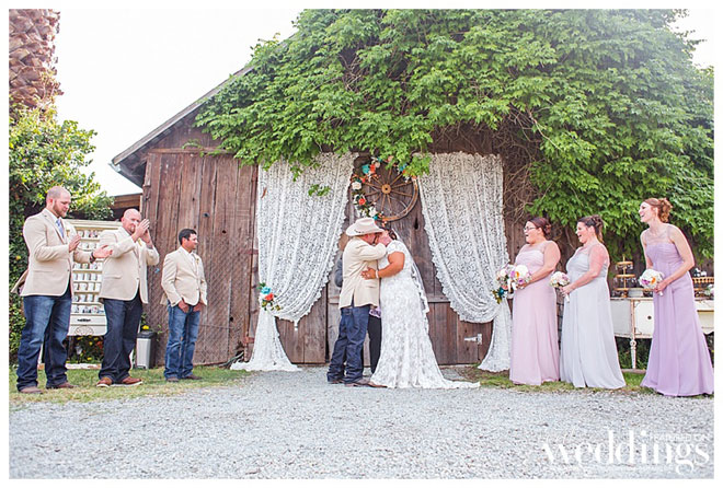 The outdoorsy duo (he’s a hunter and fisherman) got married at their ranch in Isleton—the same ranch where Andrea grew up. “We wanted to have a place where we could get ready and stay the night,” says the bride, noting the spot was also ideal for her father who’s in a wheelchair. The ceremony was short, sweet and very relaxed. The guest list included local guests, as well as guests who traveled from as far as San Diego and Oregon. “Even in front of almost 200 people it felt like it was just the two of us,” says Andrea.