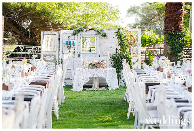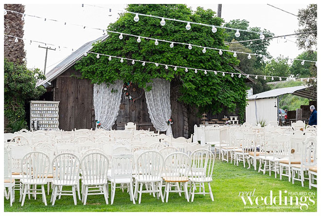 The mother of the bride did some DIY, including decorating the wagon wheel above the ceremony site. Market lights crossed the lawn over the tables.