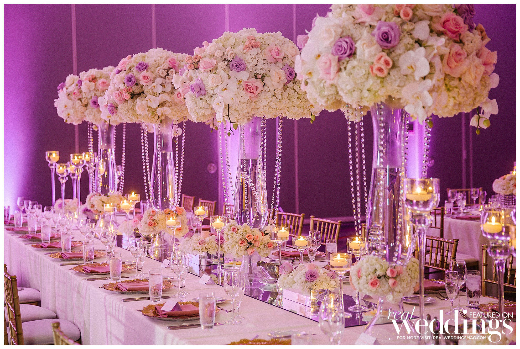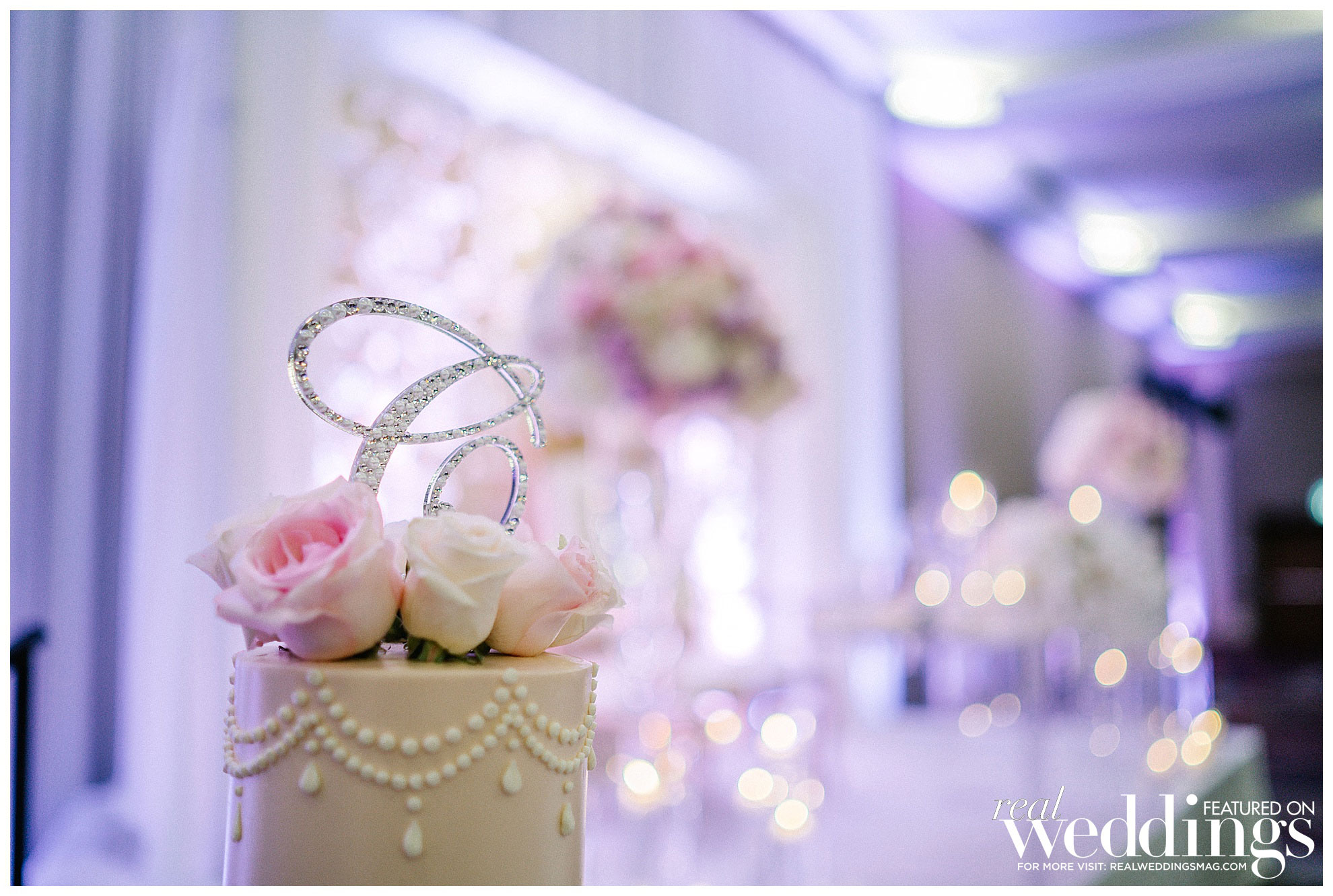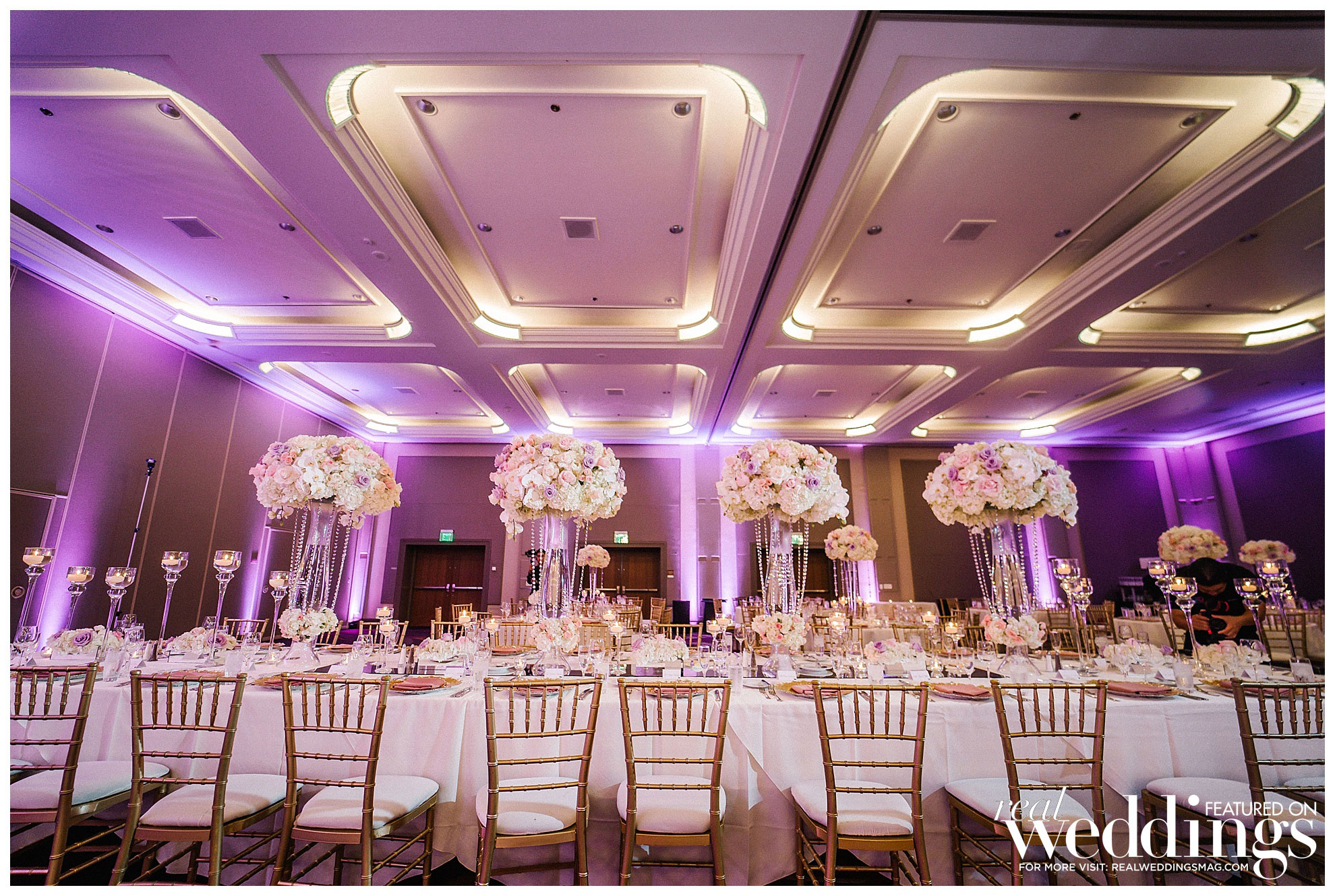 Jason has many favorite moments from the wedding, including exchanging vows, his mother-son dance, watching his grandma dance and his father-in-law’s speech. Jason enjoyed “seeing Angela’s reaction when we had a sneak peek of the decorated ballroom prior to the guests seeing the room.” She loved the look, saying, “I believe the floral and décor really add so much to the wedding reception vibe, and we wanted something elegant and glam at the same time.” Their lavender, white, blush and gold color palette popped for their summer nuptials.