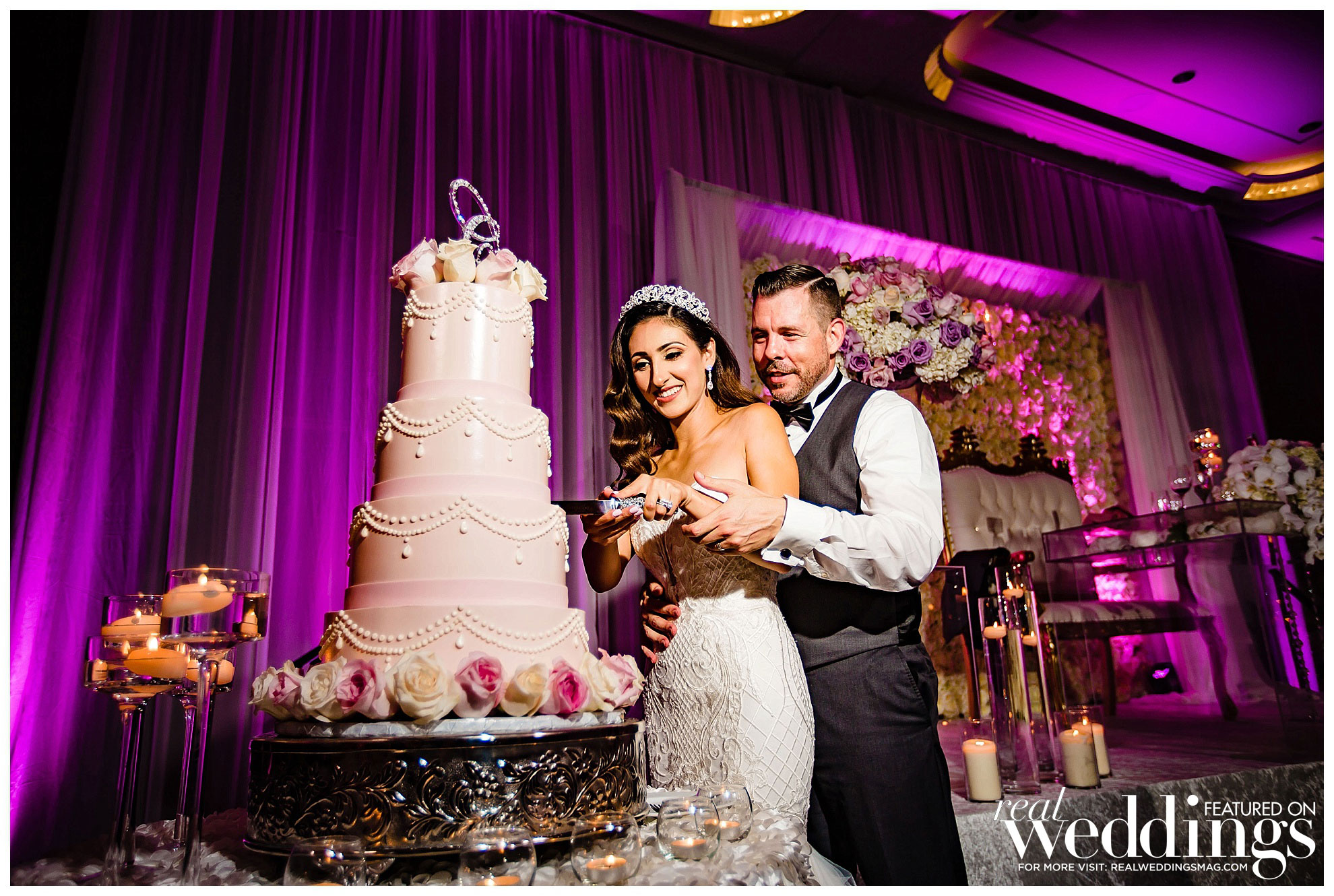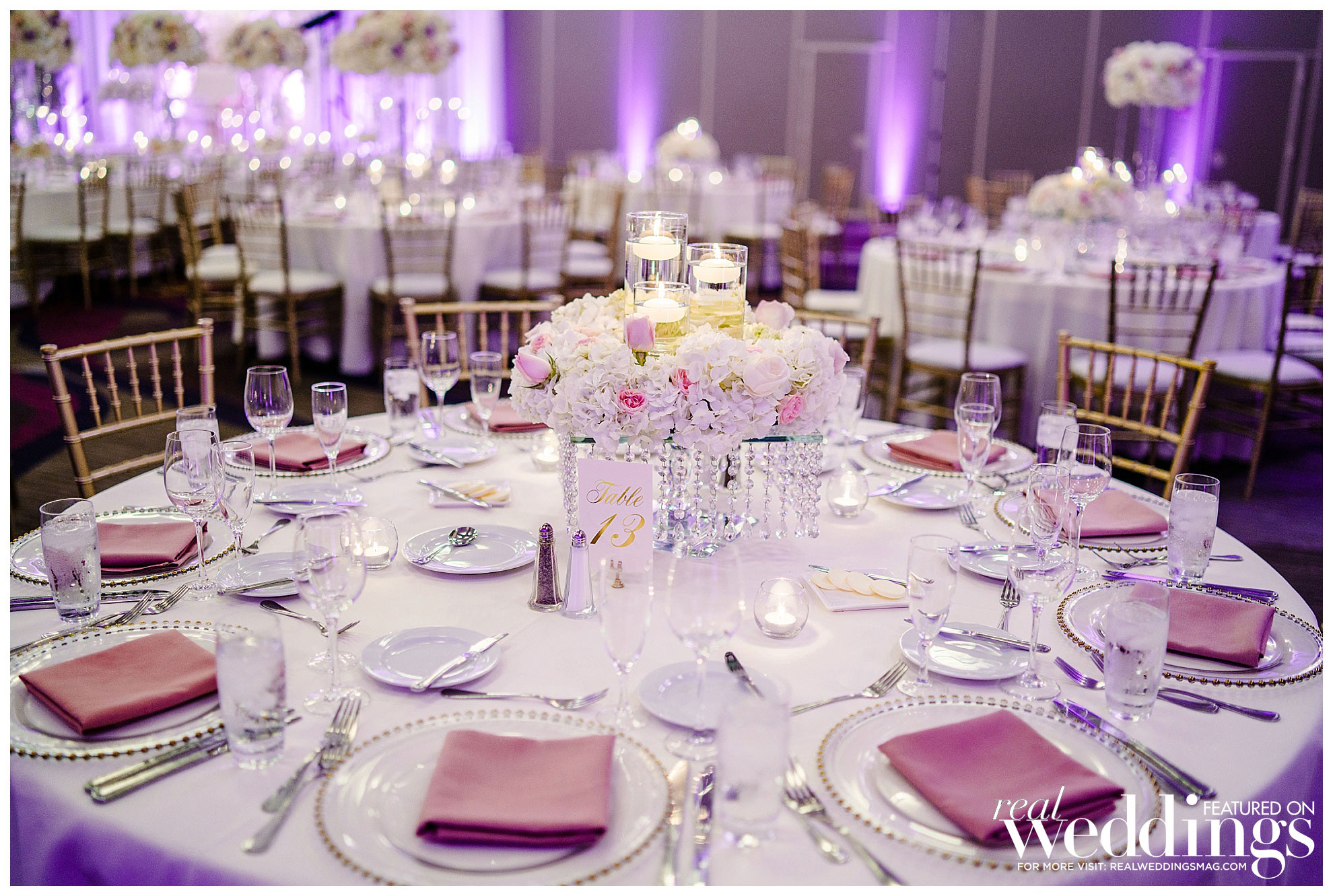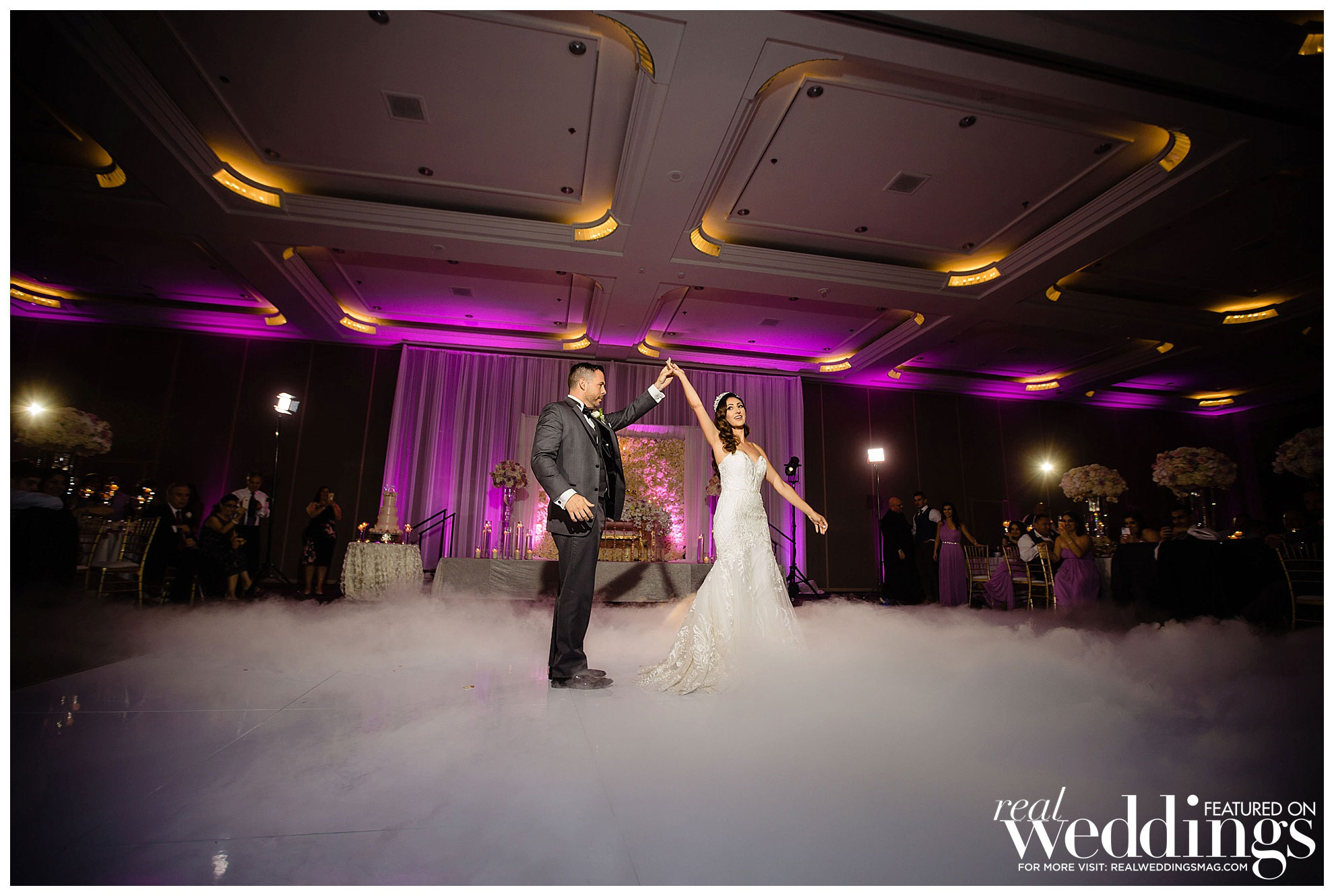 Jason has many favorite moments from the wedding, including exchanging vows, his mother-son dance, watching his grandma dance and his father-in-law’s speech. Jason enjoyed “seeing Angela’s reaction when we had a sneak peek of the decorated ballroom prior to the guests seeing the room.” She loved the look, saying, “I believe the floral and décor really add so much to the wedding reception vibe, and we wanted something elegant and glam at the same time.” Their lavender, white, blush and gold color palette popped for their summer nuptials.